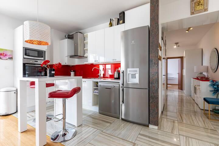 This beautiful apartment in the center of Split has 70 m2, terrace, massage bathtub in the bathroom, air conditioning in every room. The sea is 50 m away. This unique accommodation is located near all points of interest, which makes it easy to plan your visit. The city center and the old Diocletian's Palace are a 5-minute walk away. We have a private garage with 2 parking spaces and you can take the elevator from the garage to the apartment. The apartment is located on the 3rd floor of a new building. Supermarket -300m, Restaurants - 100m, Caffe bar - 50m, Boat trips -500 m The keys to the apartment and garage are located in the key safe on the ground floor of the building. You will receive the code for the safe by email, after you make a reservation.