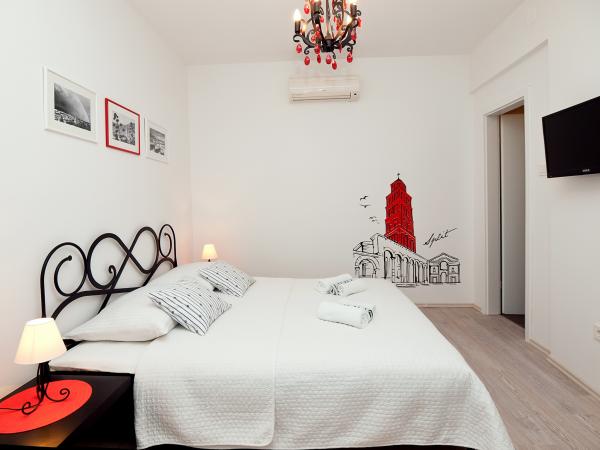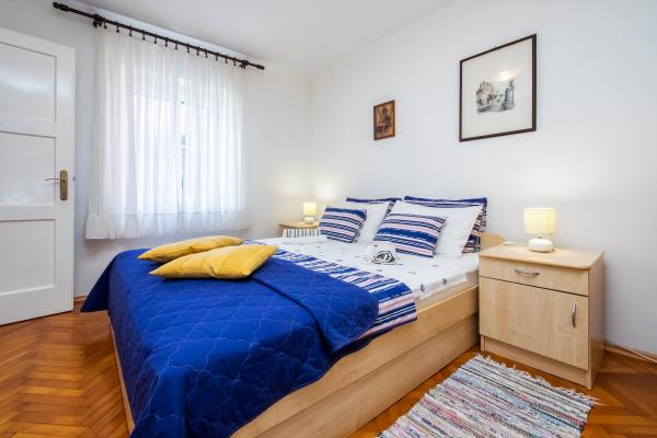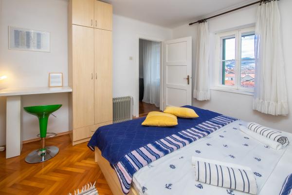 Apartments are located on the ground floor and on the first floor of a typical Dalmatian house, in a very quiet green area, at the foot of the Marjan Forest Park, in the area of the city center called VELI VAROŠ. It's only 5 minutes away. walk from the Diocletian's Palace, the River Port and the sea to the ACI marina. Bus and train station are at 15 min. walk. Apartments are well equipped. The first floor apartment contains: 1 bedroom (16 m2) with large double bed (180x220 cm, with latoflex podnica) 1 large closet 1 small wardrobe, bathroom with shower, kitchen with dining area and bigger extra bed (fold-out sofa , the picture is blue). The ground floor has 2 rooms with bath / ensuite (17m2) with large double beds and wardrobe, LCD TV and mini-bar. More information with pictures on the web site: http: // www. accommodation-jerkovic. com / eng / initial page Other: 3 parking spaces in front (OBLIGATORY PRESENT RESERVATIONS), terrace / yard 70m2, with table and chairs, and fruit garden with fireplace.