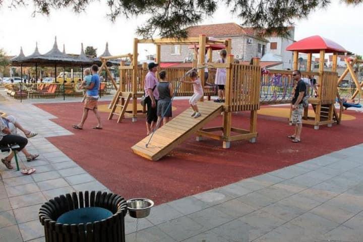 The facility has a free parking space. The center is approx. 200 meters, which is full of cafes and restaurants. There is also a shop, a kiosk selling bakery products, a newspaper kiosk, selling ice cream, a trampoline, a children's playground, a football and basketball court, a bowling alley and other facilities. There you can rent a bank or pay for an organized trip to nearby islands such as Prvić, Zlarina. National park Kornati and Krka are only 20 minutes away by car, and the town of Šibenik approx. 15 minutes.