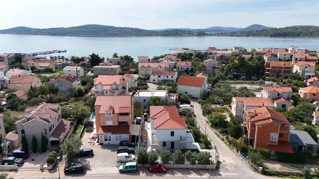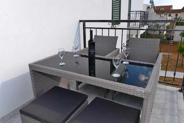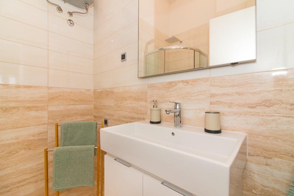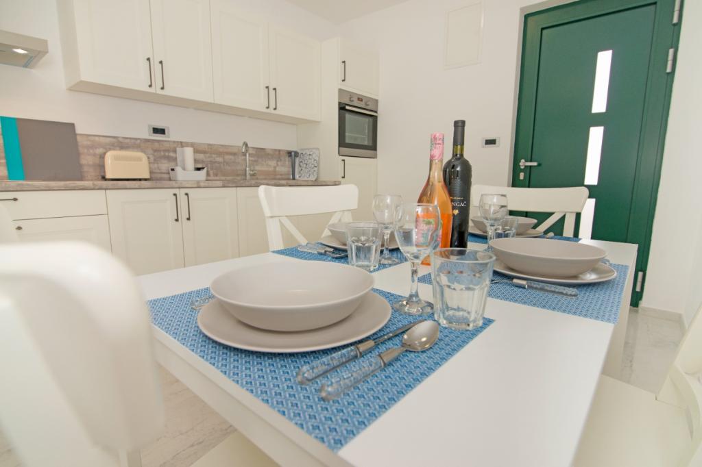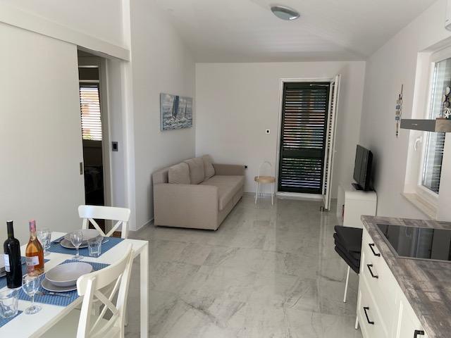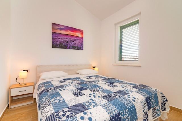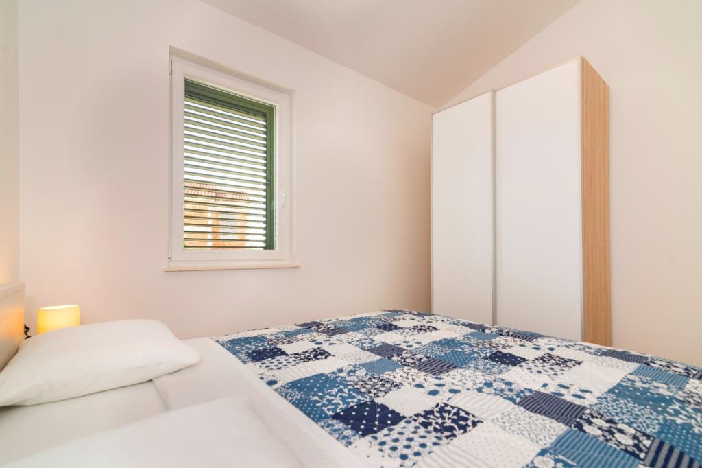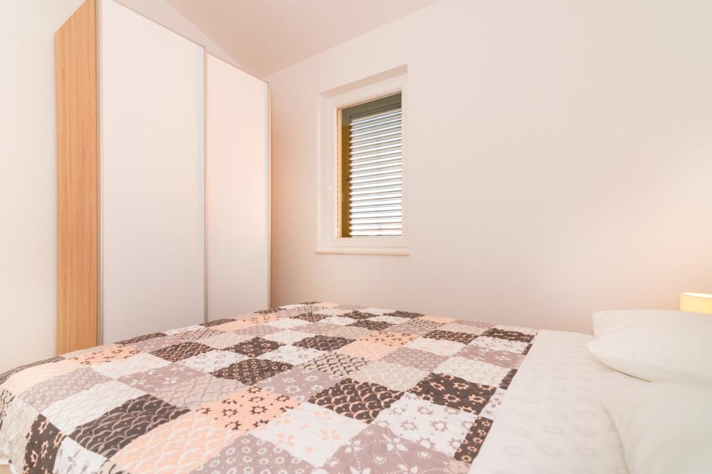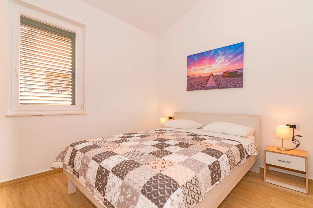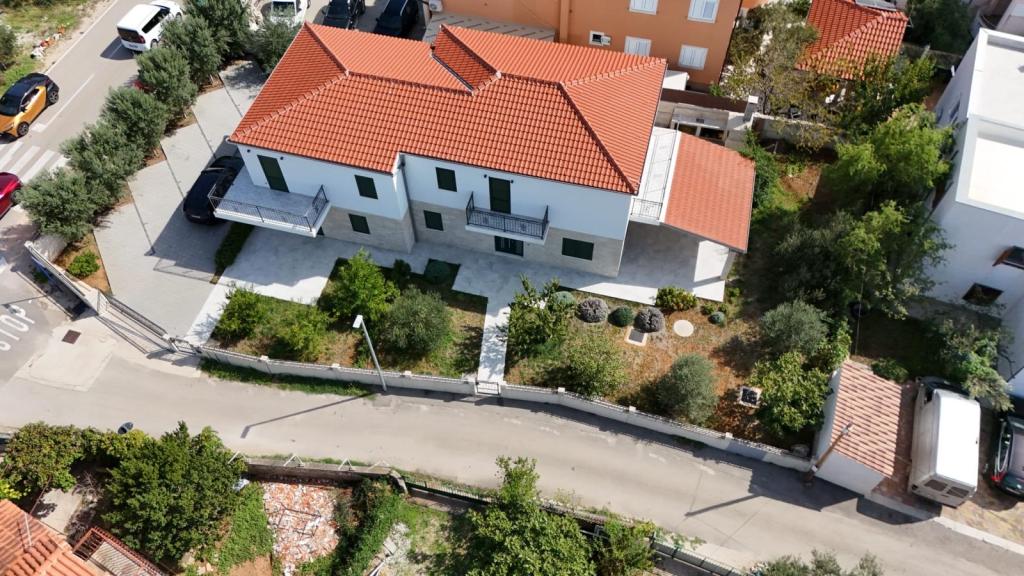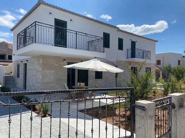 Modern apartments in a quiet place Srima are located 200 m from the sea. Walking down the street you will reach the center where there is a large pebble beach, a promenade along the sea that leads to Vodice, shops, cafes, park, playground and other facilities. Two apartments of the same size consist of two bedrooms, kitchen, bathroom, living room and large terrace on the ground floor and balcony on the 1st floor. Each apartment has a secured parking space in a fenced yard. The spacious, tidy and new ambience of the house will give you a feeling of comfort. The connection with the islands (taxi boat), the proximity of three national parks and the cultural center of Šibenik are additional attractions that will complete the experience of this beautiful lively little place that will remain in your memory.