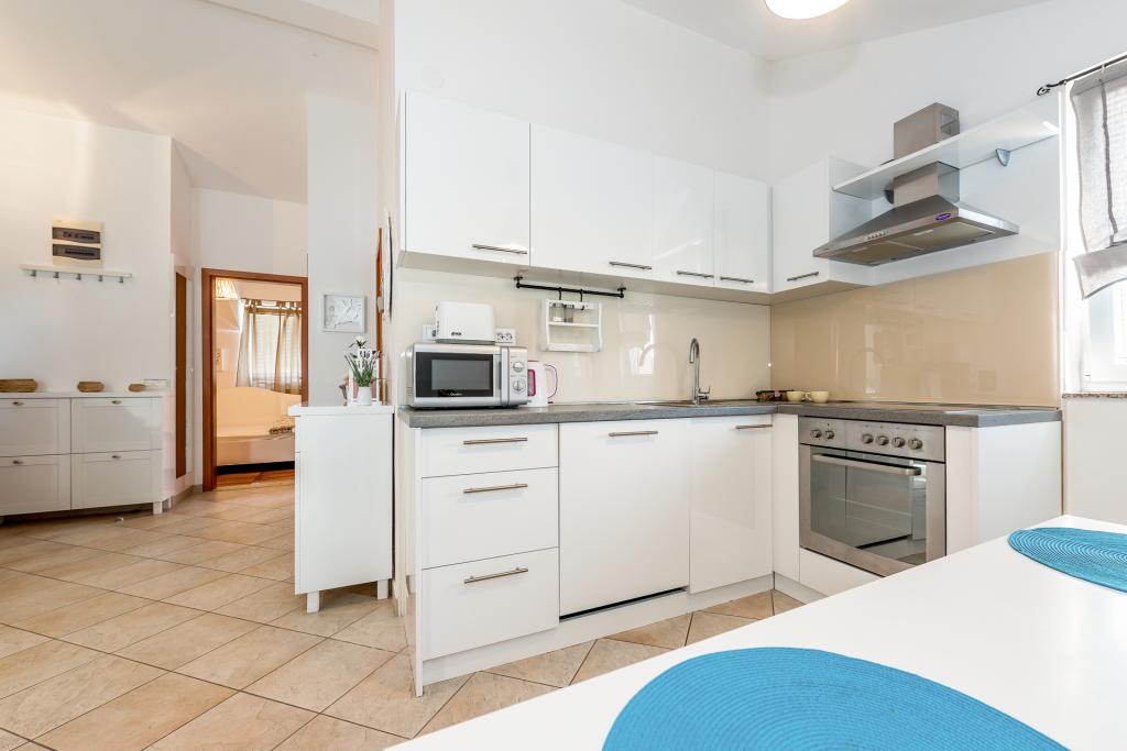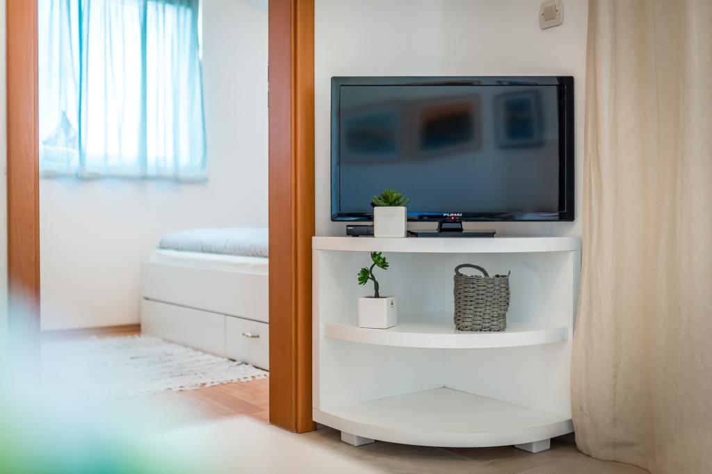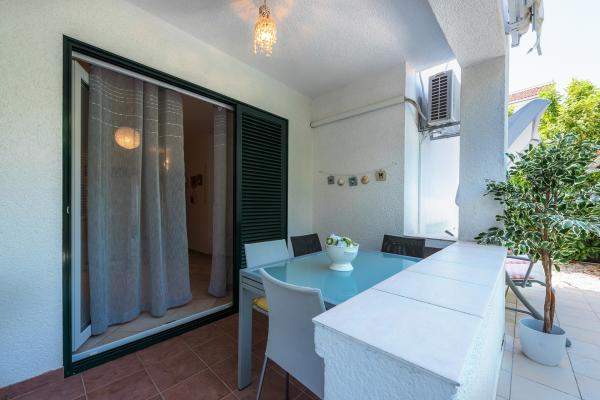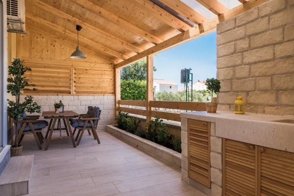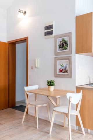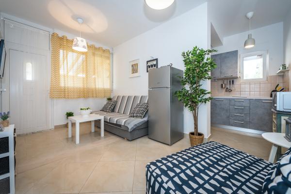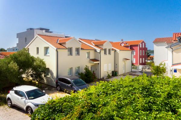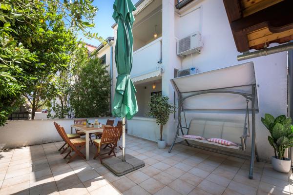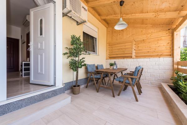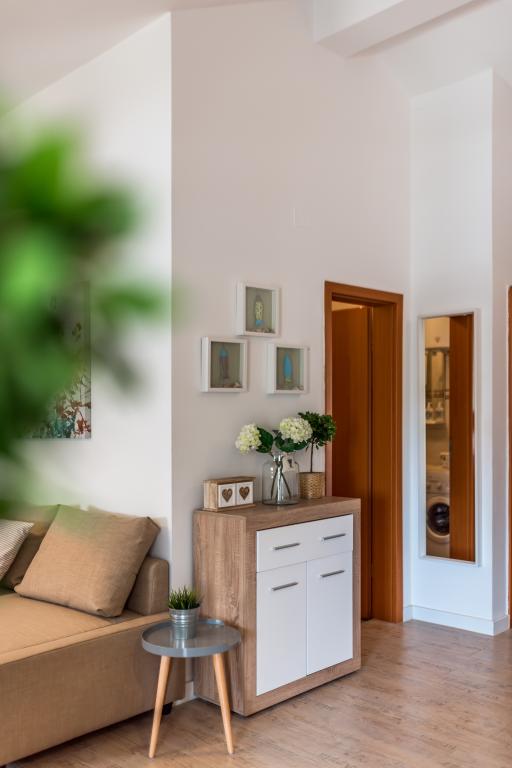 Modernly equipped apartments in Srima near Vodice, located 100 m from the beautifully decorated beach, winner of the Blue Flag. The facility is located 100 m from the town center and a 20-minute walk along the seaside promenade to Vodice. Apartment Karla is located on the ground floor and has a large terrace and a garden of 80m2. In the garden there is a new summer kitchen with a barbecue. The apartment has two bedrooms, a living room, a bathroom, a kitchen, a loggia and a terrace. The kitchen is equipped with all modern household appliances. Apartments Mara, Ana and Ivan are located on the first floor of the facility, measuring 50m2-55 m2. They are decorated with new furniture in a shabby chick style and are extremely comfortable to stay in. They consist of two bedrooms, a bathroom, a hallway, a living room, a kitchen and a loggia. The kitchens are equipped with the latest appliances and the necessary dishes and utensils. Apartment Jo the Star (35 m2); on the ground floor, has a 30m2 terrace with a barbecue and garden furniture