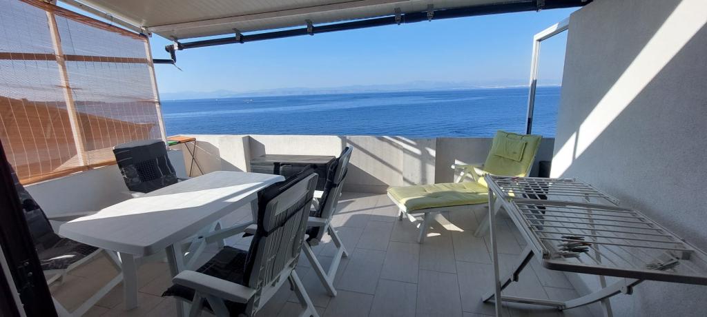 Apartments are located in a private house on the first floor, first row to the sea. The surface of the apartment is 40 (55) m2 (with terrace). They are air conditioned. Number of rooms: 1 bedroom (2 twin beds), living room (double bed) with dining corner, kitchen, bathroom WC, terrace. Number of beds: 4. Free Wi-Fi in the apartments. Parking: secured (possible access by car to the object with the apartments). Distance from apartment to center of Stomorska: 850 m. Distance from apartment to beach: 5 m. Suitable for two families (friends) because the partition on the terrace moves and when it comes to getting a big common terrace. From home to the town center is the paved road that mostly houses the cars that are located there. The road is ideal for cyclists, rides, baby carriages, walks along the sea. The house is far enough from the town center to ensure a quiet stay without the noise of cafes and disco music clubs.