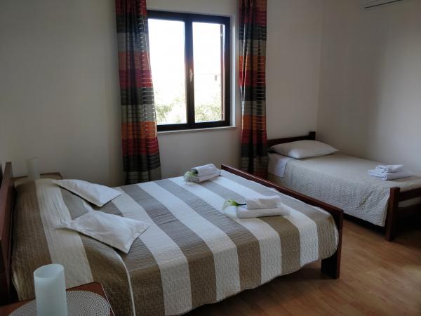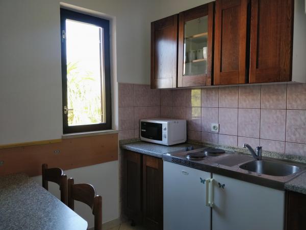 So I would recommend this apartment with all ten of us. There were several families staying there, so I can rate all the rooms. The apartments are cozy and clean. There is air conditioning in each apartment. The kitchenette has everything you need. Pots, pans, glasses, just everything. The owner changed the towels for us, which I consider a big plus. As for the exterior, it was great for us, especially for our children. Swing, trampoline, sitting in the garden, greenery and a large yard. And as for the owner, she is an amazing, kind, helpful and always smiling woman. I have never met such a person in an apartment. I can only recommend her, it was great for us and I believe that we will return there again.