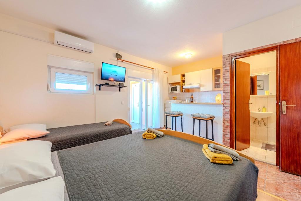 The studio is perfect for a holiday for two. The apartment is in good condition and has everything you need. The sea view from the balcony is particularly beautiful. You can sit comfortably there and watch the sunset. At night you have a wonderful view of the stars. Marin and his family are warm and very nice hosts. They were available to us and helped us with all our doubts. We always felt very comfortable. Sukošan is a small place with beautiful old houses and numerous bathing opportunities. We could also eat and drink coffee. The bus takes you quickly to Zadar and from there to the nearest national park. All in all, we had a great holiday and can highly recommend staying in Sukošan and with Mr. Marin.
