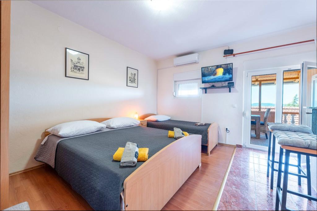 Panorama Capo Apartments are located in a quiet part of Sukošan. About 10-15 minutes walk to the center or the beach. The accommodation units are located on the 2nd floor and can be used individually as 3 separate apartments or as an entire floor. The accommodation unit is intended for max. 8 people and depends on the period. Apartment A2+2 consists of a bedroom with a balcony and a toilet on the east side, and on the southwest side of the kitchen, living room and a large terrace with a beautiful view of Sukošan, the sea and the islands. Studio+1 is intended for 3 people. It consists of a room with 2 beds, toilet, kitchen and part of the terrace with a view of the sea and the islands. The third is a smaller Studio apartment with a balcony, intended for two, oriented to the west and is ideal for romantic couples. If you want a quiet family vacation with recreation in nature and at sea, you will feel satisfied here. The host is at your disposal and available if needed. Welcome dear guests!