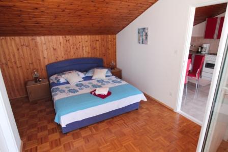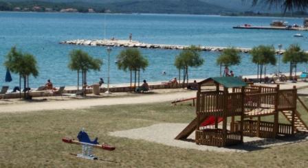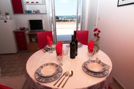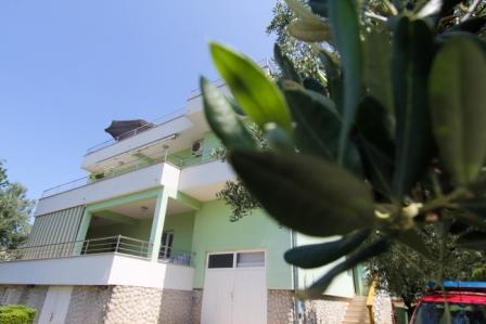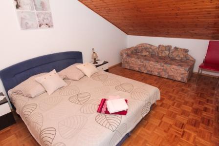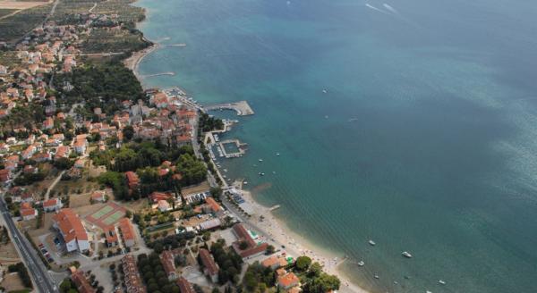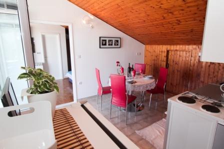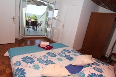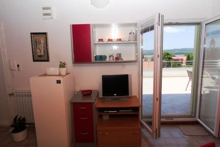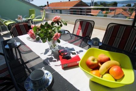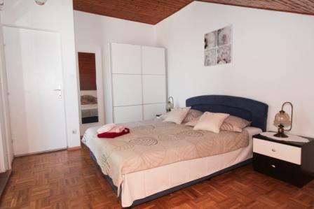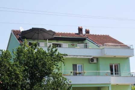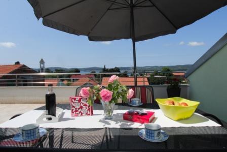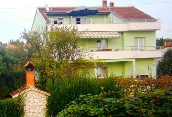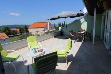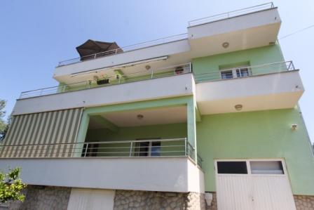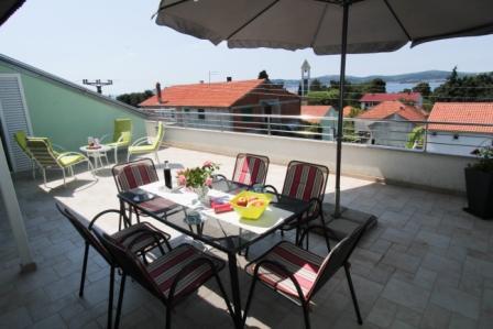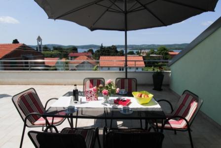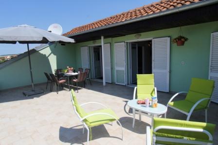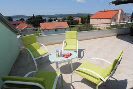 Two bedroom apartment with a large terrace and beautiful view in the center of Sveti Filip i Jakov area of 120 m2 total (65 m2 surface of the apartment, 55m2 surface of terrace-balcony). The two-room apartment has two bathrooms, kitchen with dining room and living room (all in one), hallway (entrance into the apartment). The apartment is part of a family house and consists of one storey (one floor) with a separate entrance to the apartment. Parking is located within the building as well as a barbecue (grill), a large yard and a trampoline for children. Beach, sea, waterfront, restaurants, pharmacy, post office, playground, promenade .... everything is located a few minutes walk from the apartment.
