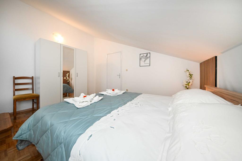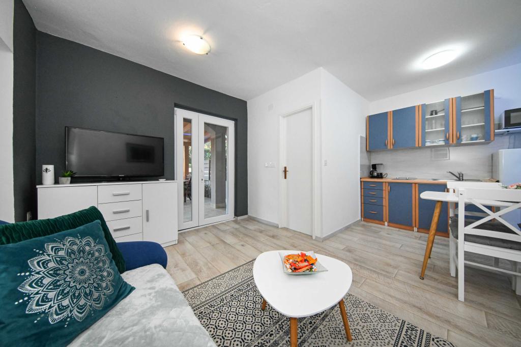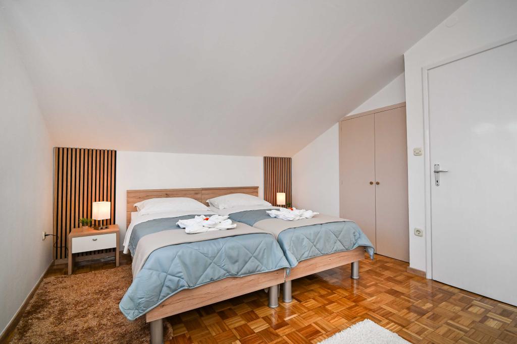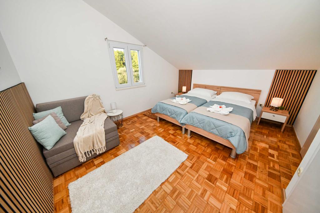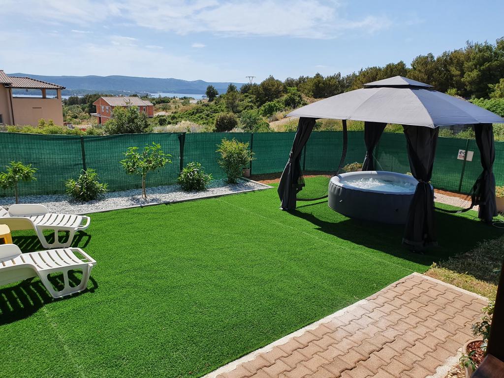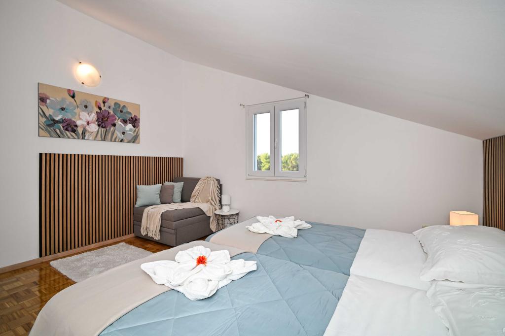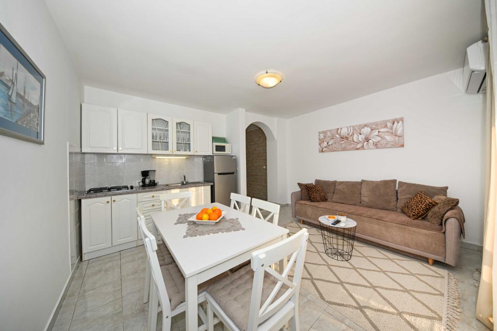 Give us the opportunity and your unforgettable holiday you will experience just by us. In our apartments superbly landscaped near the pine forest and the sea your vacation will be complete. The promenade and the nearby lookout, bike paths, close to Vrana Lake Nature Park, and the National Parks Kornati and Krka waterfalls, ancient towns of Zadar and Sibenik, will surely meet the expectations of the most demanding guests. Our complex is the size of 2500m2, surrounded by olive trees and pine forests. From the courtyard there is a nice view of the sea-Pasman Channel. In the complex there is: • Family house, where there are two separate apartments (for 4 and 6 people). • Apartments are equipped with air conditioning, TV, Wi-Fi and terraces overlooking the sea and swimming pool. • Pool: Next to the house is a swimming pool with beautiful surroundings and sun loungers • The pool is located, there are two bathrooms with showers and two bathrooms, separate space for laundry, which is Opremjen with a washing machine and tumble