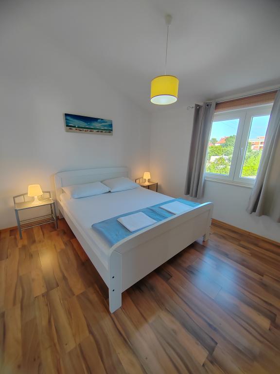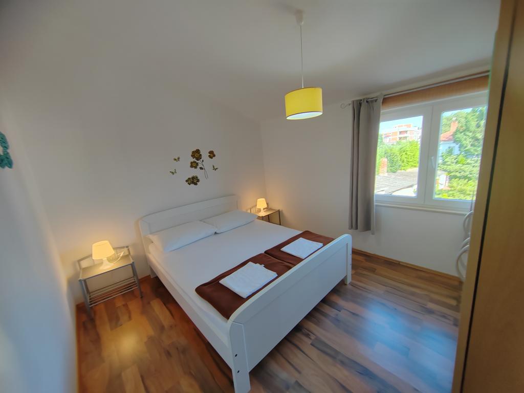 Near the center and the beach (150 m). Two apartments are located in a family house (on the first floor) which is 150 m from the beach and the center of the town. Each apartment has two bedrooms, a bathroom, a washing machine, air conditioning, a kitchen with a dining area and a sofa that is an extra bed, a large terrace (20m2). Everything is included in the price. There is a grill in the garden. Parking is located in front of the house in the shade. The size of the apartment is 70 m2.
