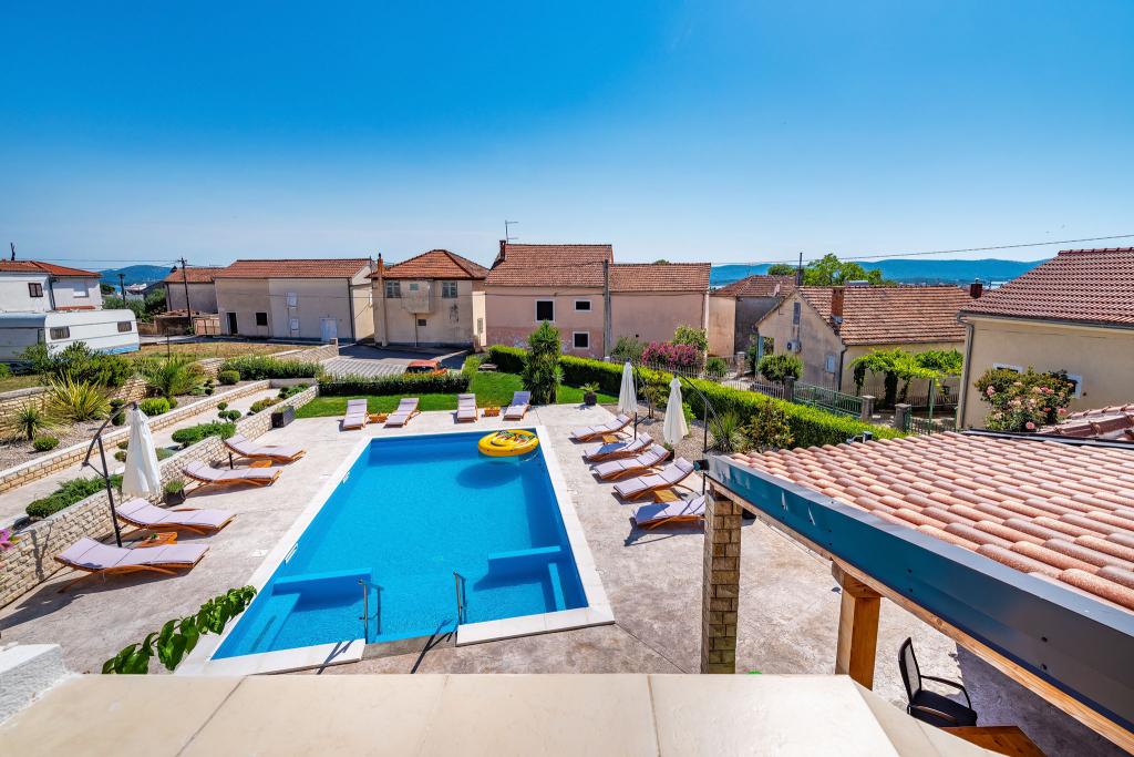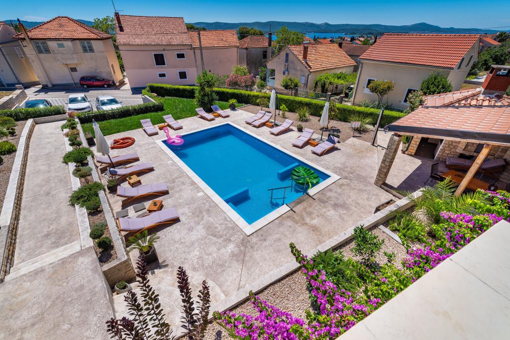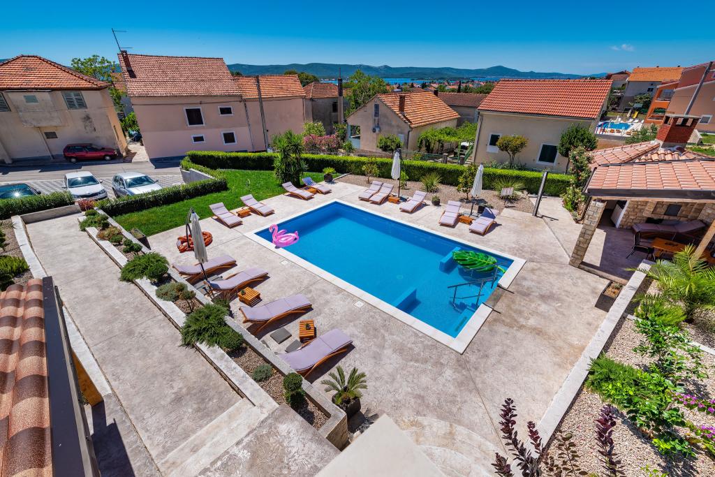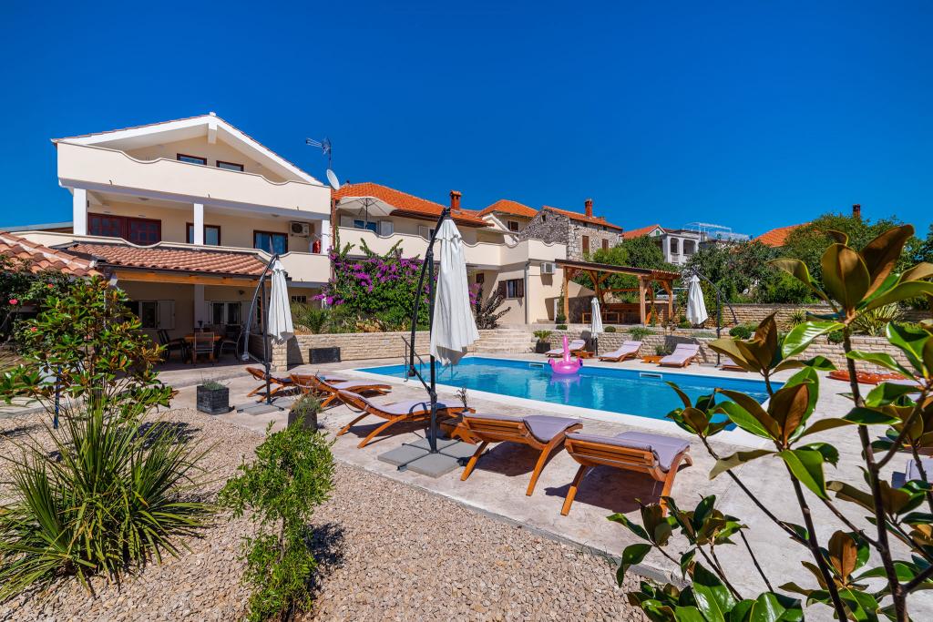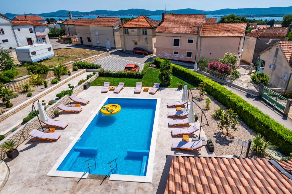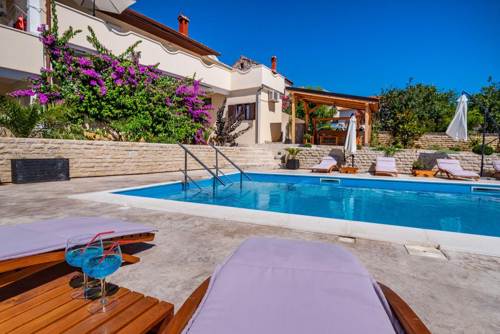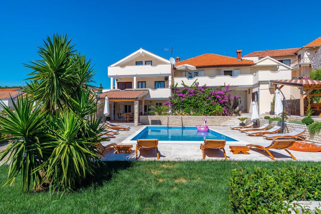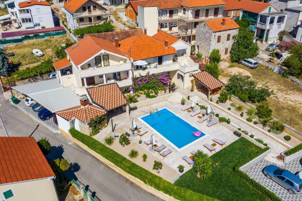 Merita Apartments are located in the village of Sv. Filip i Jakov along the Adriatic Highway, near the sea. In the yard is a pool size 9 x 5 with Jacuzzi, Large area around the pool where there are deck chairs with umbrellas. Grill house with a large table next to it. Covered parking Fully decorated, equipped and air-conditioned apartments with sea views. The facility is located 5 minutes walk to the beach. In the immediate vicinity of the building there is a shop.