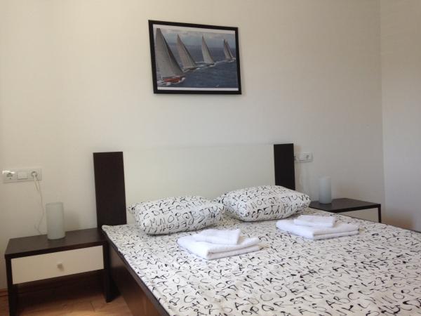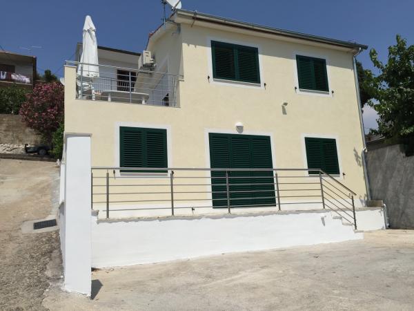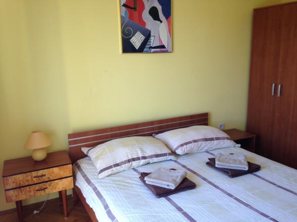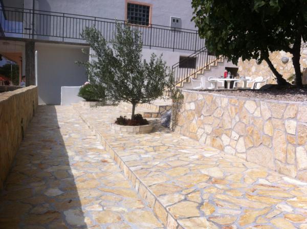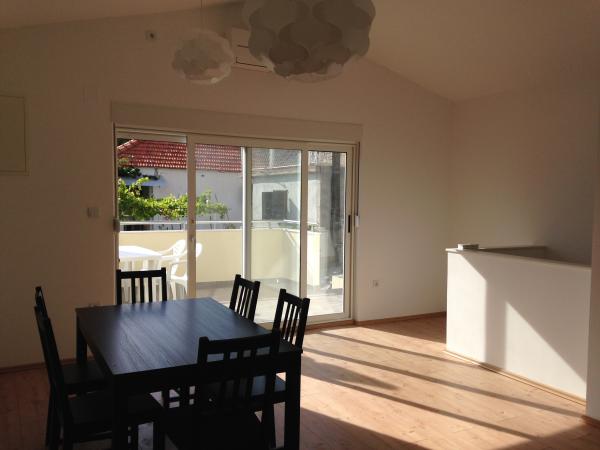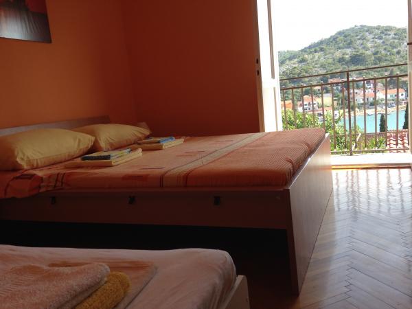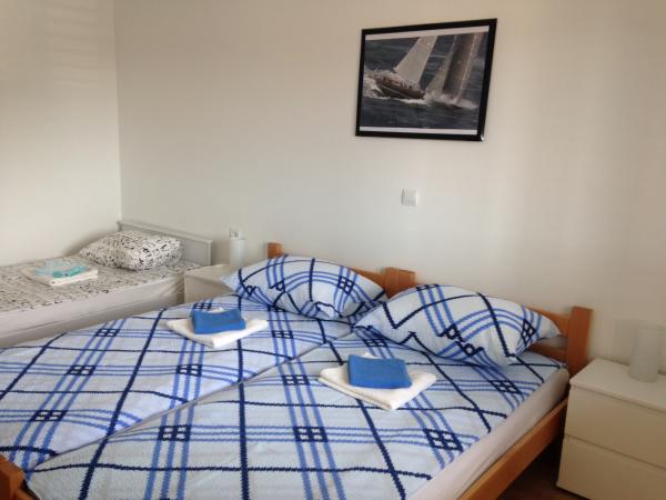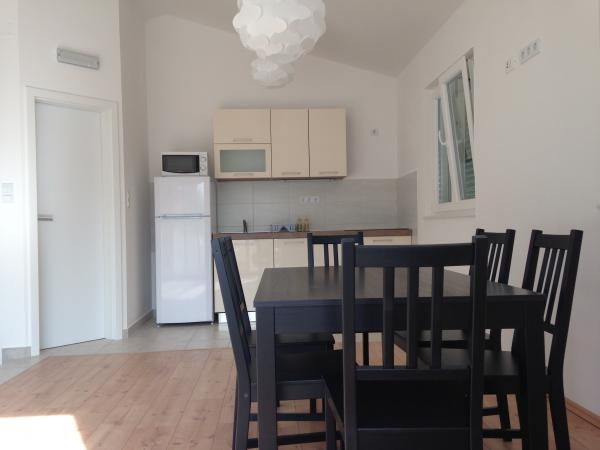 This spacious apartment is on the first floor of the house and has a separate entrance. It consists of three bedrooms (two double and one triple), living room (possibility of beds), kitchen and dining area and bathroom. All three rooms are connected by a balcony with a beautiful view of the sea and islands. The apartment has a spacious terrace. We offer barbecue. Parking place for 2 cars.