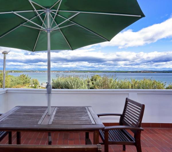 Modern apartments on island Pašman only 20 meters away from sandy beach and sea! Cosy, spacious and relaxing. Parking in the shade, wireless internet and A/C included in price. Apartment Tkon Rutak I (A4) has the ability to accommodate 5th person with surcharge.