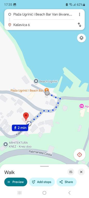 Fully equipped apartments in the quiet and picturesque town of Ugrinići, only 100 m from the beach. Ideal for a vacation without crowds and noise. There is only a cafe in the village. Other contents are located about 2 km away from the Tkon ferry port.