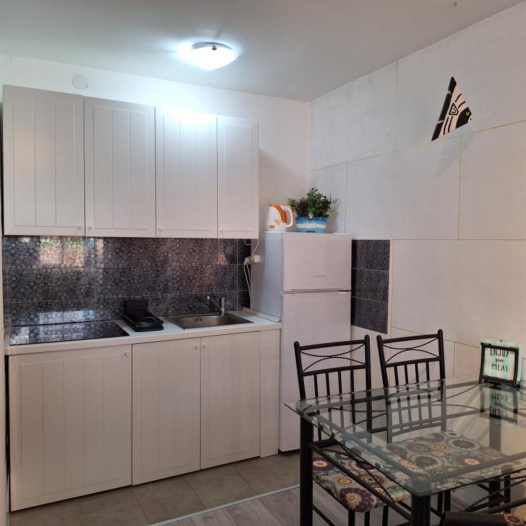 Besides the fact that you are located in a hidden and quiet corner of a beautiful little fishing village, when you cross the threshold, you will be greeted by unusual decor and a sense of playfulness that will make your stay truly unforgettable. Sail into vacation with colorful playful fish that sail from room to room, and each piece of furniture has its own story. From the bedroom window you can see and smell the laurel trees. From the living room, where there are comfortable extra beds, you can go out to the terrace where you will have complete intimacy. While the air conditioning cools you down, embark on a culinary adventure in the fully equipped kitchen. You can socialize and dine on the outdoor terrace in the thick shade. Of course, your tin pet has a guaranteed place, right next to our newly furnished apartment.