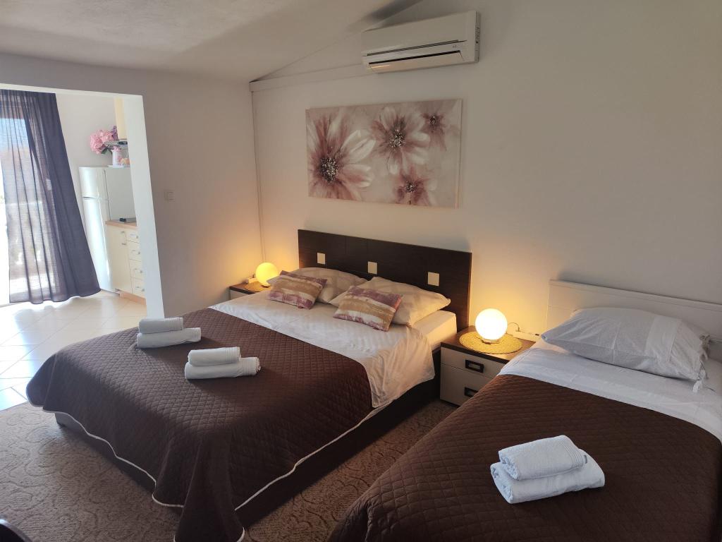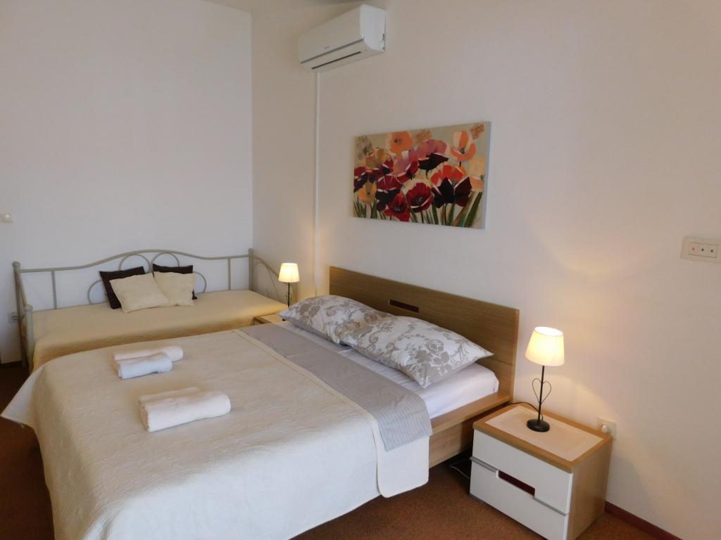 Apartments/OPG Grubelić include two separate houses located next to each other. They are located near all important facilities (shop, beach, town center) and are ideal for a family vacation. The houses are divided by the entrance to the yard with a large, free parking lot for 6-9 vehicles, as well as a landscaped garden with a barbecue and a closed terrace that can be used by guests from both accommodation facilities. Object 1 is rented entirely to one group, and consists of two air-conditioned bedrooms, one of which has a kitchenette, private bathroom and exit to the terrace. A Smart TV is installed in the second room. The apartment has a large, fully equipped kitchen and an air-conditioned living room with two sofa beds and a TV. Object 2 consists of several studio apartments and apartments with two bedrooms. All apartments have a balcony that is protected from the sun (the exception is apartment A2, which does not have access to the balcony). The facilities are located 2 minutes' walk from the first store, and 5-10 minutes to the beach/center.