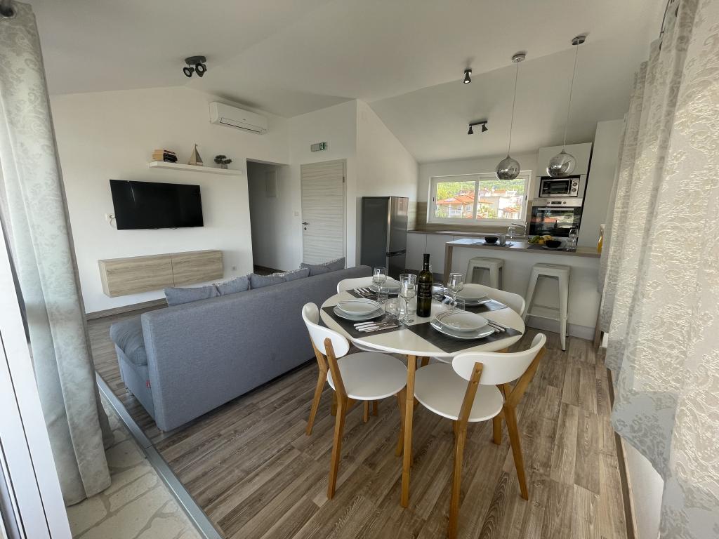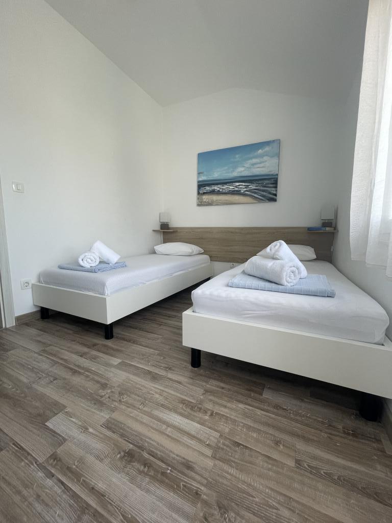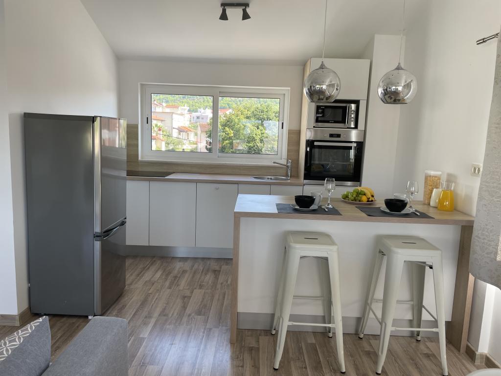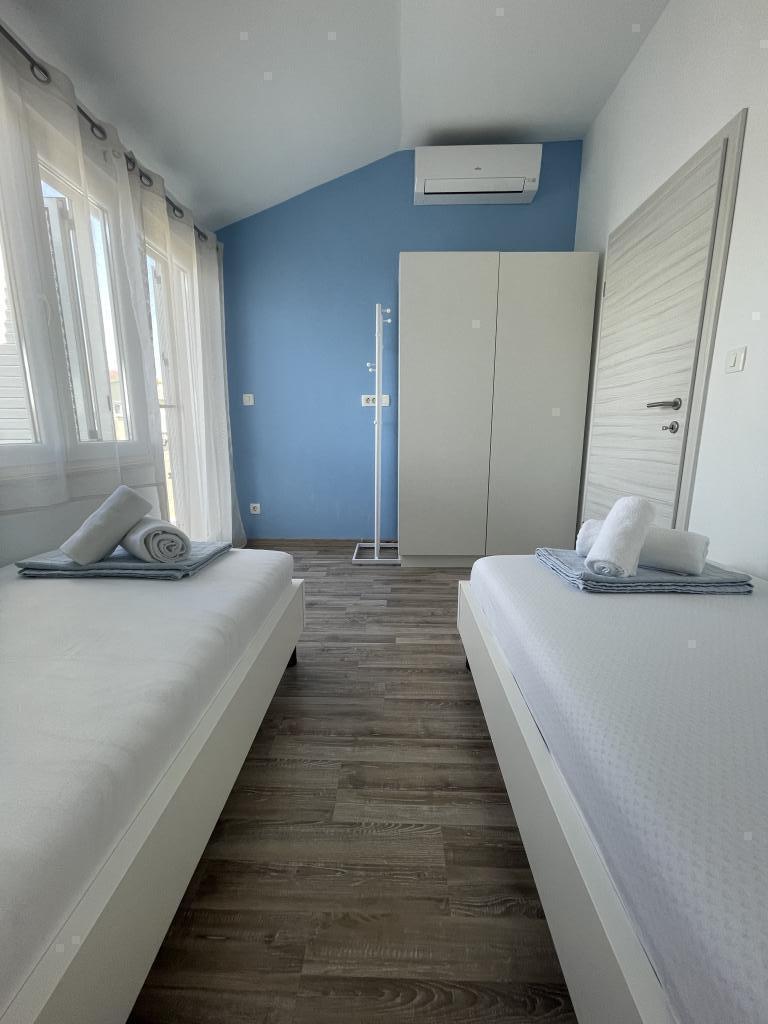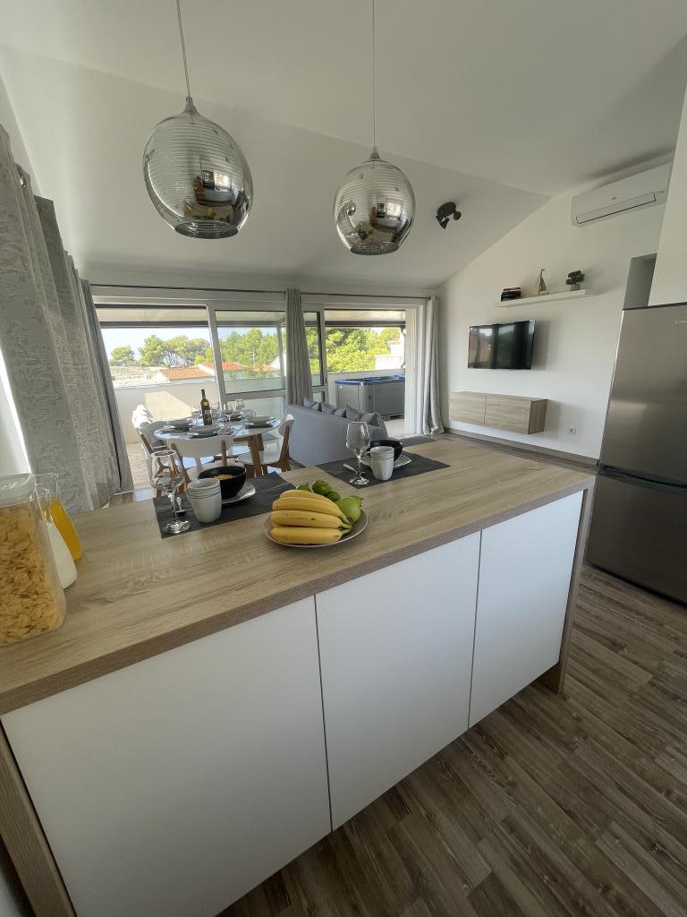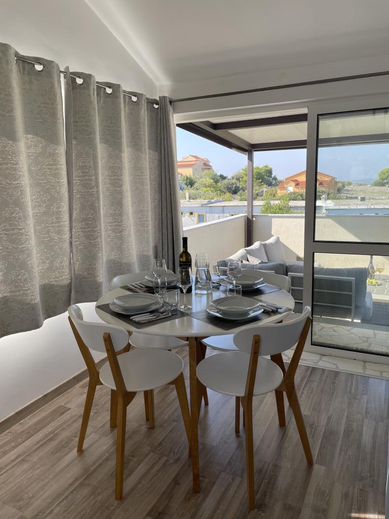 Fully and modernly equipped apartments in a quiet area, located only 300m from the beach with many facilities. The apartments are located on the second floor of the family house, in the fenced yard you can enjoy a covered area for socializing with a summer kitchen and grill. Private parking is located in front of the yard. There is a bus stop 50m from the house, and the first shop 200m from the house. The town center is 800m away, you can reach it by road or by the promenade that stretches along the sea. We love animals, but we are not pet friendly.