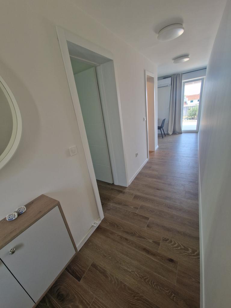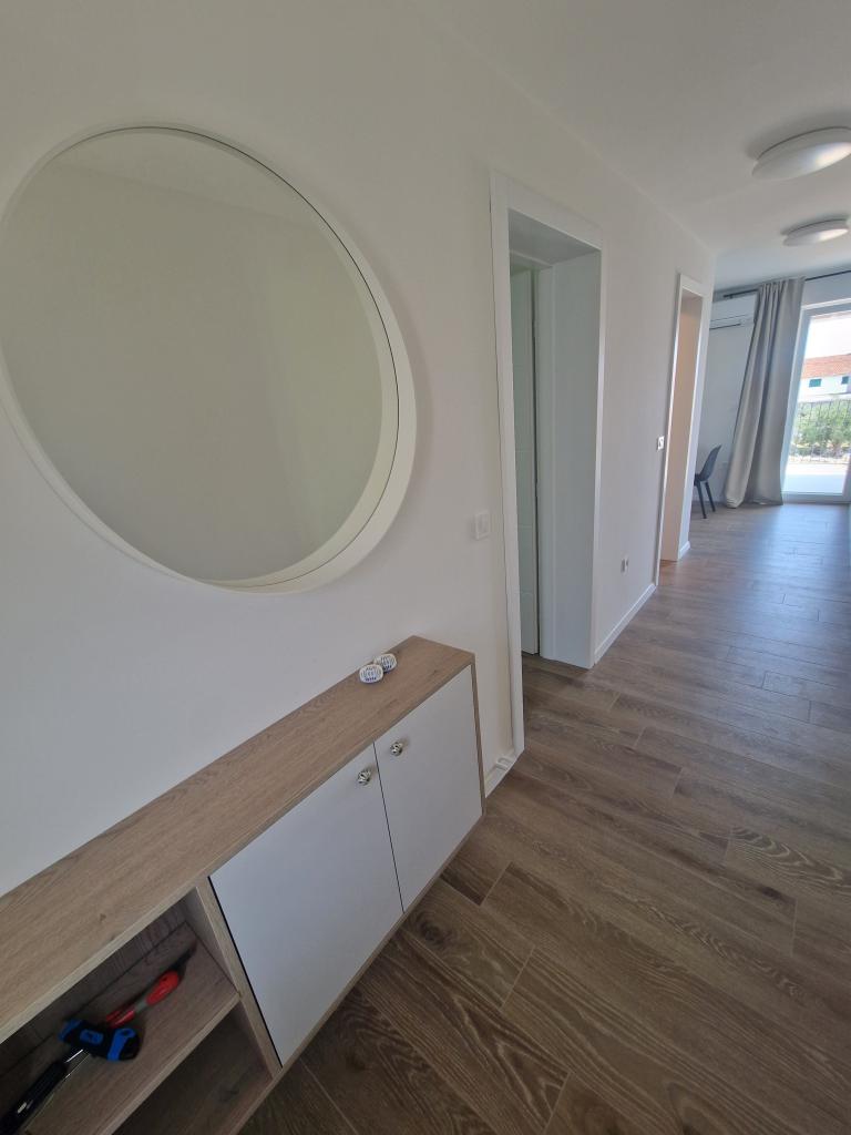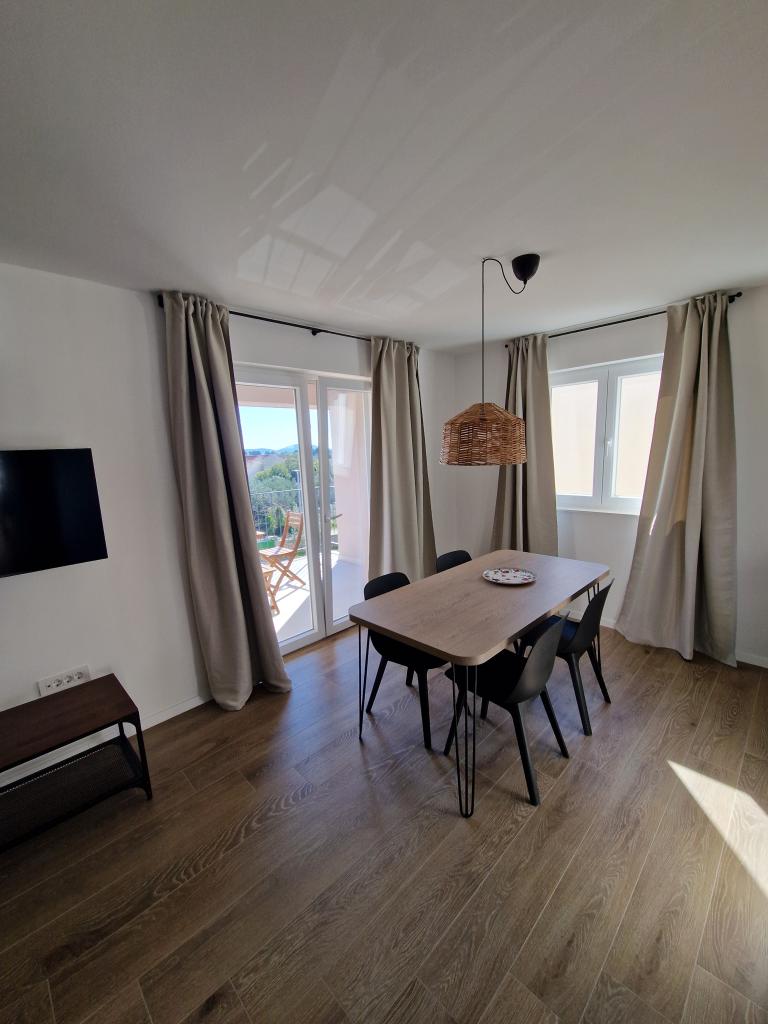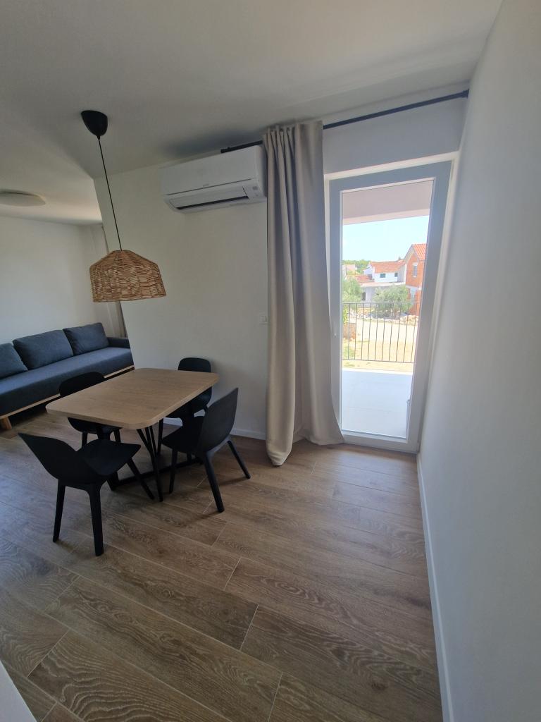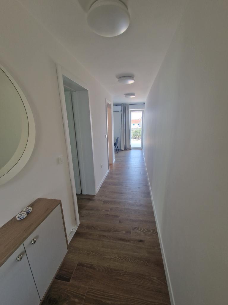 Apartments Tribunj Cvitan are fully and modernly equipped. The facility is located in a quiet street in Tribunj (Sovlje). The apartments are on the 1st floor, which is accessed by a separate external staircase. Parking is provided for apartment guests, and the entrance to the facility is fenced with an automatic entrance gate. The facility is located a 5-minute walk from the sea and next to several good nearby beaches in the area, and the closest to the facility is the Sovlje Beach. The apartments have one room with a double bed, and one extra bed in the dining room. In the bedroom, there is a bedside table with lighting next to the bed, and large wardrobes. The kitchen is equipped with all necessary elements, including dishwashers. Also, the apartments have large semi-covered balconies that are facing east most of the day from dawn, so you can relax in the sun on the balconies almost all day. The bathrooms are modernly decorated with shower cabins. The apartments have TVs in the dining rooms and free Wi-Fi