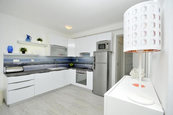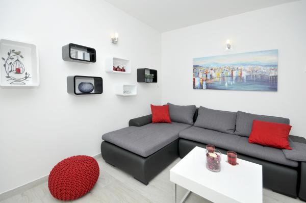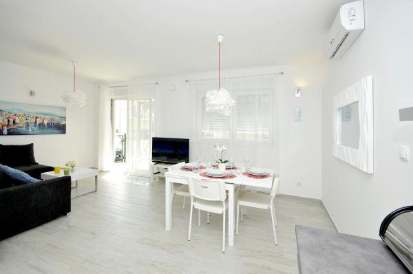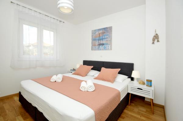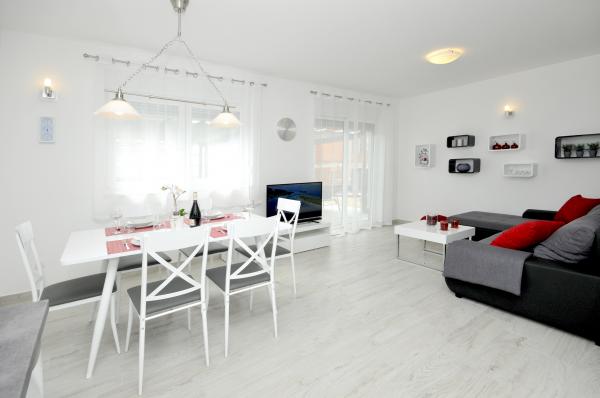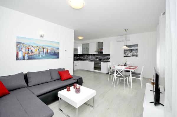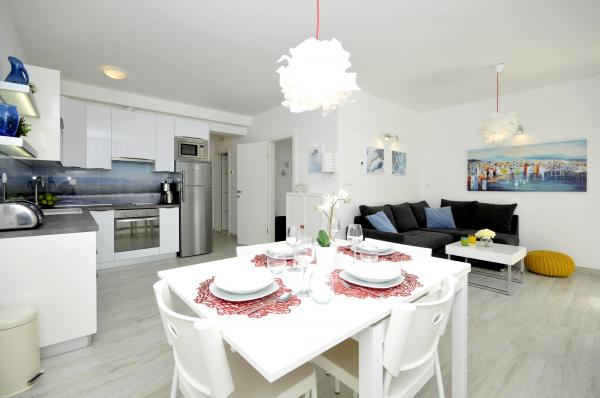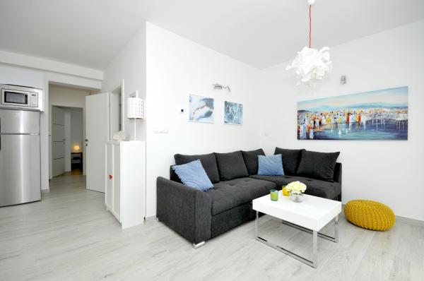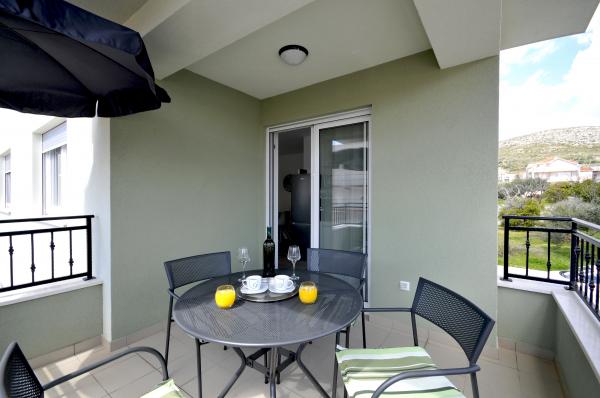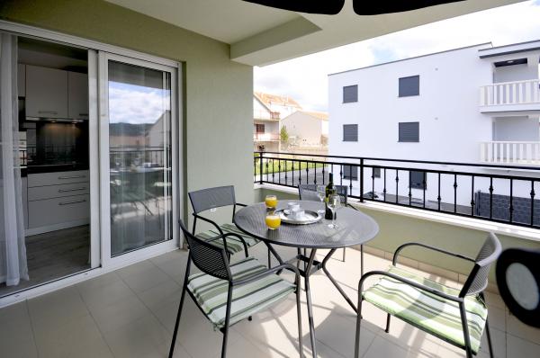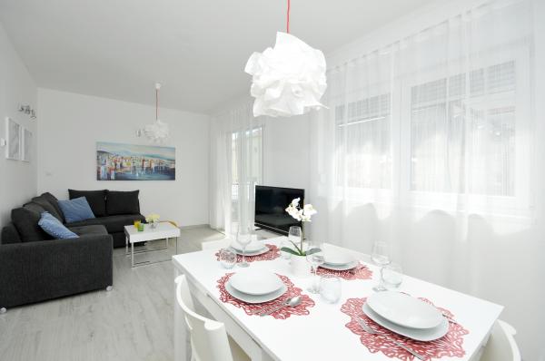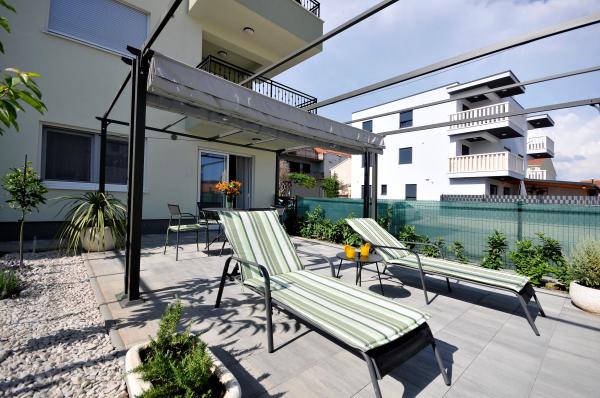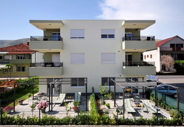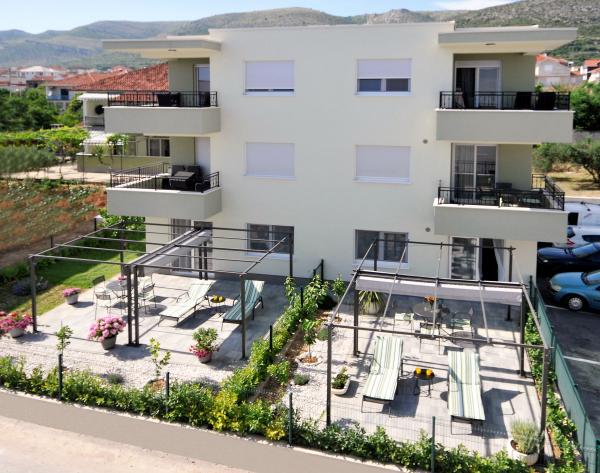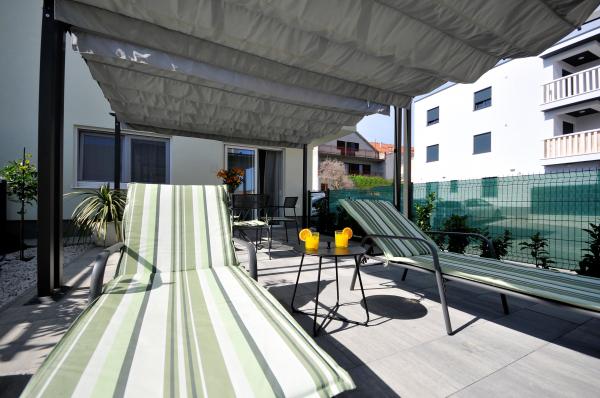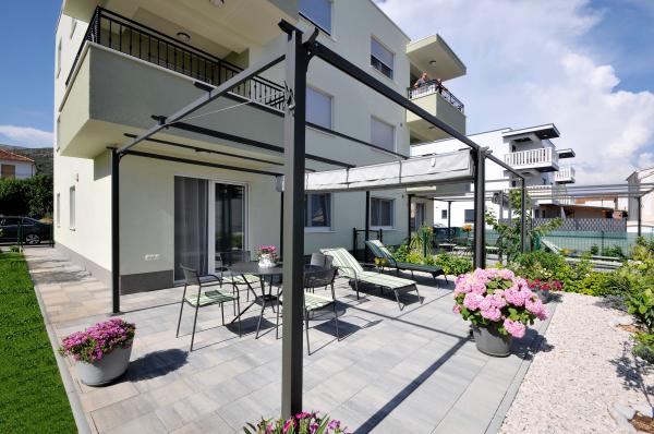 Apartments Town Trogir are located on the mainland of Trogir in an excellent location, only 400 m from the center of the old town, and 900 m from the new town beach. The mentioned beach can be reached by a promenade along the sea. All the main facilities are accessible on foot, a 5 to 10 minute walk. Apartments Town Trogir are new and are located in a smaller residential building with 6 apartments. The apartments have an area of 50 to 60 m2. The apartments are located on the ground floor. The apartments are modernly decorated and fully equipped. The apartments have 2 bedrooms, living room with dining room, fully equipped kitchen, bathroom, and large terraces with garden furniture on the ground floor. Free parking is provided in front of the building. Bed linen and towels are included. WiFi is free. Tourist tax is included