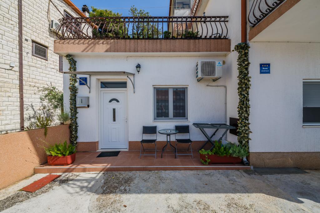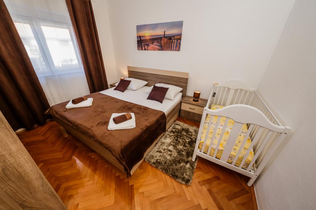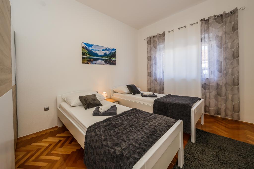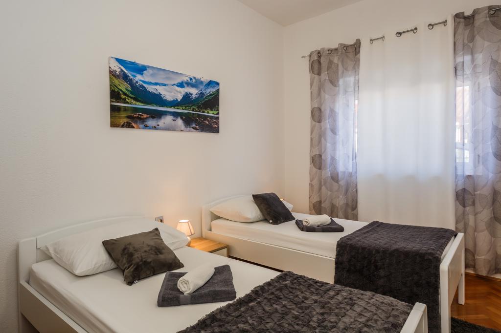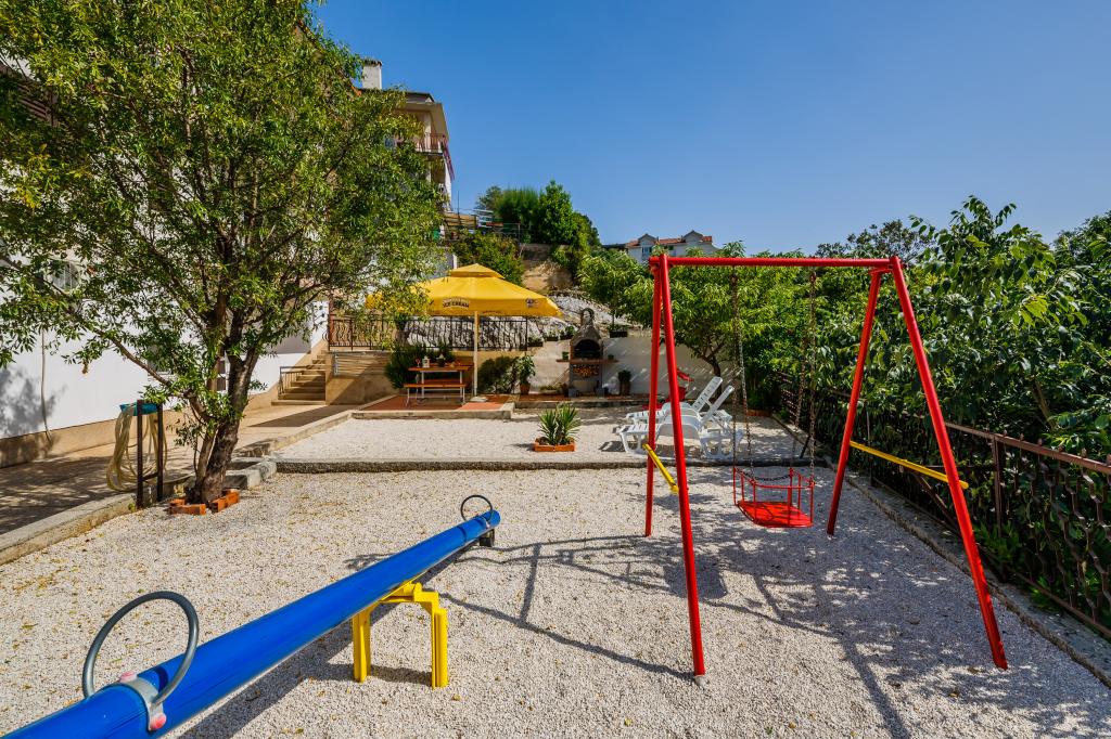 The apartment is located on the island of Ciovo, 300 meters from the town center and 600 meters to the beach. The apartment is fully equipped with two bedrooms, living room, kitchen, toilet. Size 75 square meters, includes Wi-fi, air conditioning, two LCD, satellite TV with 500 channels. The apartment has a terrace with garden, children's playground (slide, seesaw, swing), grill and Trogir. Free parking is located near the apartments.