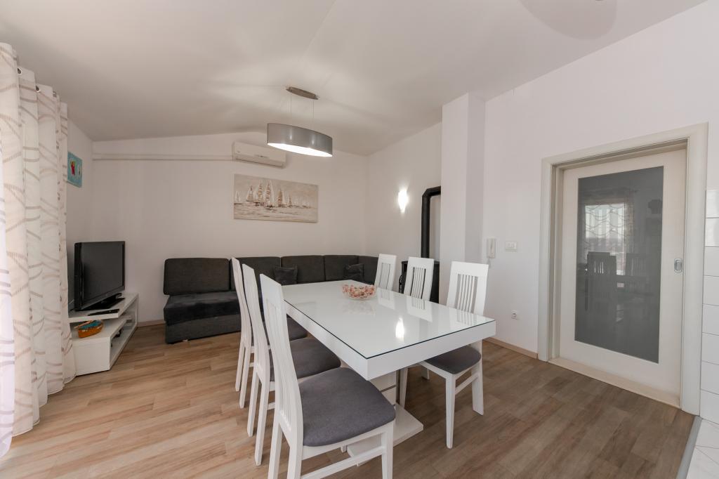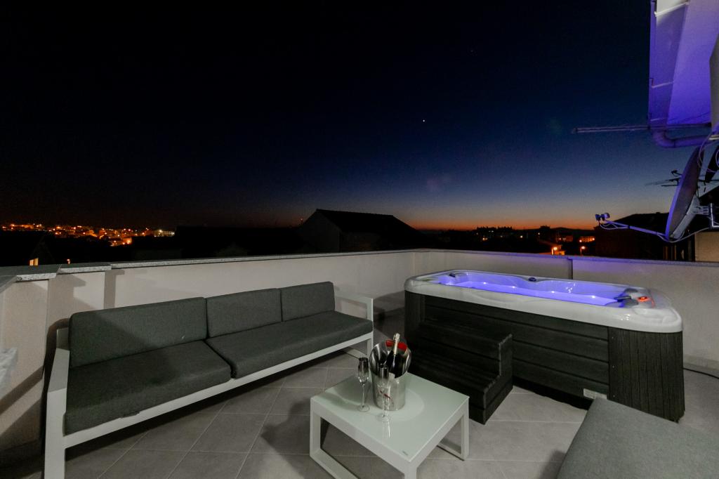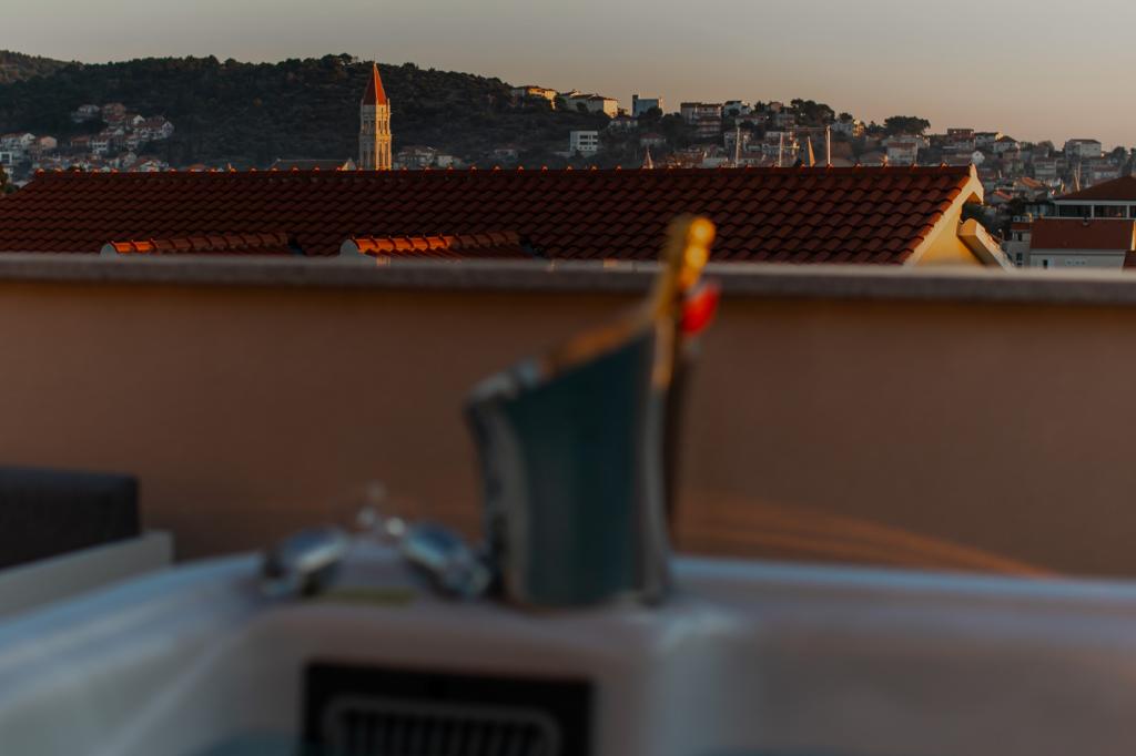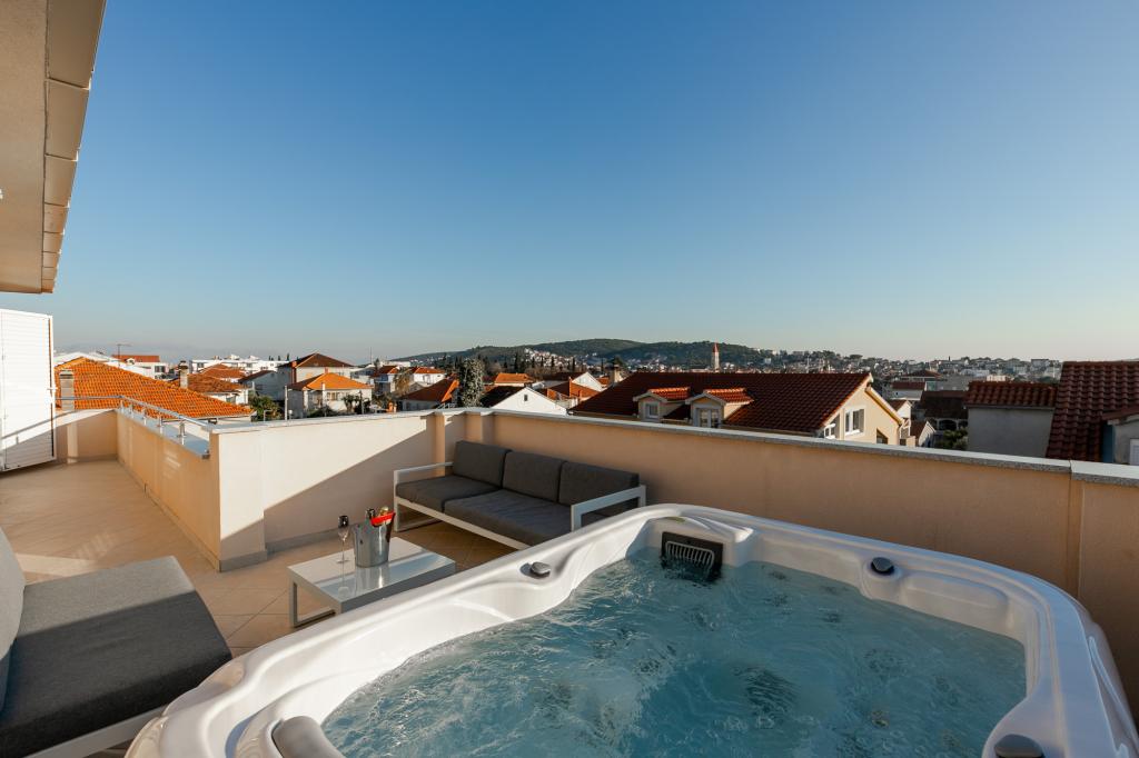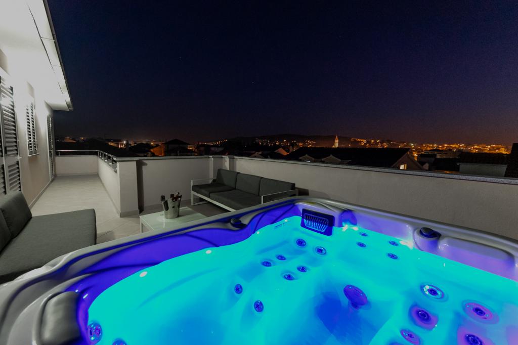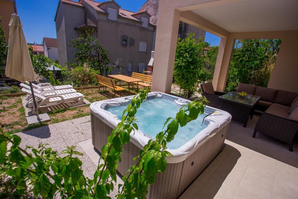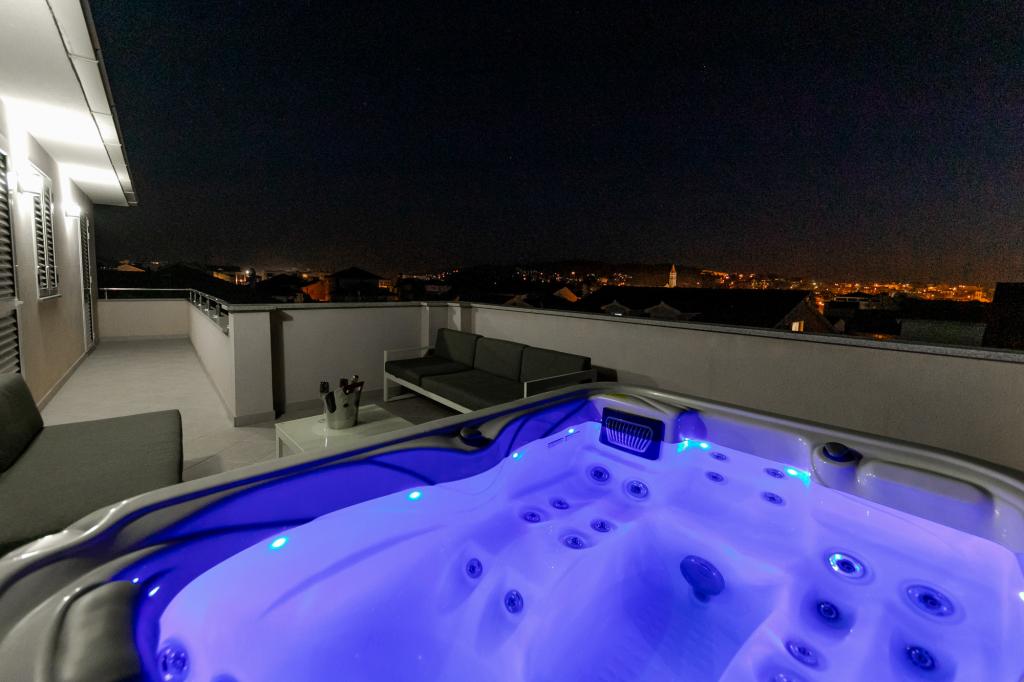 Apartments Kapelica is located in Trogir, 300 meters from the Old Town. The house has 2 apartments and a parking space for 4 cars. Apartment (8) Ground floor: 3 bedrooms, kitchen with living room, bathroom, lobby and garden with outdoor jacuzzi. TV SAT, wi fi, Air condition, washing machine, dishwasher, Netflix The apartment has its own garden, barbecue, billiards, jacuzzi, table football, darts. Apartment (6) Second floor with jacuzzi: 3 bedrooms, 2 bathrooms, kitchen with living room and large terrace with outdoor jacuzzi. TV SAT, wi fi, Air condition, washing machine, dishwasher, Netflix, PS4 It also has its own barbecue and seating area. A small fitness room is at guests ’disposal.