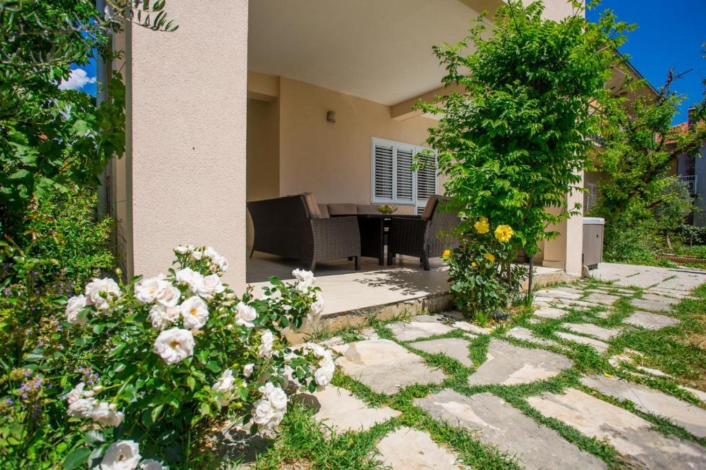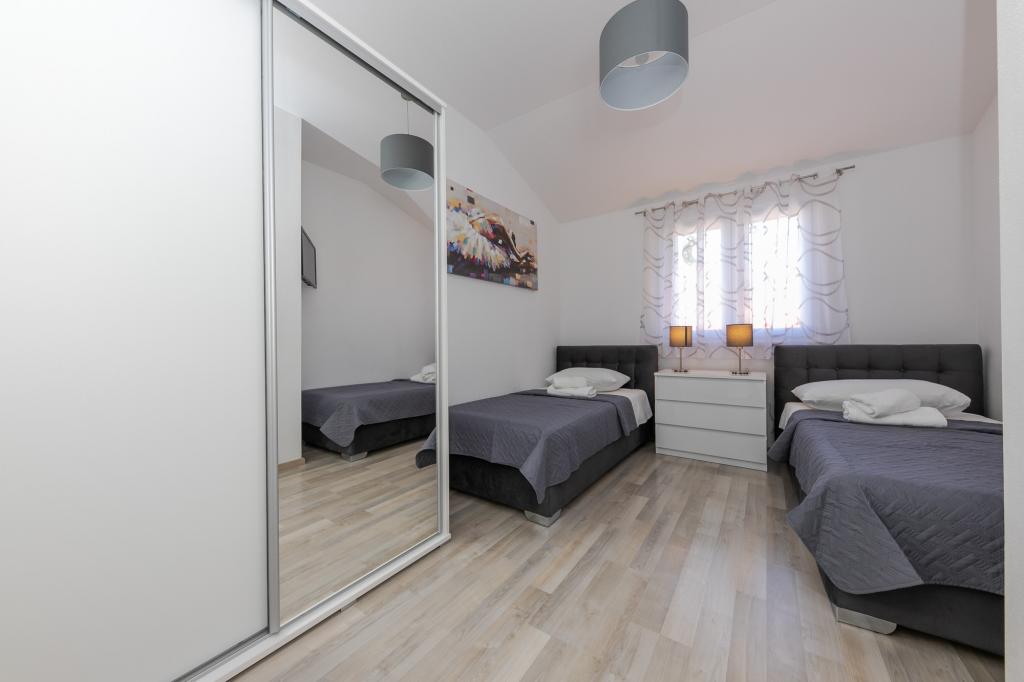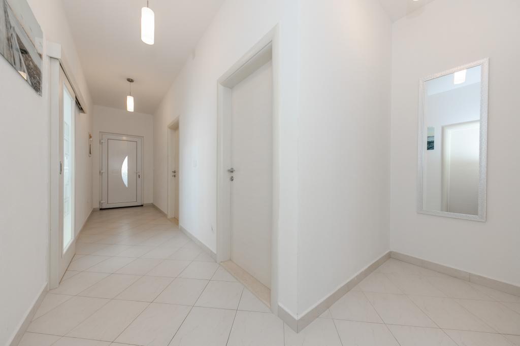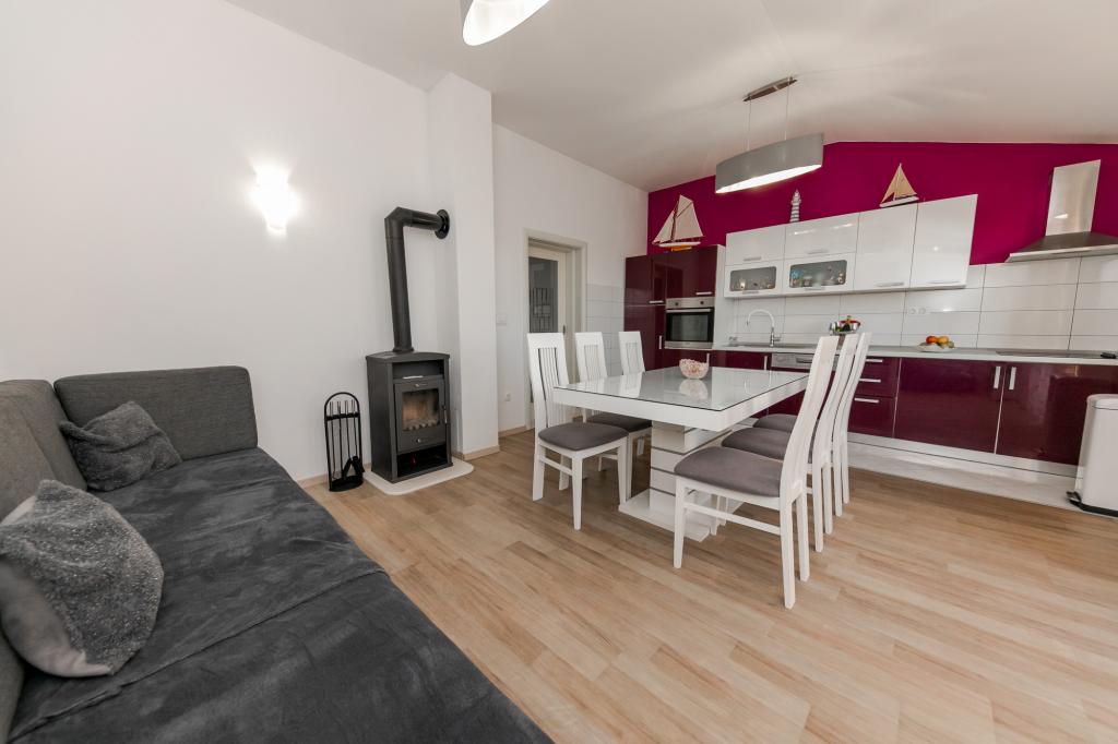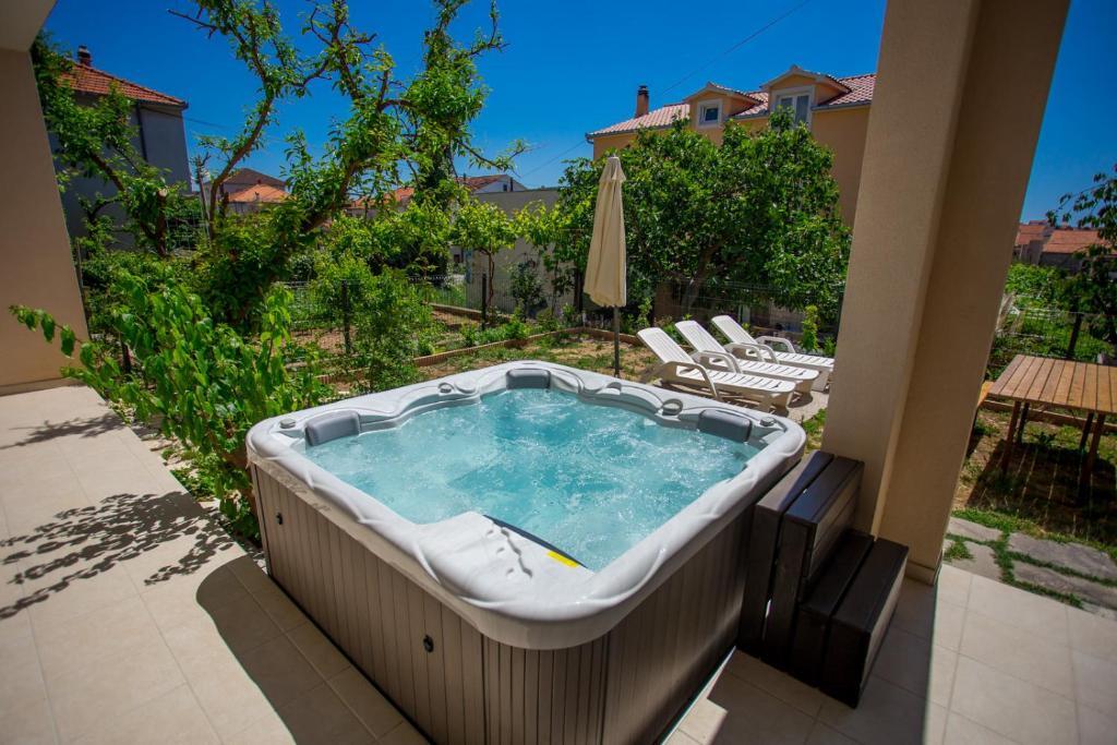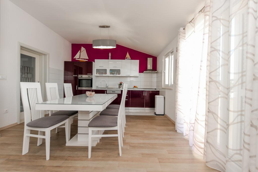 Apartments Kapelica is located in Trogir, 300 meters from the Old Town. The house has 2 apartments and a parking space for 4 cars. Apartment (8) Ground floor: 3 bedrooms, kitchen with living room, bathroom, lobby and garden with outdoor jacuzzi. TV SAT, wi fi, Air condition, washing machine, dishwasher, Netflix The apartment has its own garden, barbecue, billiards, jacuzzi, table football, darts. Apartment (6) Second floor with jacuzzi: 3 bedrooms, 2 bathrooms, kitchen with living room and large terrace with outdoor jacuzzi. TV SAT, wi fi, Air condition, washing machine, dishwasher, Netflix, PS4 It also has its own barbecue and seating area. A small fitness room is at guests ’disposal.