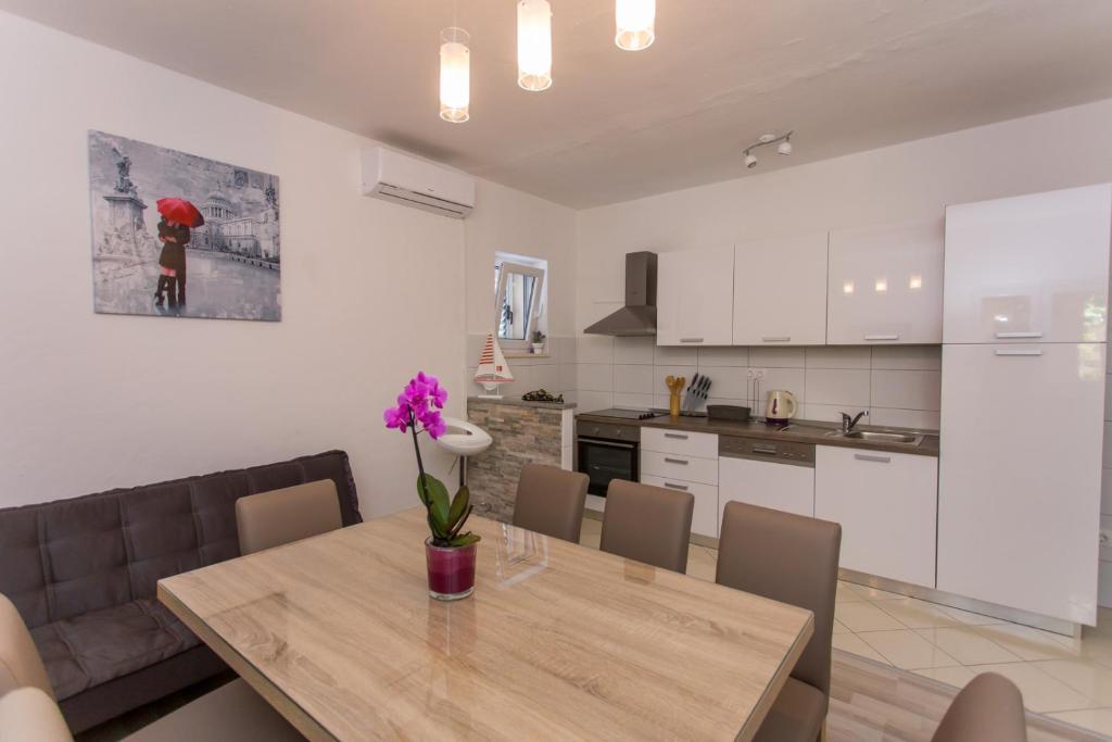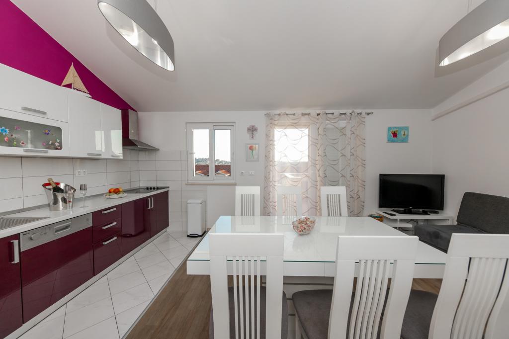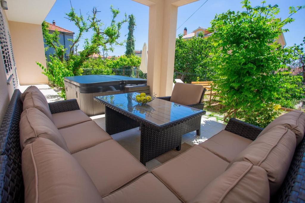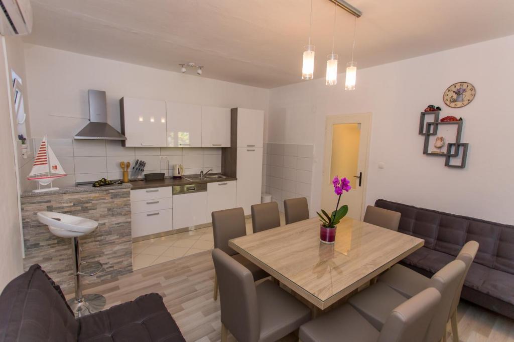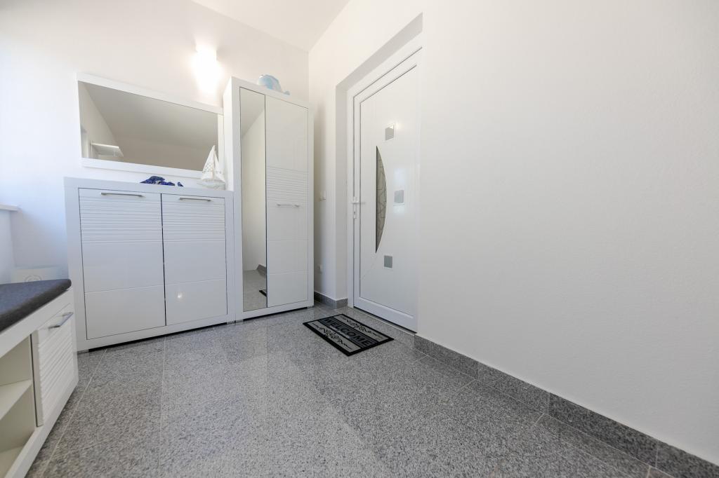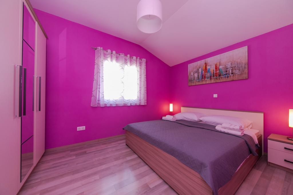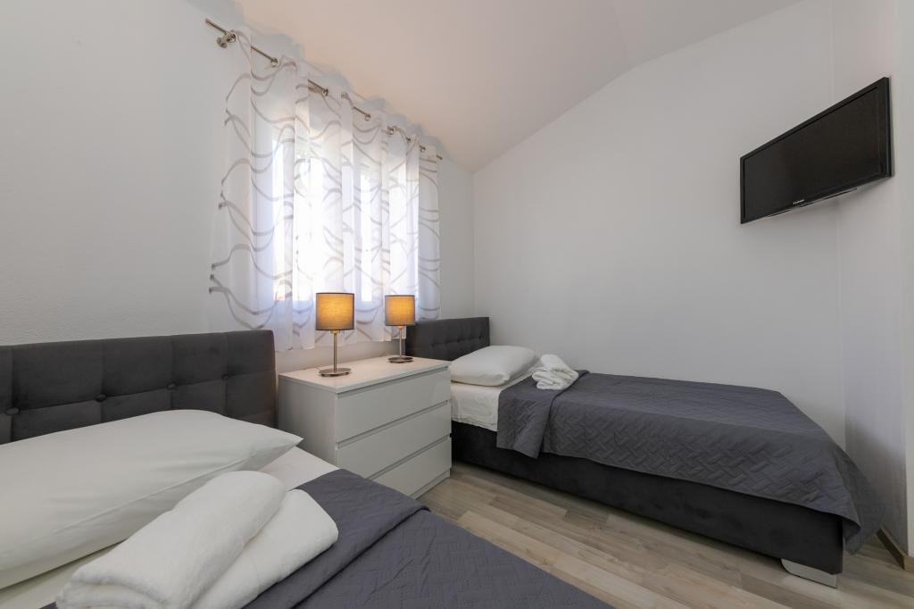 Apartments Kapelica is located in Trogir, 300 meters from the Old Town. The house has 2 apartments and a parking space for 4 cars. Apartment (8) Ground floor: 3 bedrooms, kitchen with living room, bathroom, lobby and garden with outdoor jacuzzi. TV SAT, wi fi, Air condition, washing machine, dishwasher, Netflix The apartment has its own garden, barbecue, billiards, jacuzzi, table football, darts. Apartment (6) Second floor with jacuzzi: 3 bedrooms, 2 bathrooms, kitchen with living room and large terrace with outdoor jacuzzi. TV SAT, wi fi, Air condition, washing machine, dishwasher, Netflix, PS4 It also has its own barbecue and seating area. A small fitness room is at guests ’disposal.