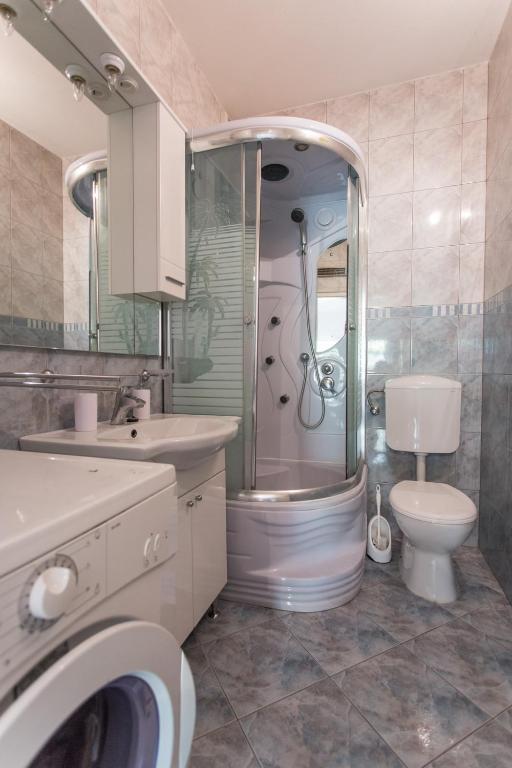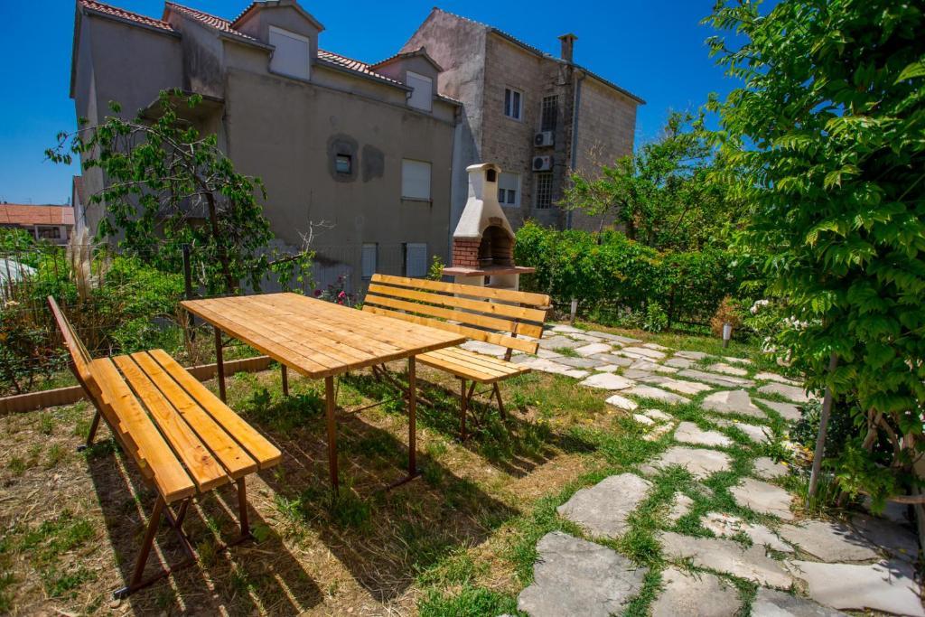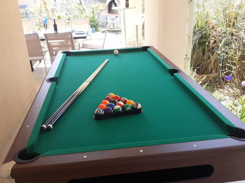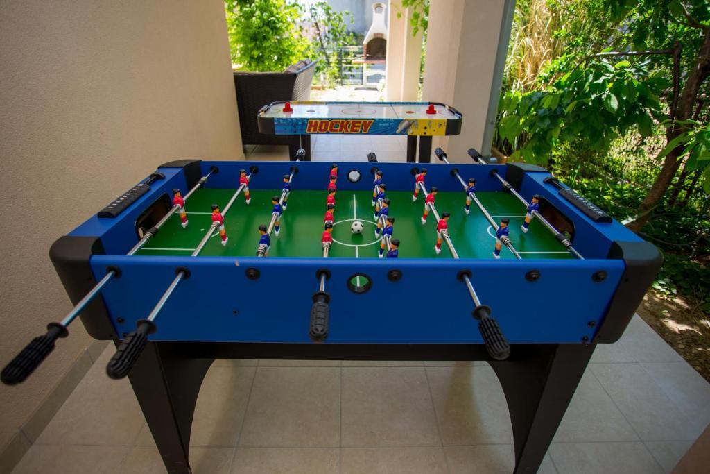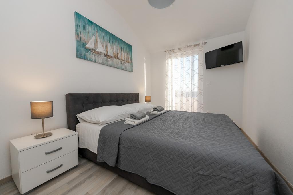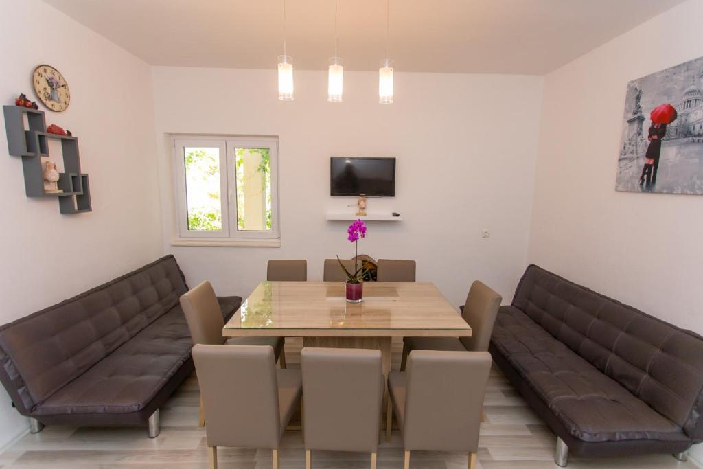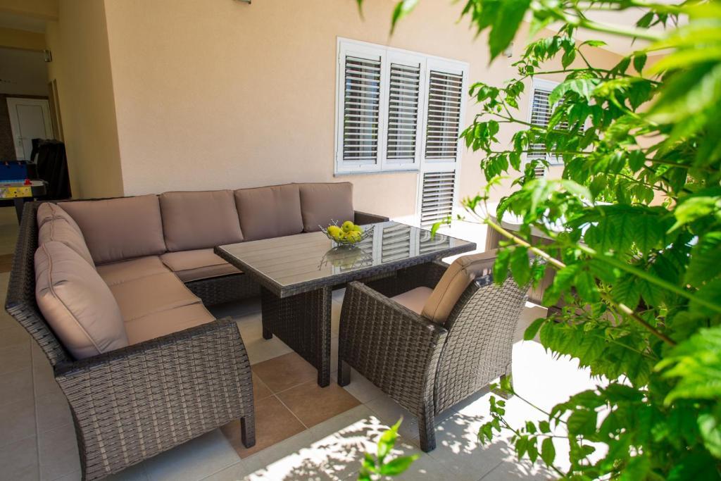Apartments Kapelica is located in Trogir, 300 meters from the Old Town. The house has 2 apartments and a parking space for 4 cars. Apartment (8) Ground floor: 3 bedrooms, kitchen with living room, bathroom, lobby and garden with outdoor jacuzzi. TV SAT, wi fi, Air condition, washing machine, dishwasher, Netflix The apartment has its own garden, barbecue, billiards, jacuzzi, table football, darts. Apartment (6) Second floor with jacuzzi: 3 bedrooms, 2 bathrooms, kitchen with living room and large terrace with outdoor jacuzzi. TV SAT, wi fi, Air condition, washing machine, dishwasher, Netflix, PS4 It also has its own barbecue and seating area. A small fitness room is at guests ’disposal.