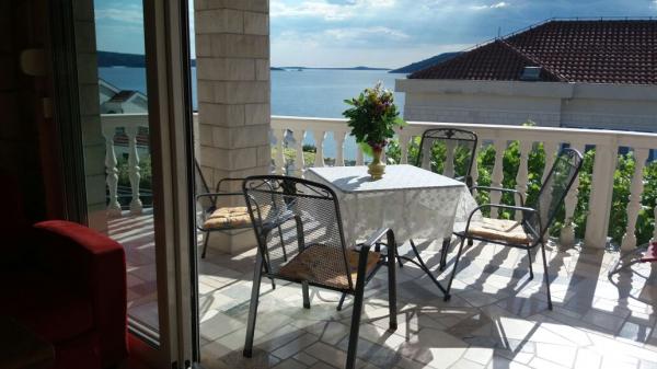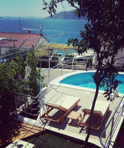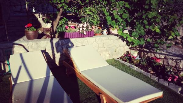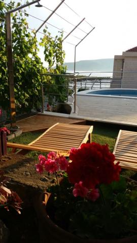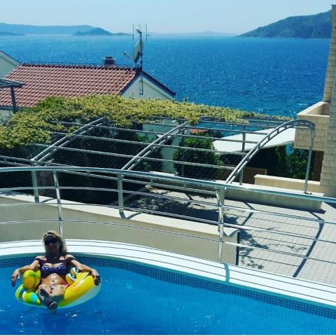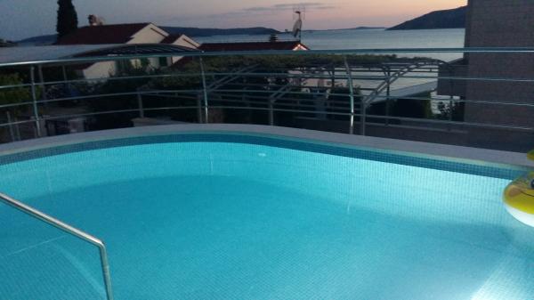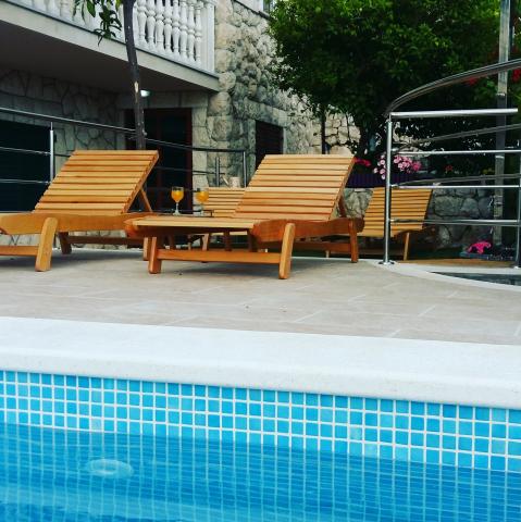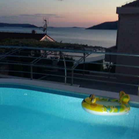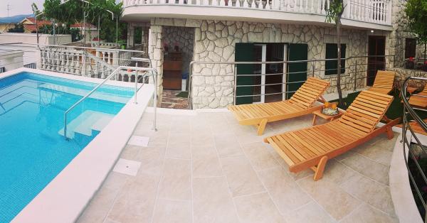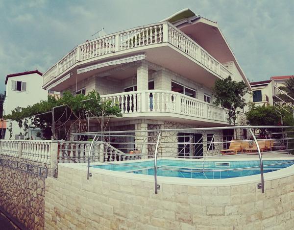 Stone house Villa Anita are located on the peninsula Čiovo in a quiet place, Okrug Donji (Central Dalmatia). The villa has 2 large kitchens and 1 smaller, 4 bathrooms, 4 sleeping rooms and a huge living room. Apartments fitted on 2 floors of the house and a terrace in attic with view, spacious terraces and a swimming pool. If You like beautiful sea and nature, the beach is only 50m away from the house, as well as the beautiful pine forest with a promenade leading to the ship line to Trogir. Guests can enjoy the pool with a sunbathing area and a terace with a large oak table and benches, with vines providing natural shade and a perfect view. You can also use an inside fireplace for preparing grilled meals, a single car garage and another outside parking space (protected by heavy-duty steel fence). The town of Trogir (under the protection of UNESCO) is only a 10-minutes drive away from the accommodation, as well as night clubs. Shops are located 500m away from the house itself.