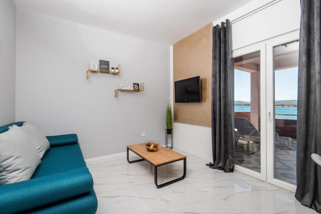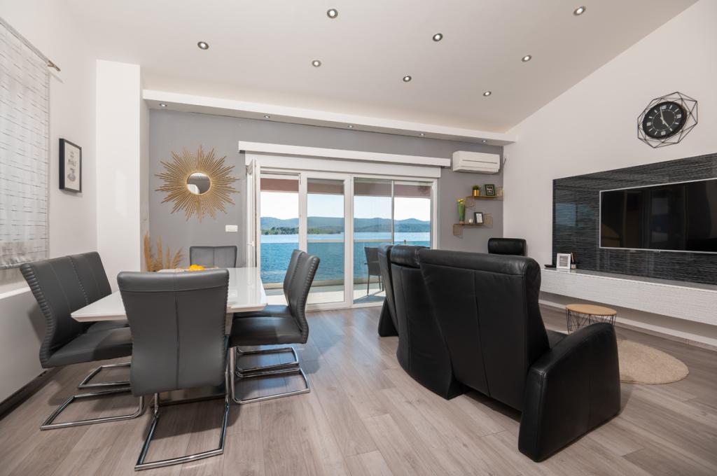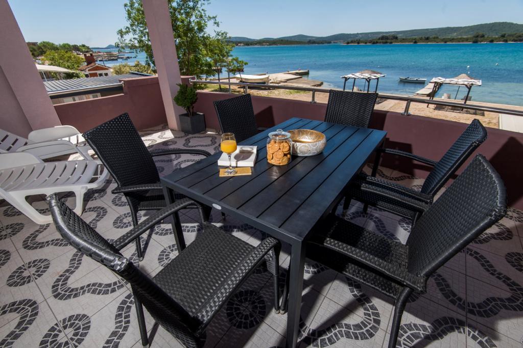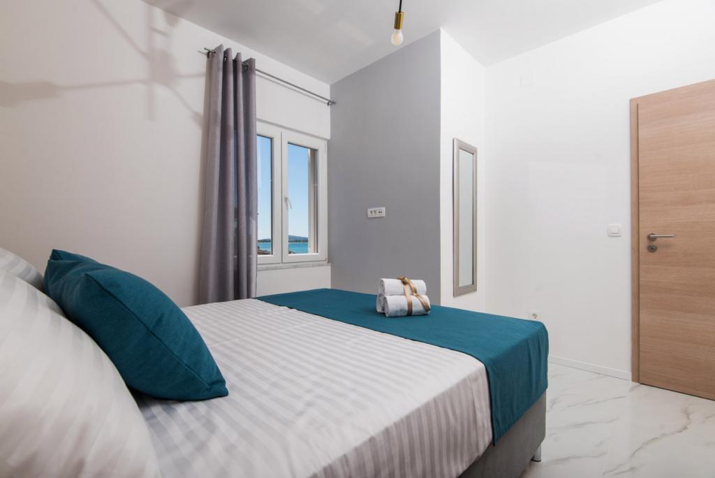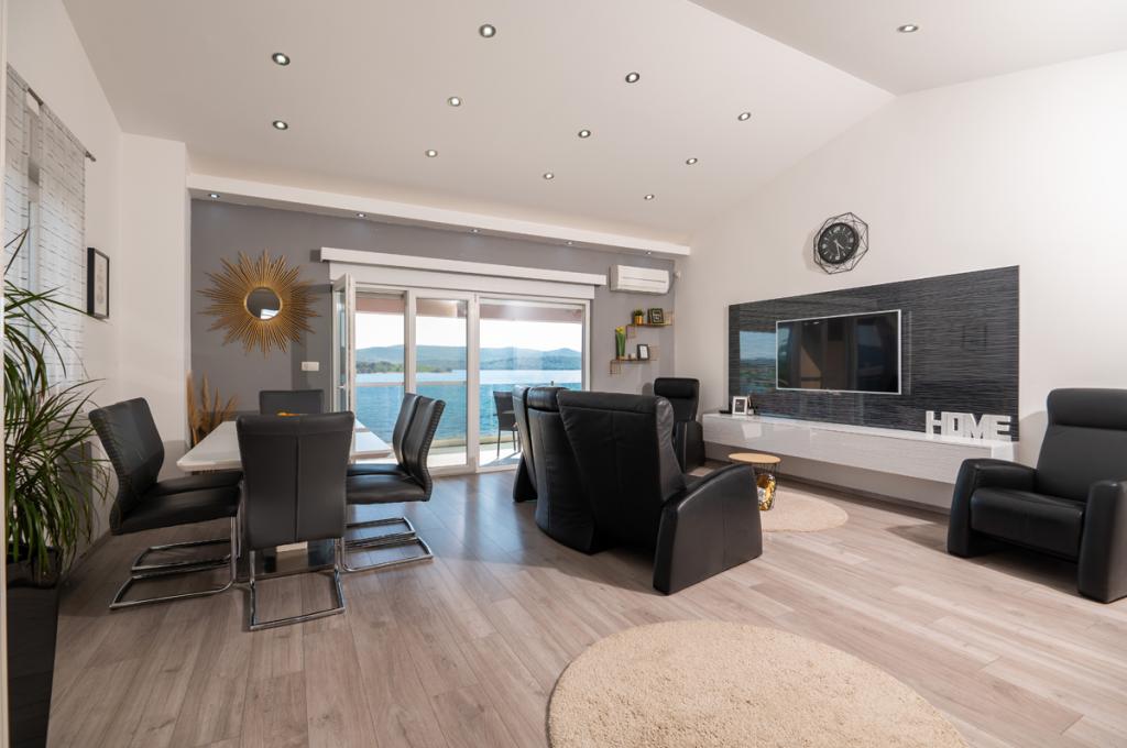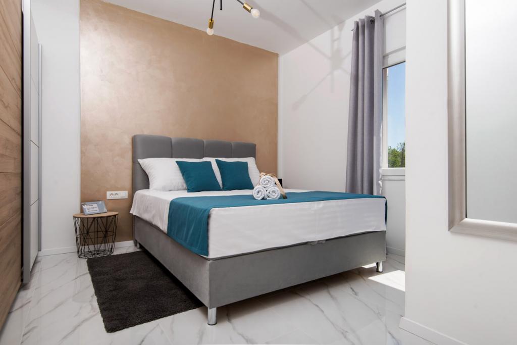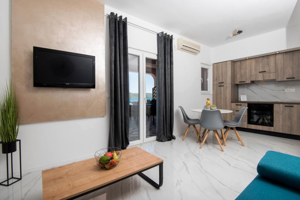 Find your peace and place in a building with 7 new apartments in Turanj, only 5 km away from Biograd and 20 km from Zadar. Turanj is a quiet place surrounded with 4 national parks distant 30 minutes from your apartment. The apartments are located at 15 meters from the private beach where your family are waiting for umbrellas and deck chairs. The apartments are equipped with air conditioning, satellite TV, and have balconies with sea views and safe parking and barbecue. There are studio, one-bedroom and studio apartments.