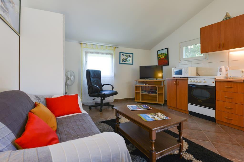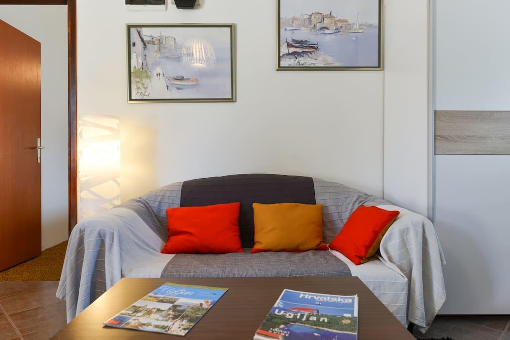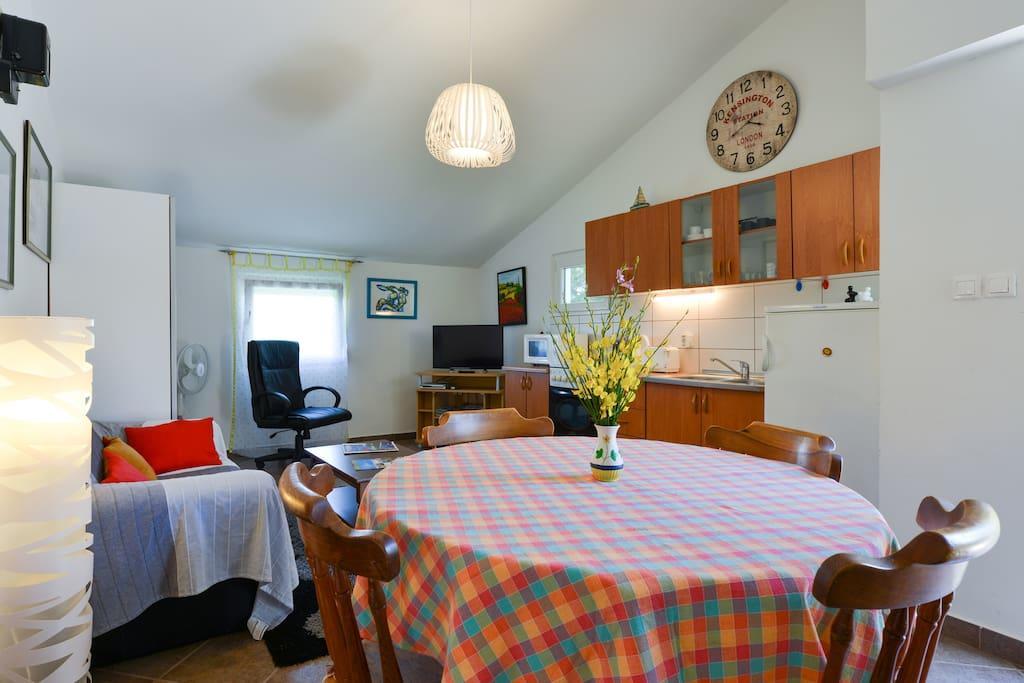 A very nicely decorated and clean apartment in a quiet location, with a car park in the shade in front of the house. The owners are very friendly. There are several beaches nearby, we liked the South one the most, where there is a sink in the water, and there is a lot of shade under the pine trees on the beach. We had bikes with us, so all the beaches on the northern part of the island were accessible to us in a few minutes. There is a market in nearby Ugljan where you can buy fresh fish and vegetables, and there are also several shops.