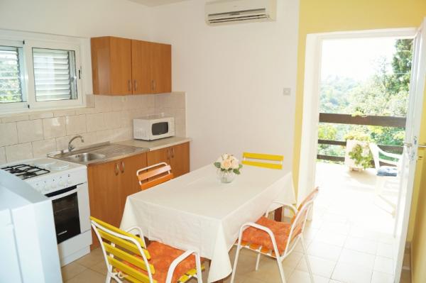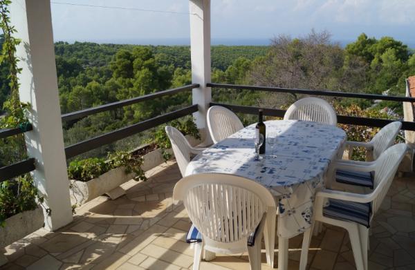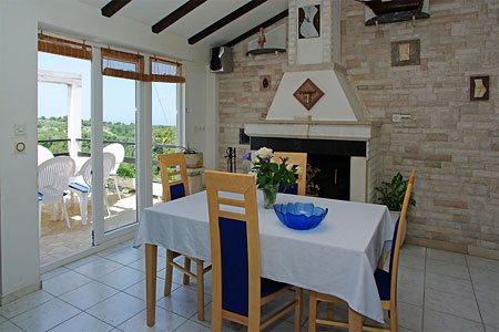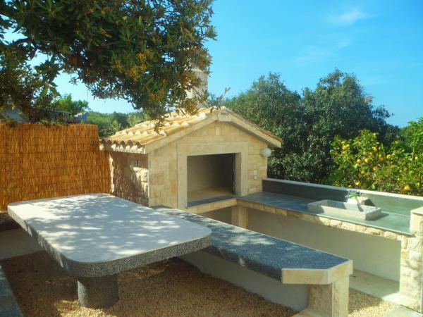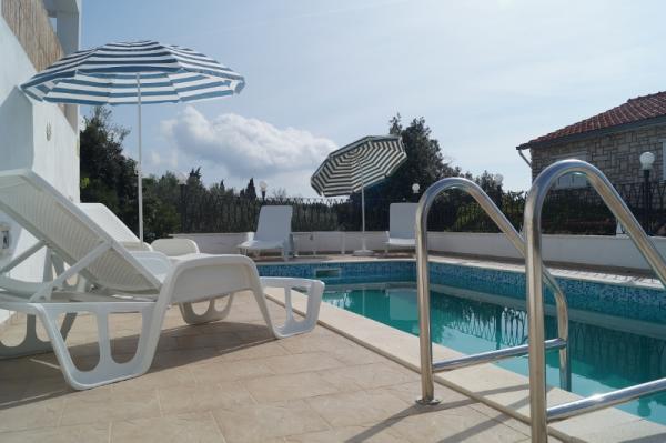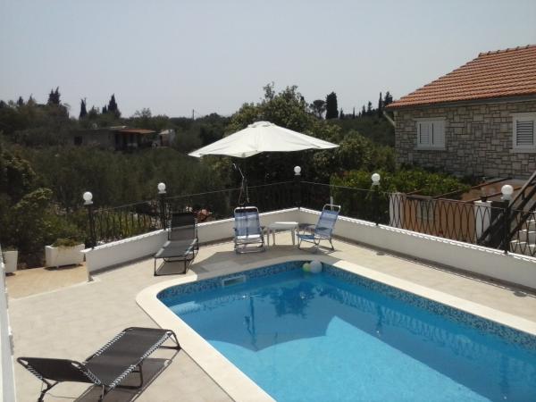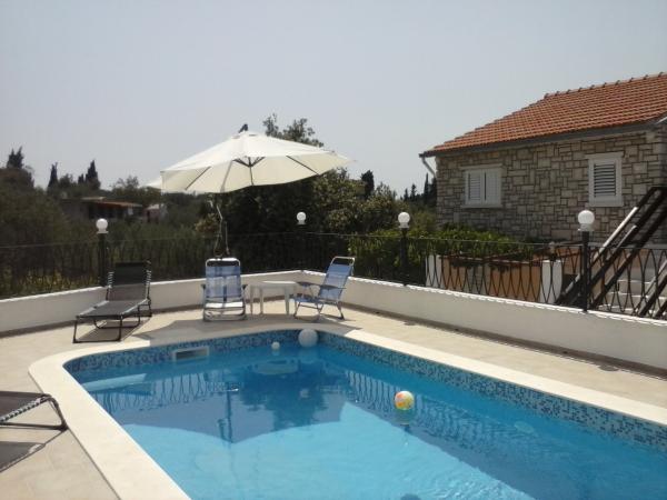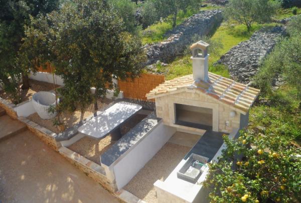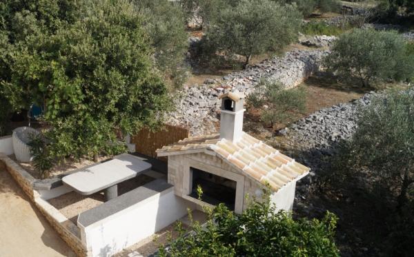 Holiday house located in a quiet part of the island, in the bay Tankaraca. It is located 6 km from the center of Vela Luka and 400 m from the beach. Offers guests a comfortable stay, especially for families and those who want to get away from the usual tourist crowds. It is situated in a quiet location, surrounded by pine and olive trees. The house has a swimming pool (21m2) with sun deck, outdoor shower and deck chairs and a fireplace with a stone table. For guests is secured using privatanog parking. The house consists of two apartments. Both apartments have their own terraces with sea views and beautiful sunsets. Apartment first is located on the first floor. It has one bedroom, living room with extra bed, kitchen, dining room and bathroom with shower. Apartment 2. is located on the ground floor. It has three bedrooms, kitchen with dining room and bathroom with shower. The kitchens in both apartments are equipped with complete crockery and cutlery. Guests have access to wireless internet.