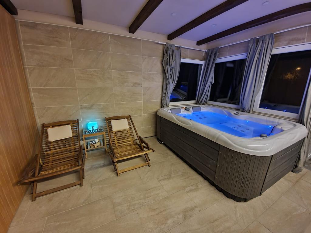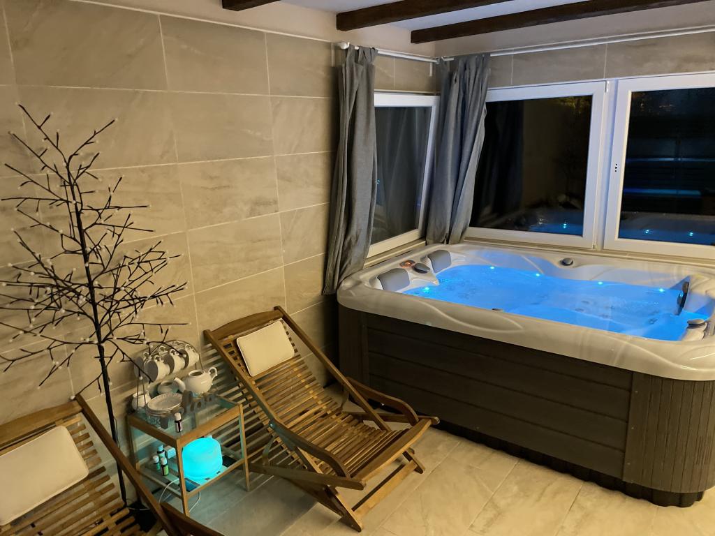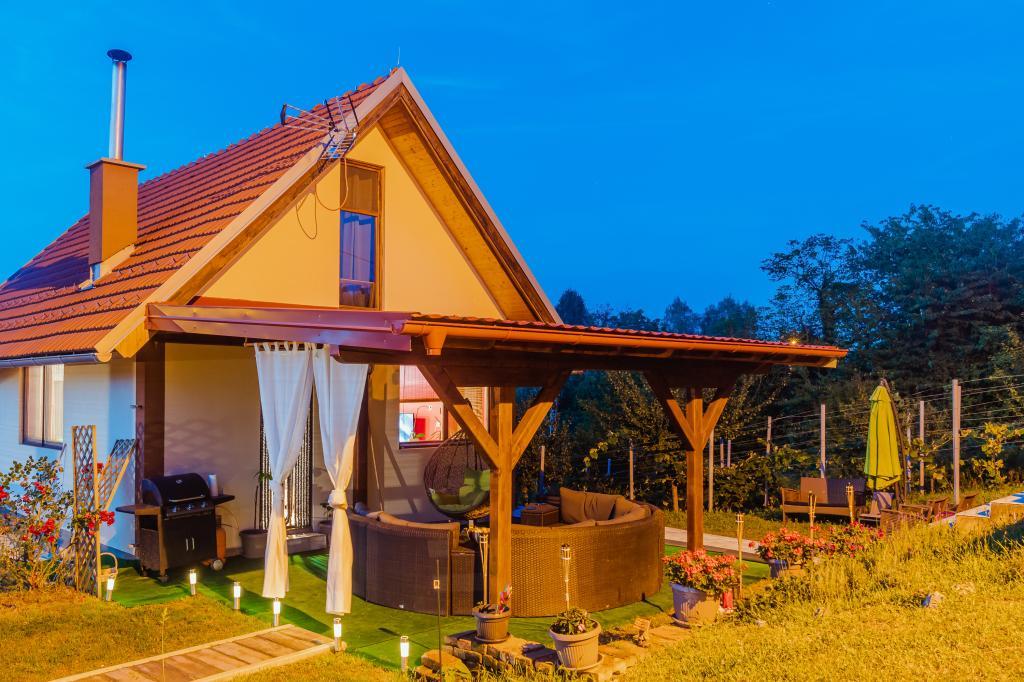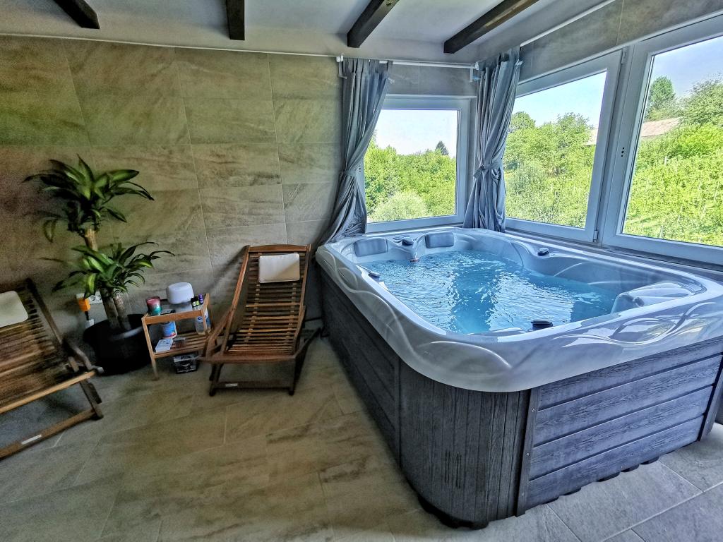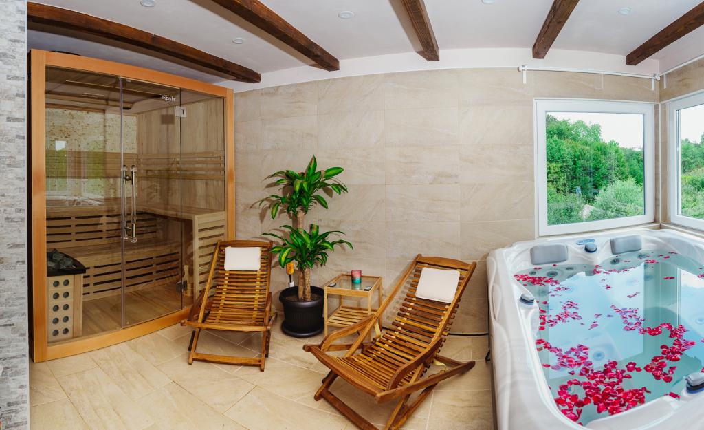 The vacation house "Wellness House Gudci" is located on the hills of Vukomeričke gorice, in the town of Gudci. It is surrounded by forest, vineyards and pure nature. It is full of contents for rest and entertainment. It is a 15-minute drive from Franjo Tuđman Airport. It contains a large sauna for 5 people that has a place to lie down and the possibility of adjusting the temperature so that you have both a Finnish and a Bio sauna depending on your needs, floor heating is in the entire wellness area, a hydromassage pool with a large number of jets and an Ozonator that is responsible for the constant water disinfection. An aromatherapy diffuser is available to all guests. The Wellness Center is available 24 hours a day and has its own separate entrance. The view is only of nature. Blackout curtains, LED lighting, starry sky, large thermostatic shower. The thermal cover of the pool, the temperature of the hydromassage pool can be adjusted individually. Color therapy is available in the sauna and hydromassage pool.
