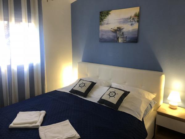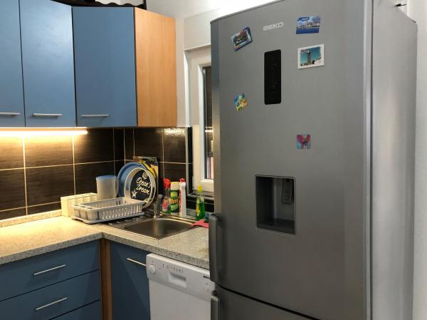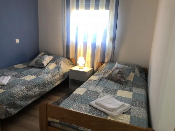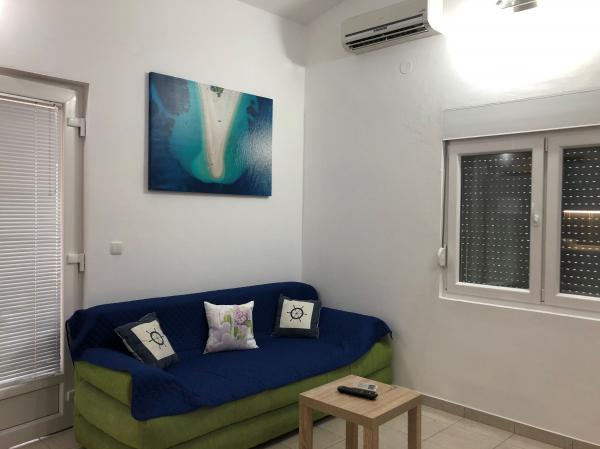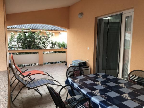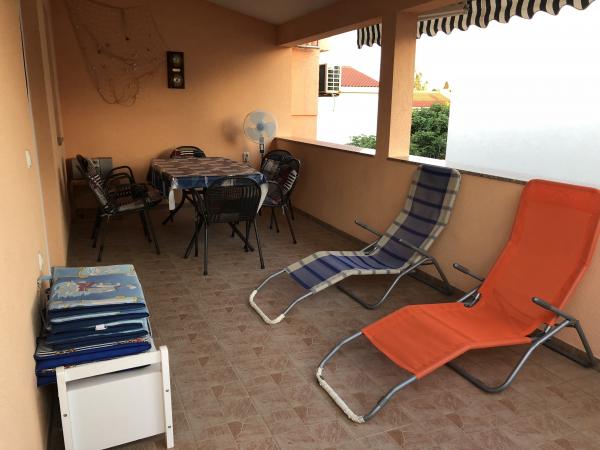 Modernly equipped apartment 200 m from the beach and located in the first part of the island. The apartment (60 m2) is located on the first floor and consists of two bedrooms (a double bed and two separate beds). Spacious living room with kitchen, bathroom, flatscreen TV and WiFi internet. The kitchen has a dishwasher, microwave, large fridge, kettle, oven and hob. The spacious terrace (15 m2) has an awning and is covered; on the terrace there are deckchairs and a spacious table for 6 people. Within the apartment, it is possible to use a shared barbecue and a washing machine. The water in the apartment is potable (from the city water supply). Parking is provided within the building. Smoking is allowed only on the terrace.