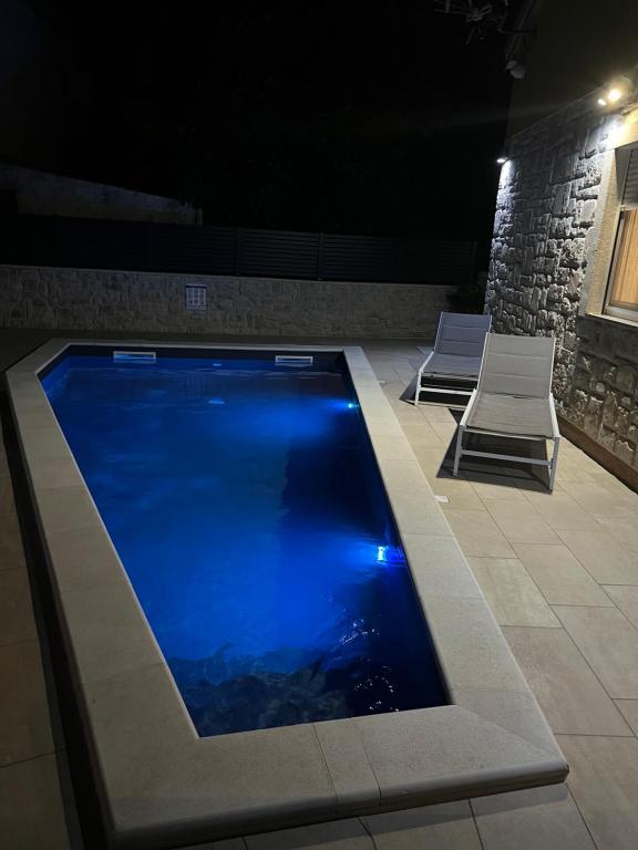 This new holiday home is located in the very center of the island of Vir. Hidden from noise and view. The house has 2 bedrooms with a double bed and one double bed on the gallery. The total capacity is 6 people. Also, there are two bathrooms, one in the attic and the other on the ground floor, equipped with a washing machine and dryer. The kitchen is also equipped with all appliances. In the yard there is a covered terrace, barbecue and children's playground. Parking is available to guests as well as one space in the garage. All neighbors are at a decent distance and you have privacy to yourself. If you want to be in the center, close to all facilities, and yet hidden from view, this house is the right choice for you. We are looking forward to your arrival.