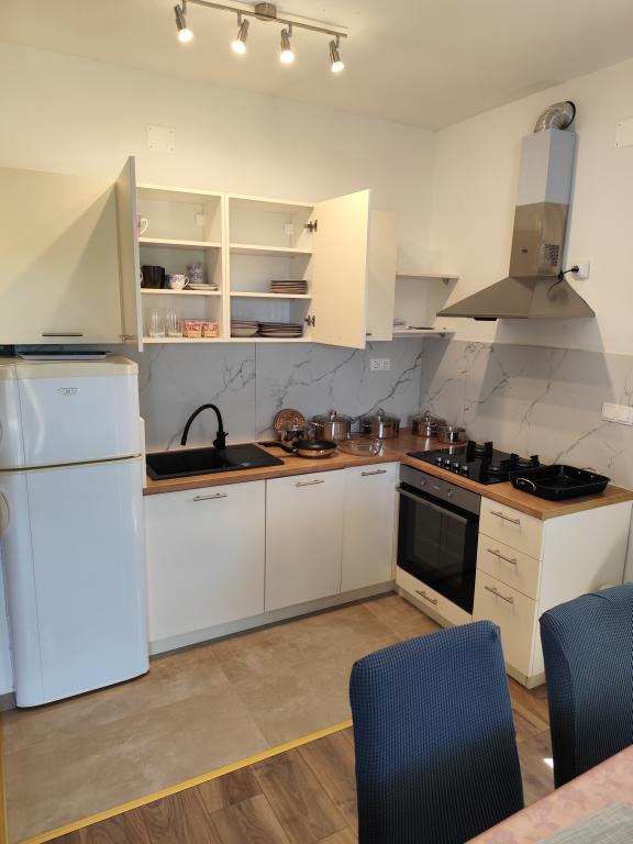 Nice, clean and large apartment. Spacious terrace where you can sit in the evenings. Kitchen equipment is modest but it was enough for us. We prepared all meals without any problems. In the bedroom there is a comfortable and very large bed. Apartment in a quiet and peaceful area. 12-15 minutes walk to the beach. In short, everything was as in the advertisement. We thank you for your hospitality and greet you warmly to your host Sergej and the older gentleman who greeted us in front of the house almost every day.