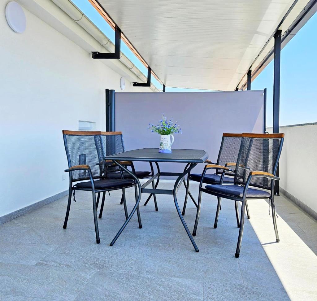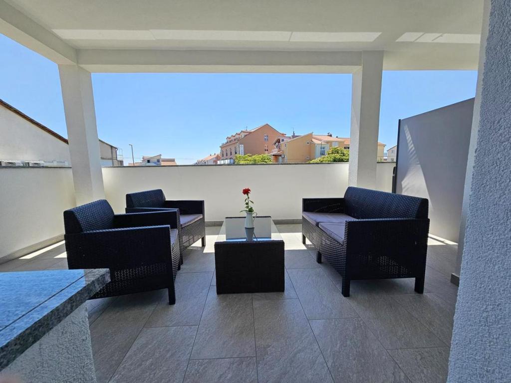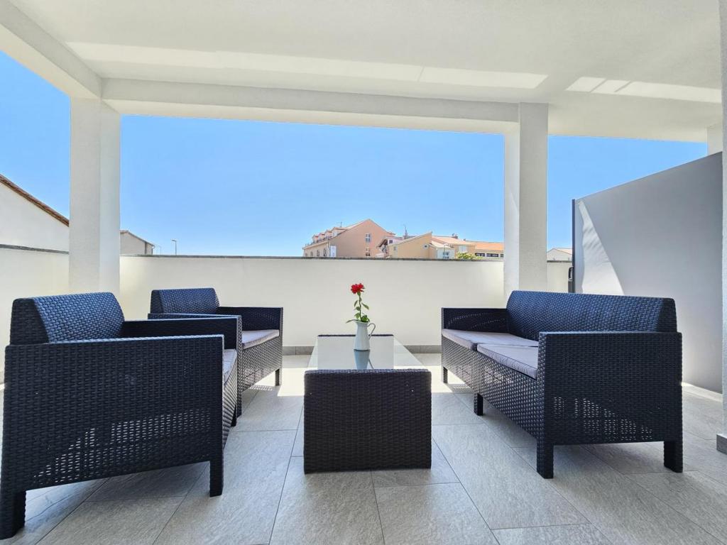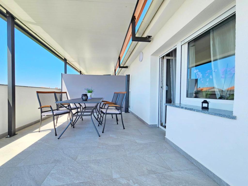 NEW!!! Welcome our dear guests to the newly renovated spacious apartments of 70 m2 in a family house: a large living room connected to the kitchen and dining room and exit to a large terrace of 16 m2 with a view of the sea; bedroom with double bed and additional balcony, second bedroom with 2 separate beds, large bathroom and hallway. On the same floor, 2 exactly the same apartments with newly built large terraces! The facility is located 3 minutes from the beach and the first store. Comfortable and spacious! Clean and tidy! There is a safe and covered parking space within the building. WiFi, air conditioning, satellite TV, barbecue, outdoor shower, secure parking and tourist tax included in the price! For any additional needs, the friendly hosts are at your disposal at any time!