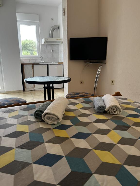 Apartments Kresović are located in Vodice, in a quiet street, just a 5-minute walk from the center of Vodice. Our apartments are located on the 2nd and 3rd floors of the house and offer a beautiful view of the sea. All are fully equipped and furnished, have one double bed and one sofa bed, a fully equipped kitchen and bathroom, and bed linen and towels are of course included in the price of the apartment. There is also air conditioning, satellite TV and WiFi, and a parking space that comes with each apartment and is located in our yard. We leave the decision to visit us and experience everything that Vodice can offer you!