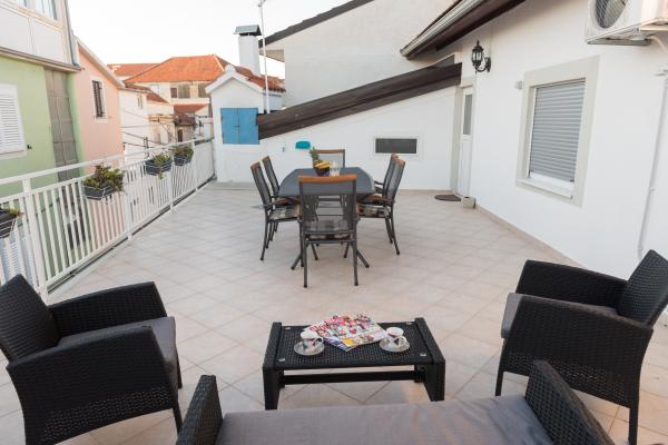 Renovated house with two luxuriously equipped apartments, in the center of Vodice, second row from the sea. Both accommodation units are spacious, comfortable with a large terrace overlooking the sea (the flower oasis) ... The property is a 2 minute walk to the beach. Near the house are all restaurants and cafes, and all other city events. There is a parking space for guests