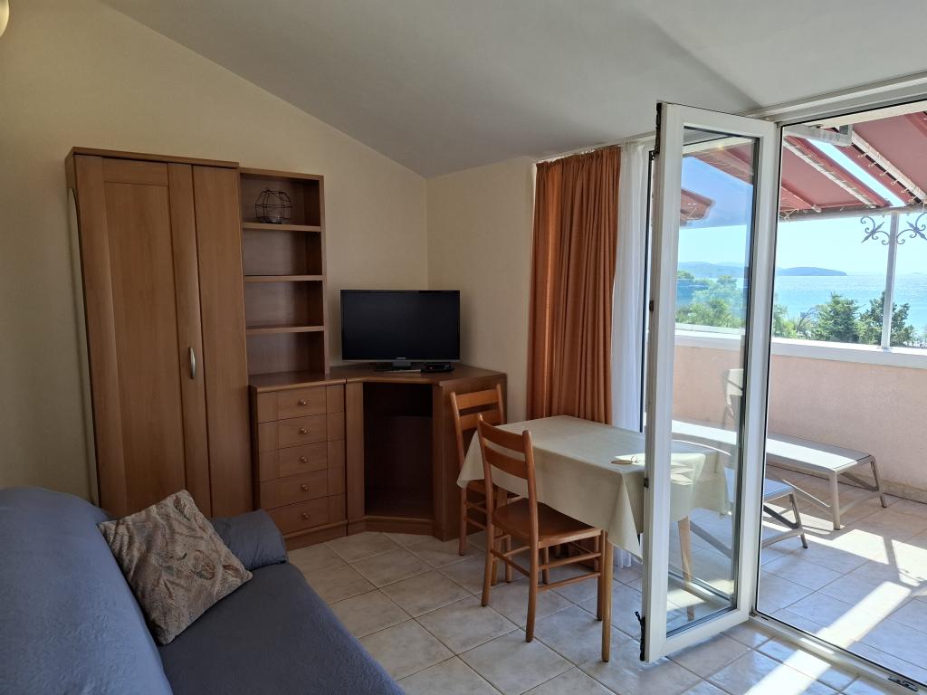 “Villa Lovorka” offers accommodation first row to the sea, with a beautiful, open view of the islands, the beach and the surrounding area. On the edge of the town of Vodice, in a quiet area, for a relaxing holiday. Our apartments have the “Like HOME” label, a club quality family accommodation. Our comfortable apartments have 1 or 2 bedrooms, each with a standard equipped kitchen, living room with dining area, hall, shower/toilet, and large balconies, most with a sea view. We highlight a large fenced parking lot for cars and boat trailers. If you want recreation, entertainment or gourmet pleasures, the famous Blue Beach is nearby, Vićevica beach, in front of the house Bristak beach, as well as the new promenade connecting Vodice and Tribunj. We live on the ground floor all year round and are happy to be at our guests' disposal. Basic features: - first row to the sea - spacious balconies with a beautiful sea view - central heating and air conditioning for a comfortable stay - SAT TV, Wi-Fi - we create additional content according to the guest's interests