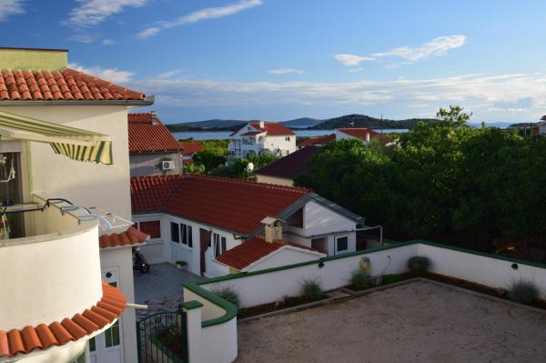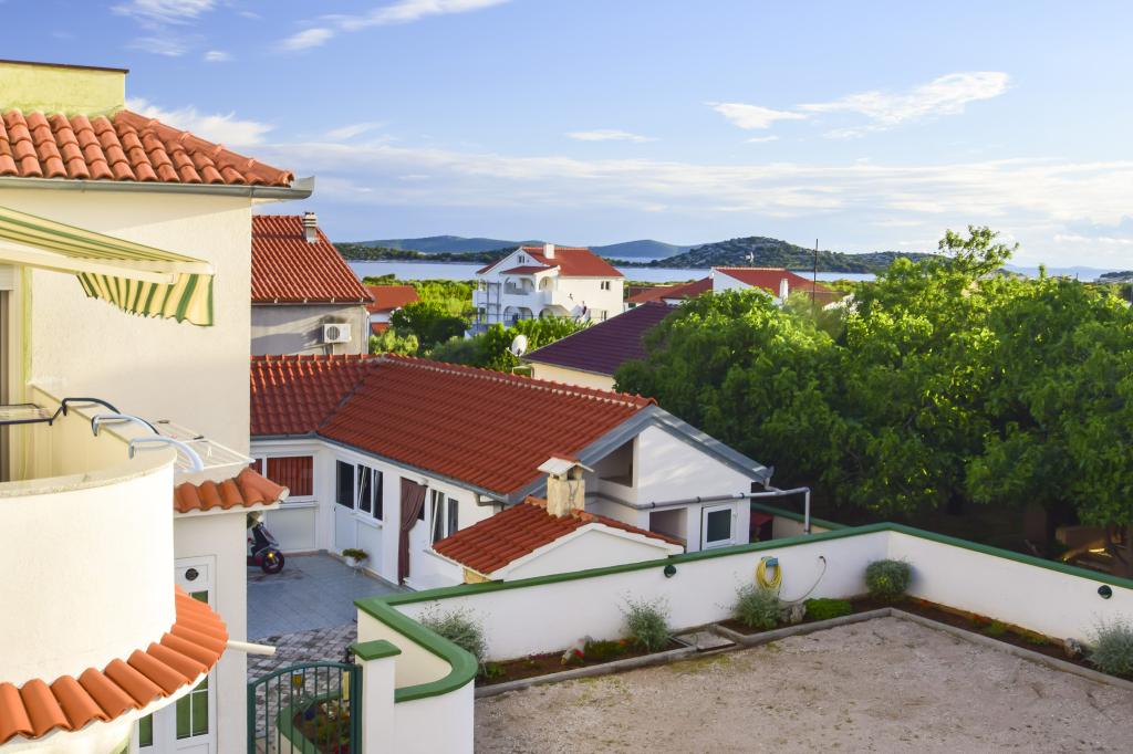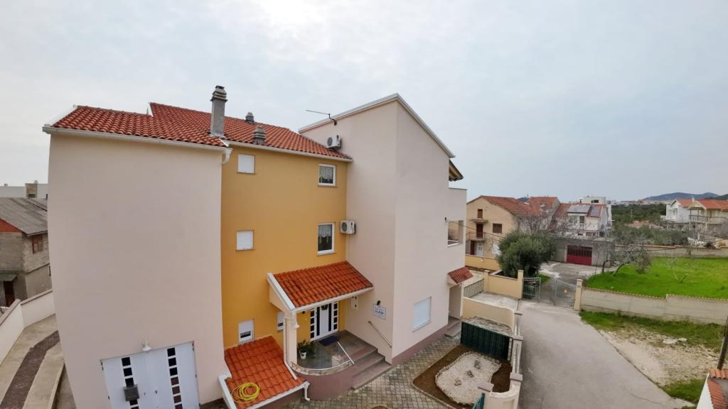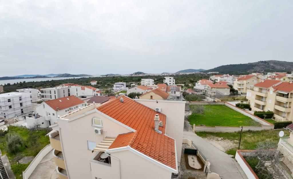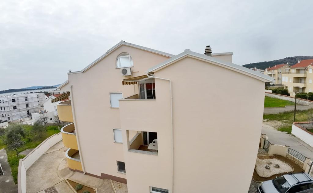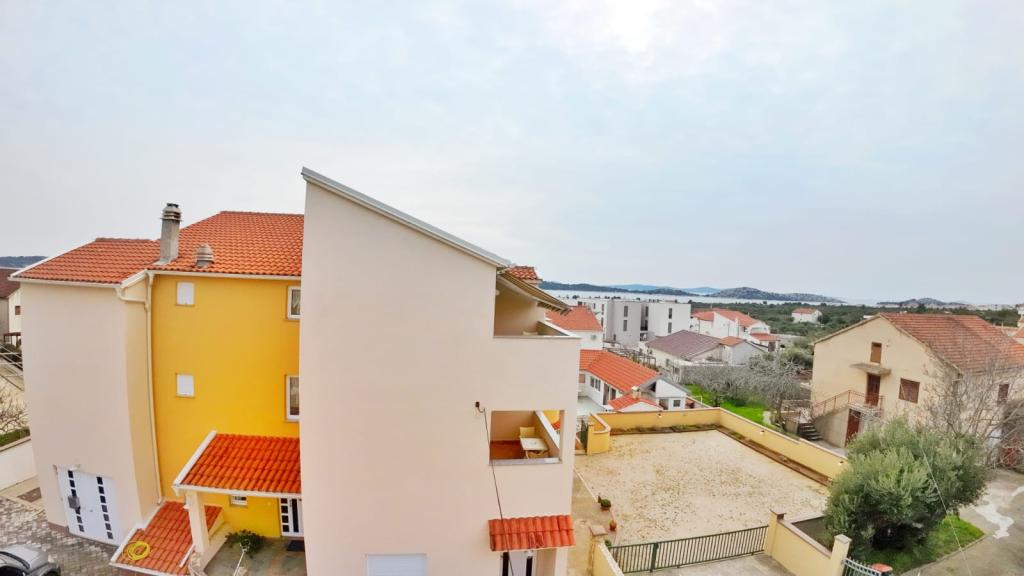 Villa Sanja is a modern building, located in one of the best locations in Vodice, 350 meters from the beach, with 7 apartments with a balcony or terrace. All seven apartments have a beautiful sea view. An extra bed can be placed in all apartments. The apartments are modernly furnished and extremely spacious. 5 Apartment for two people is 38 m² in size - it consists of a bedroom, living room with kitchen with sofa bed and balcony. 2 Apartment for 2 people 50 m² with living room, kitchen, bedroom, bathroom large balcony or terrace. One Apartment complete floor for 8 - 10 people: • four large double bedrooms, two of which with a third bed • four bathrooms with toilet, large kitchen, common room. • Parking on the property or in the house • about 15 minutes walk to the center of Vodice • about 5 minutes walk to the beach This family house is located about 350 meters from the beach. Parking in the facility or at home.