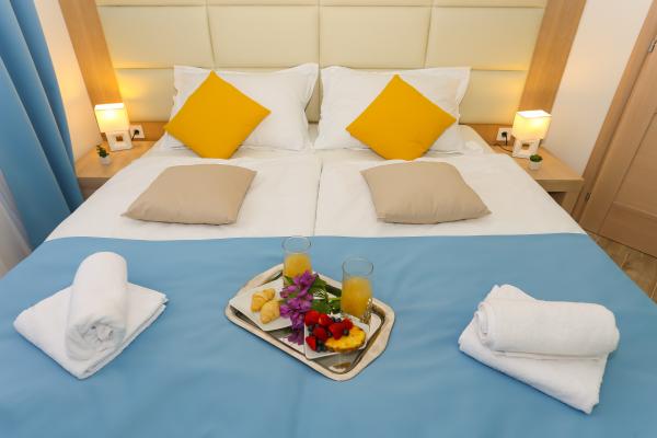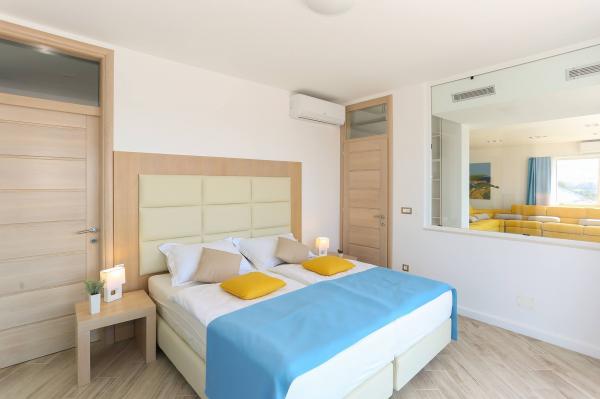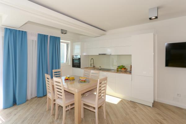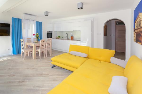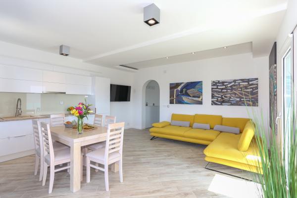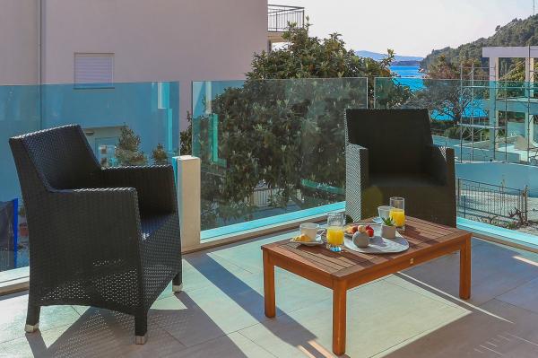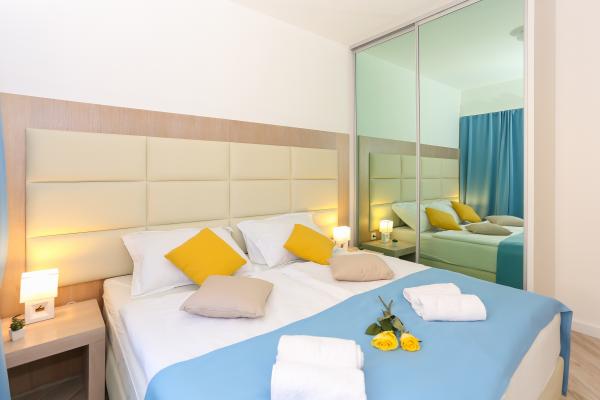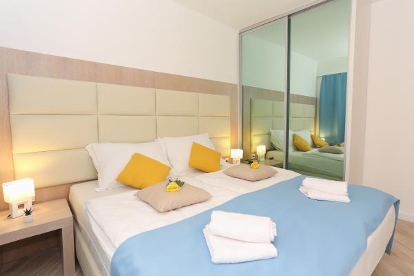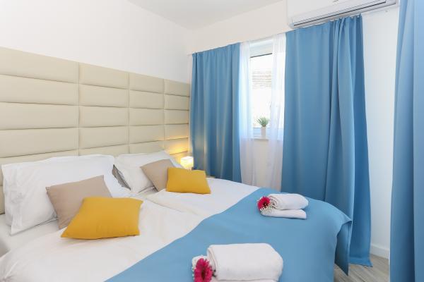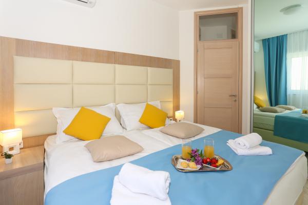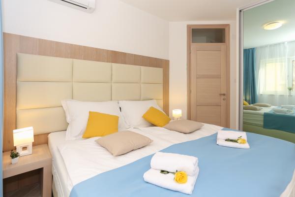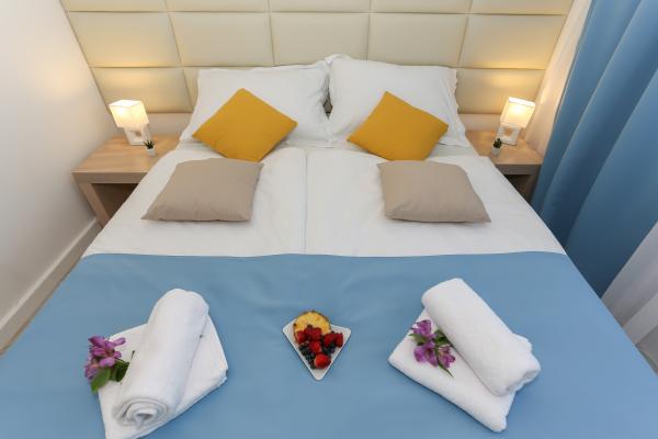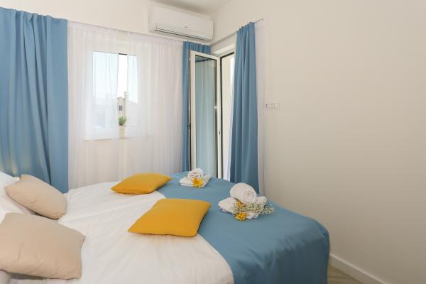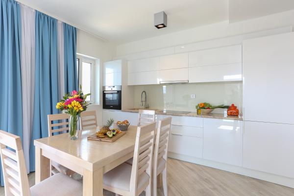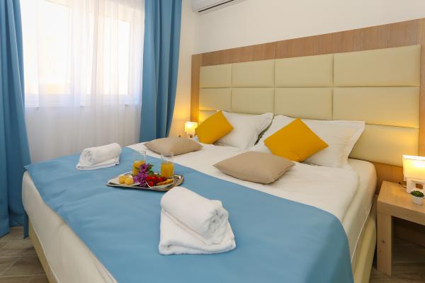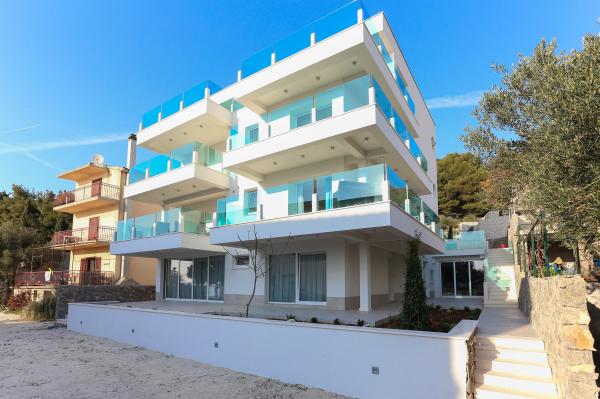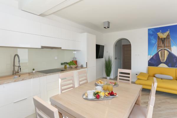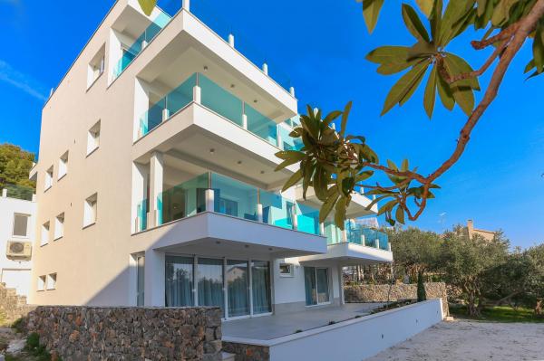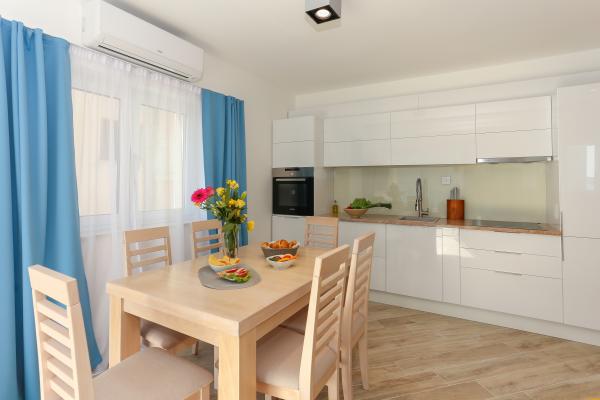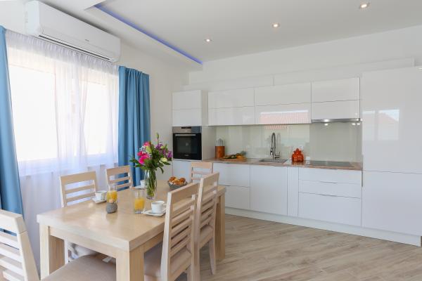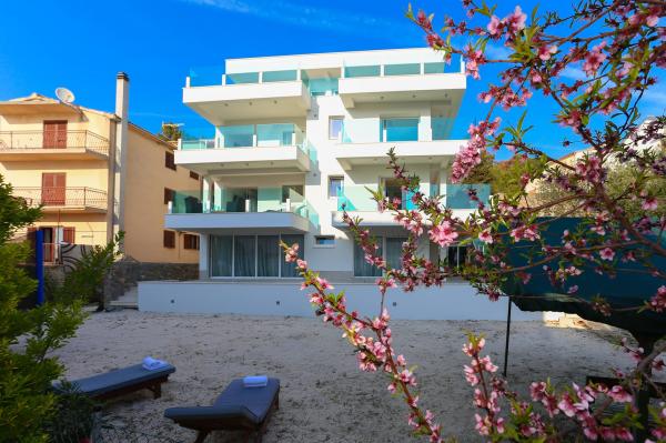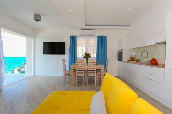 Villa Aqua contains five apartments which are fully equipped and modern. The first and second floor contains 4 apartments with kitchen, two bedrooms, bathroom and large terraces overlooking the sea. On the third floor is our luxurious pent house with two bedrooms, two bathrooms, kitchen, large living room and a terrace of 60 square meters. The rooms and living rooms in every apartment has air conditioning, a bathroom washing machine and a kitchen oven, dishwasher, modernized hob and full kitchen utensils. Each living room contains a smart android tv. Villa Aqua is located 20 m walk from the sandy beach and 50 meters from the cafe Africa, 300 meters from the cafe