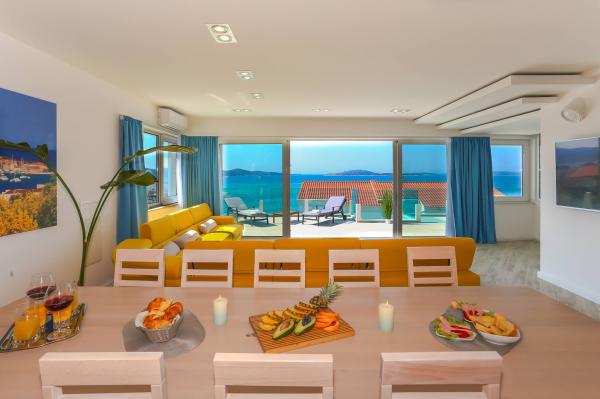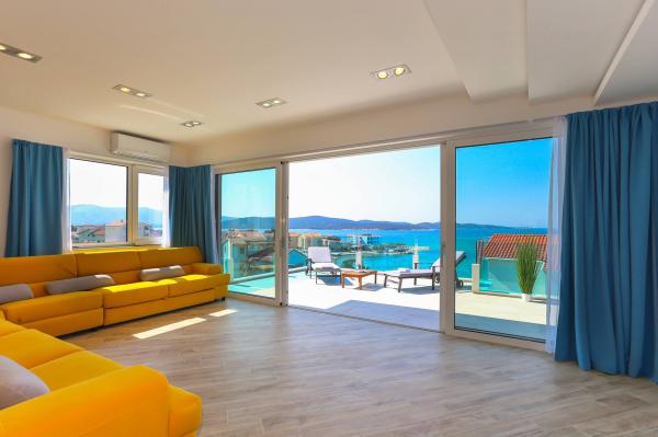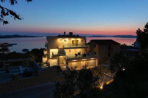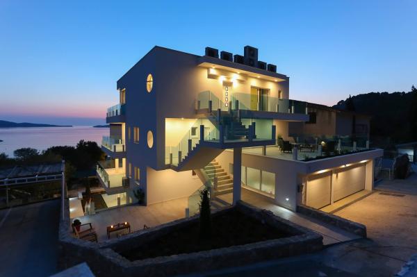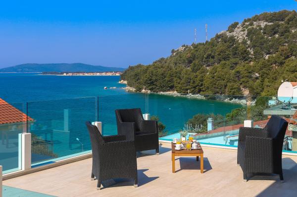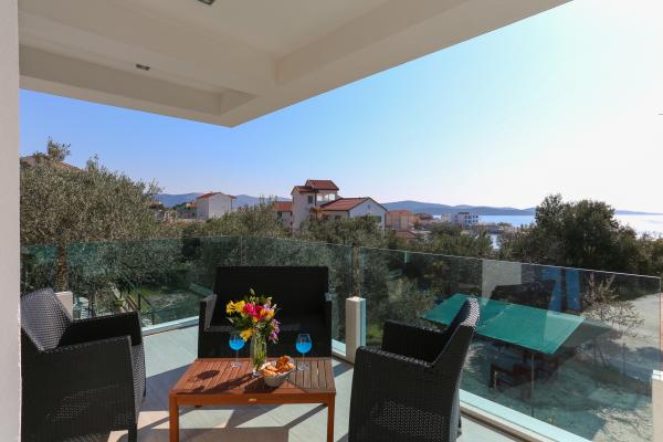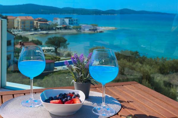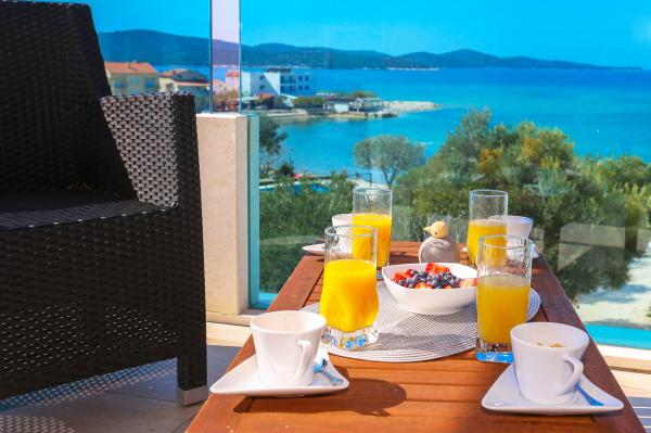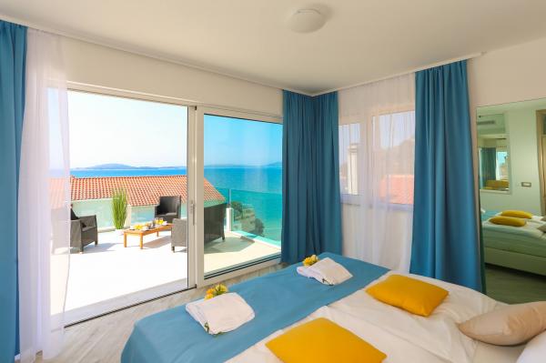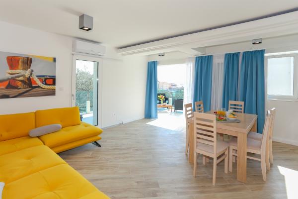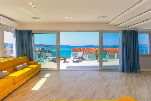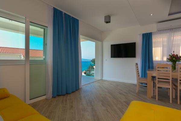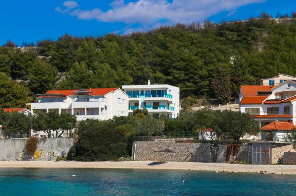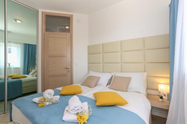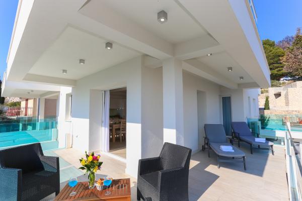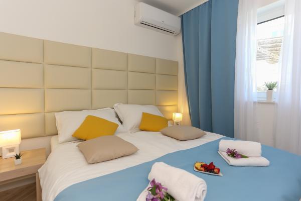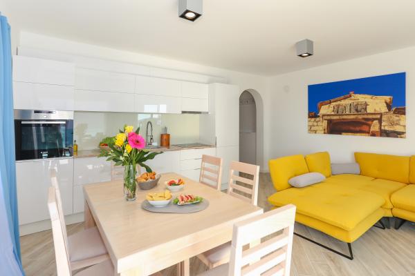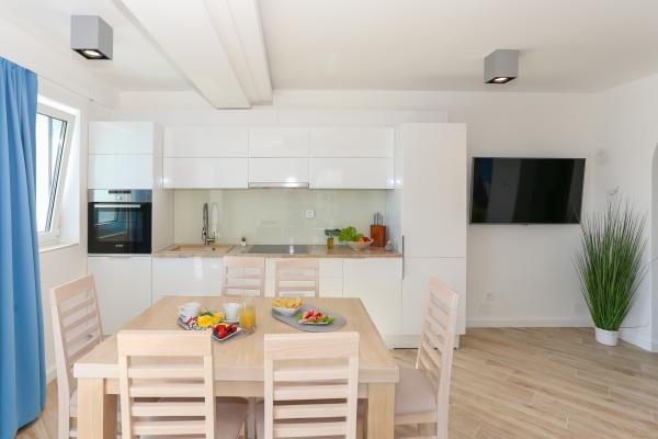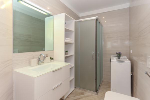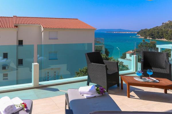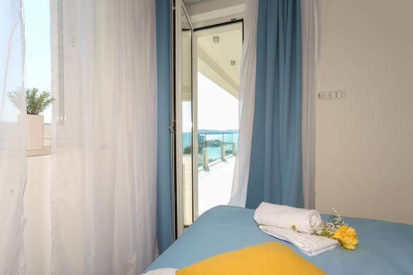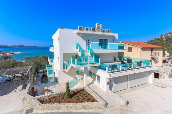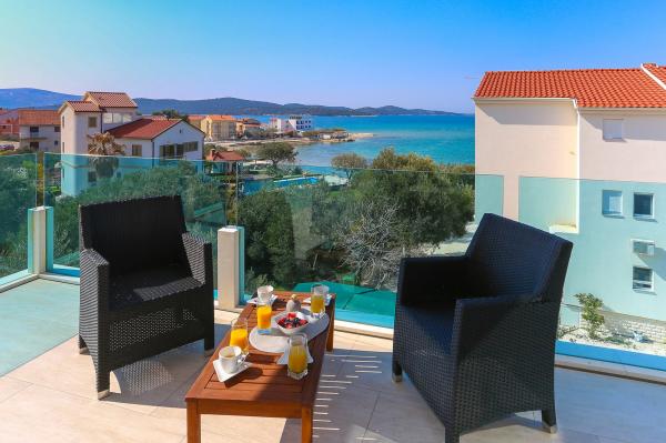 Villa Aqua contains five apartments which are fully equipped and modern. The first and second floor contains 4 apartments with kitchen, two bedrooms, bathroom and large terraces overlooking the sea. On the third floor is our luxurious pent house with two bedrooms, two bathrooms, kitchen, large living room and a terrace of 60 square meters. The rooms and living rooms in every apartment has air conditioning, a bathroom washing machine and a kitchen oven, dishwasher, modernized hob and full kitchen utensils. Each living room contains a smart android tv. Villa Aqua is located 20 m walk from the sandy beach and 50 meters from the cafe Africa, 300 meters from the cafe