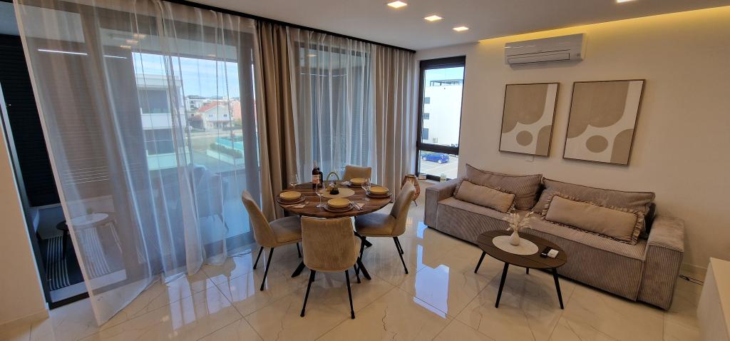 Ambiente Borik is a new seaside apartment offering the perfect blend of comfort, space and ambience. It is located in an exceptional location "Borik Zadar" near the well-maintained beaches and the Falkesteiner Hotel. The living room is spacious and bright, ideal for relaxing and socializing. The kitchen is fully equipped with all necessary appliances and cooking utensils. With two bedrooms, each equipped with comfortable beds and elegant furniture, and two bathrooms, it provides enough space to accommodate 2 couples or a group of up to 4 guests. The large terrace offers additional space for relaxing outdoors. On the terrace you can enjoy breakfast or an evening drink, with privacy and a quiet corner for relaxation. The apartment is luxuriously furnished with carefully selected details. There is also a private parking lot and a garage that ensure convenience and safety for guests arriving by car. In short, this seaside apartment offers everything you need for a comfortable stay. The elevator is a welcome addition after a tiring walk along the Zadar waterfront.