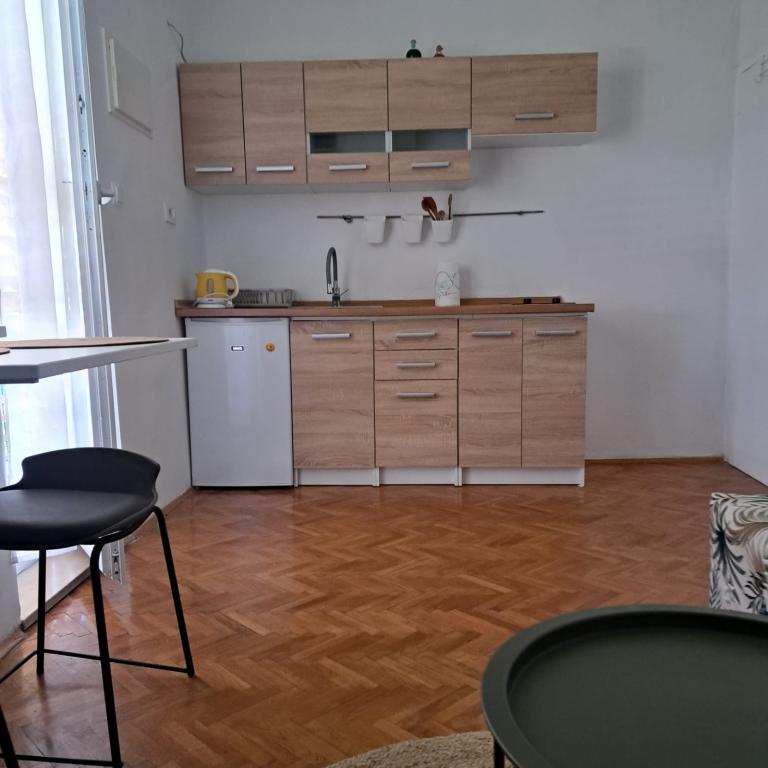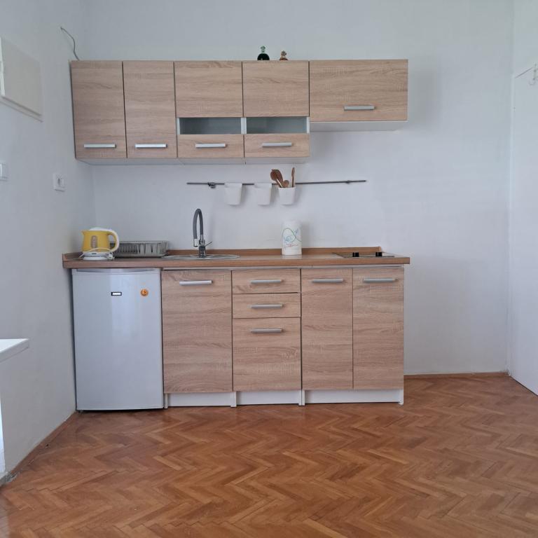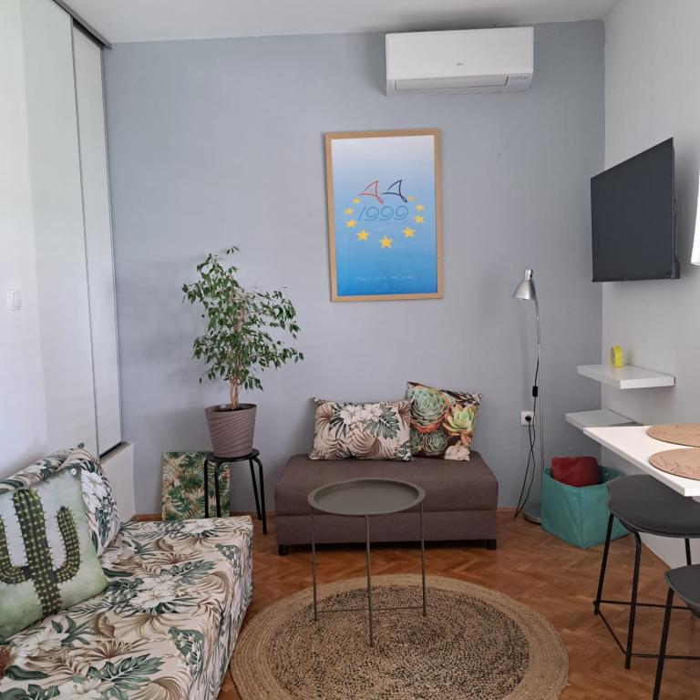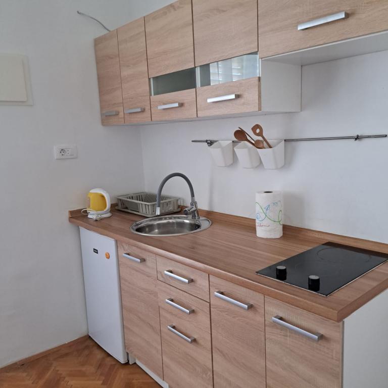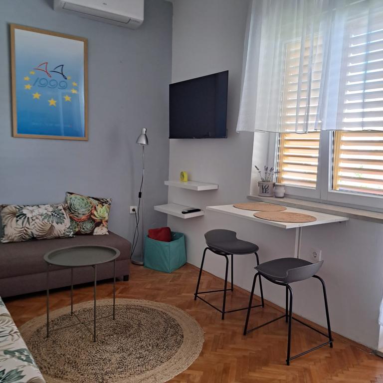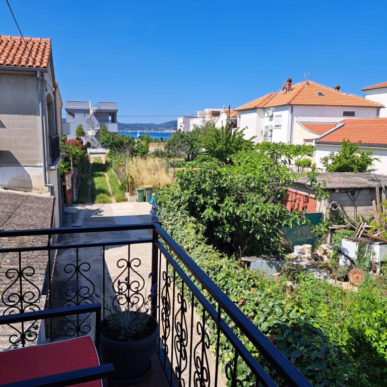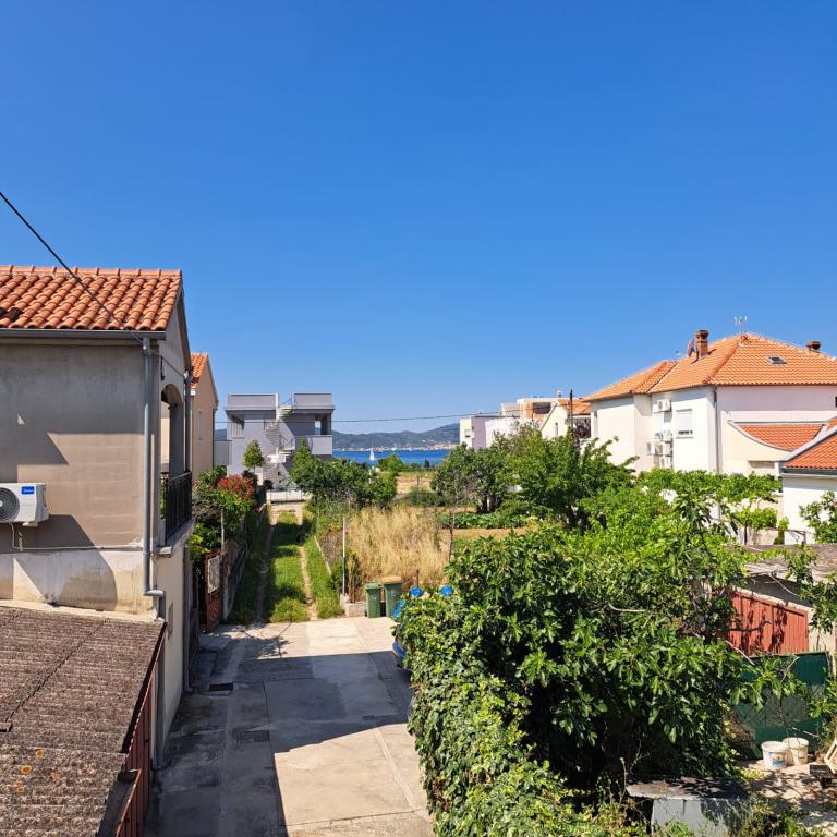 Fully equipped apartment in a quiet part of Zadar with a sea view. The building is located 300 meters from the sea and 400 meters from the nearest beach. The center is about 1 kilometer away, and the path to the center can be crossed by a wonderful walk (Karma and Kolovare) along the sea. The apartment is intended for two people, and consists of one bedroom with an exit to the balcony, a spacious living room with a kitchen and a bathroom (shower, washing machine...). There is a view of the sea from the balcony.