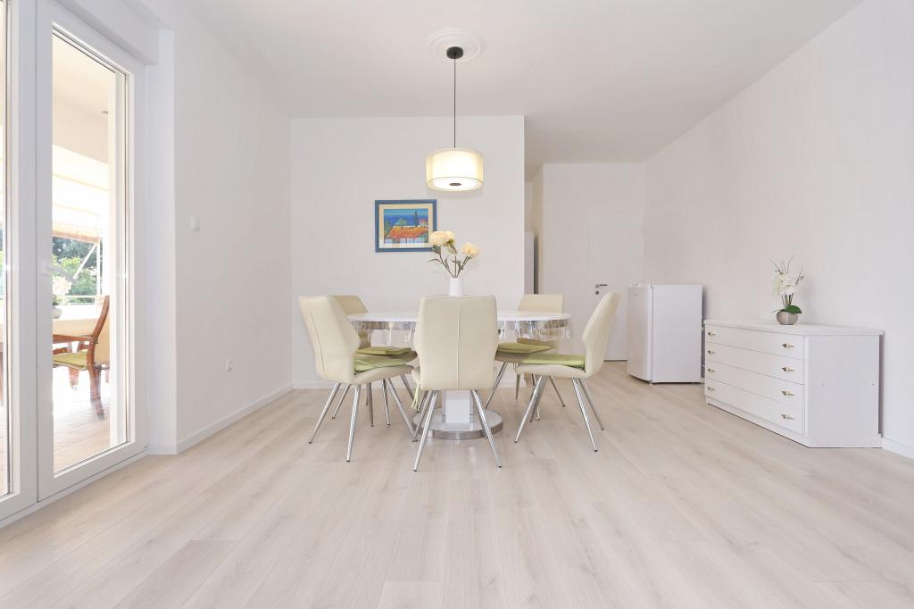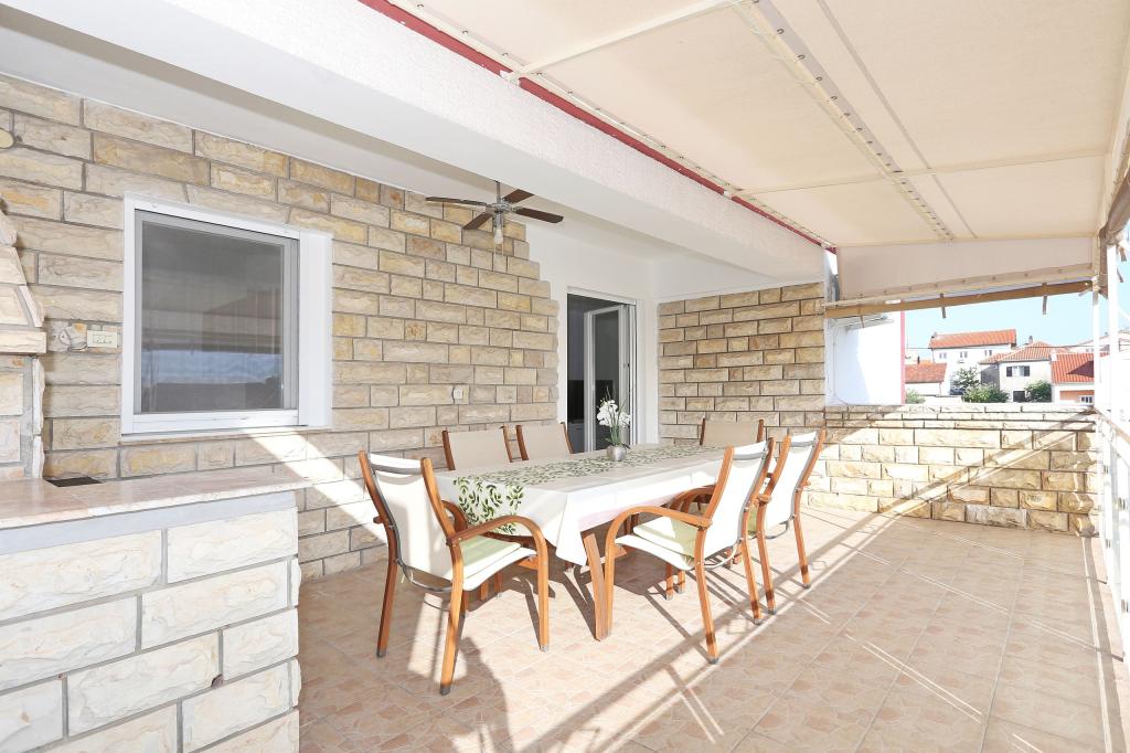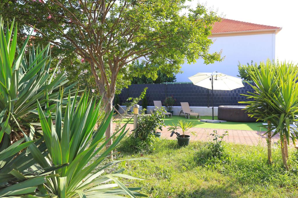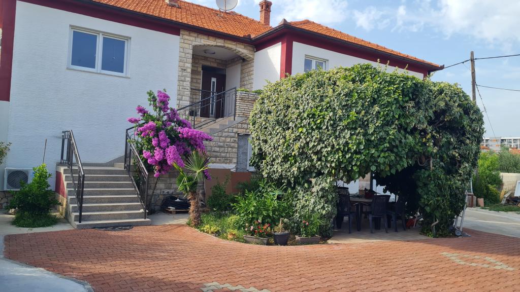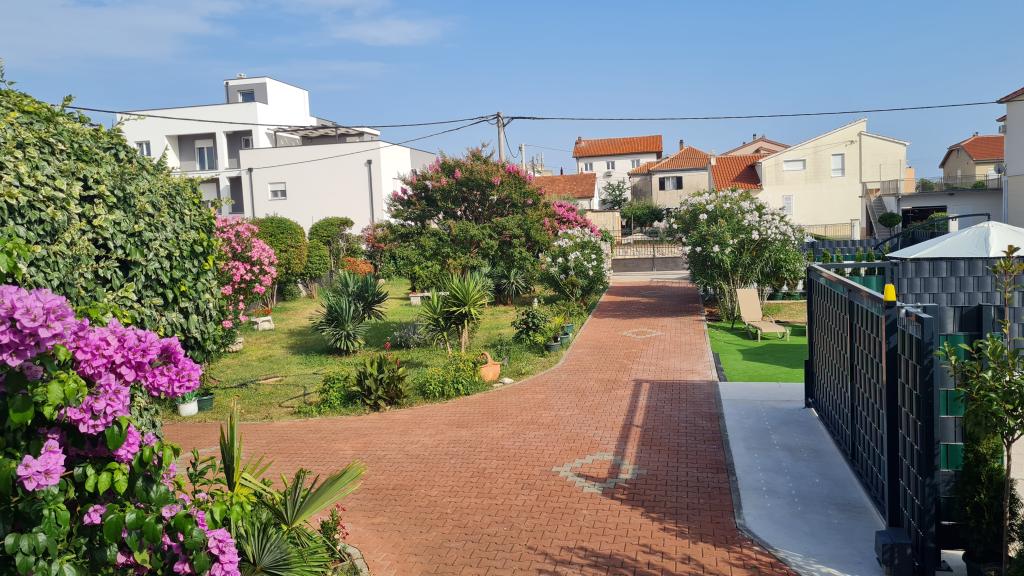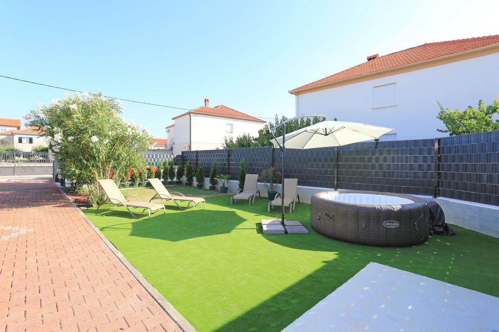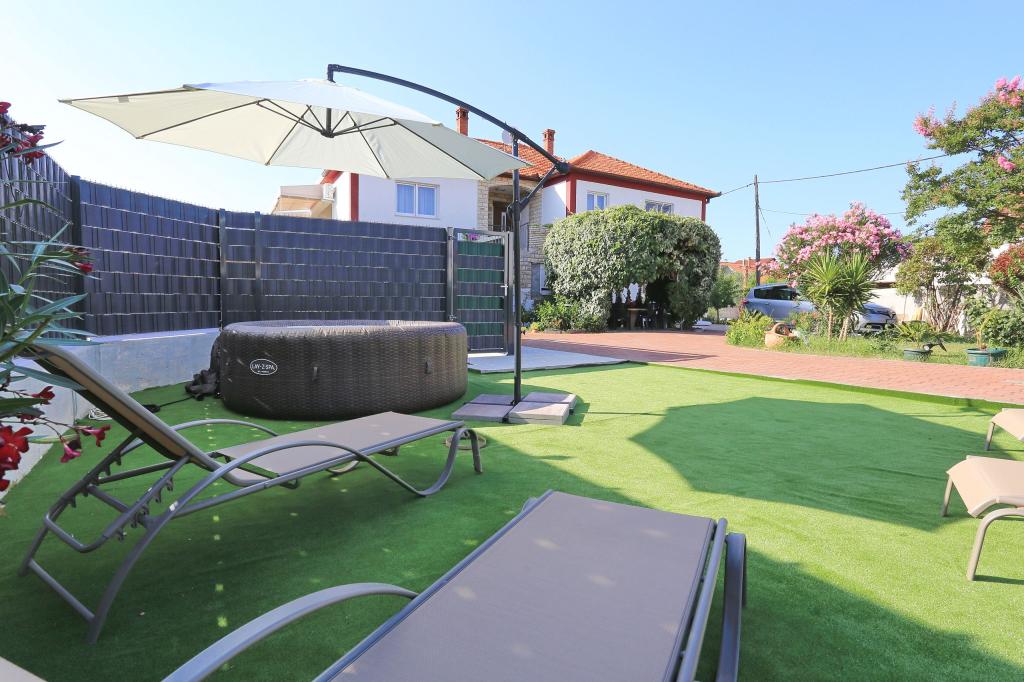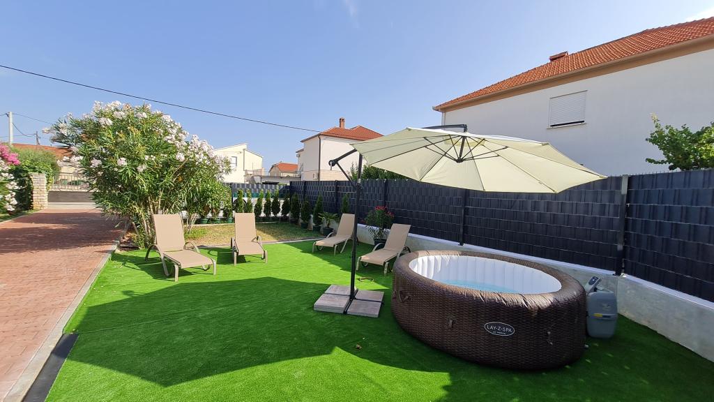 Apartment Green oasis Zadar is located in a quiet neighborhood, on the first floor of a family house that has its own park of 400 m2. The apartment has a surface of 140 m2. Within the apartment are also available: a jacuzzi in the park with sunbeds, a table for table tennis, and free private parking. The apartment is fully air-conditioned and has free WIFI. The space of the apartment is organized into 3 bedrooms and a living room. In two rooms there are double beds with the possibility of an additional bed, and one single room. In the living room there is a couch that is also a comfortable bed for two people. The apartment has two fully equipped bathrooms, an equipped kitchen with a refrigerator and freezer, and a large pantry with a desk. This comfortable apartment also has a terrace of 25 m2, with a large table and barbecue.