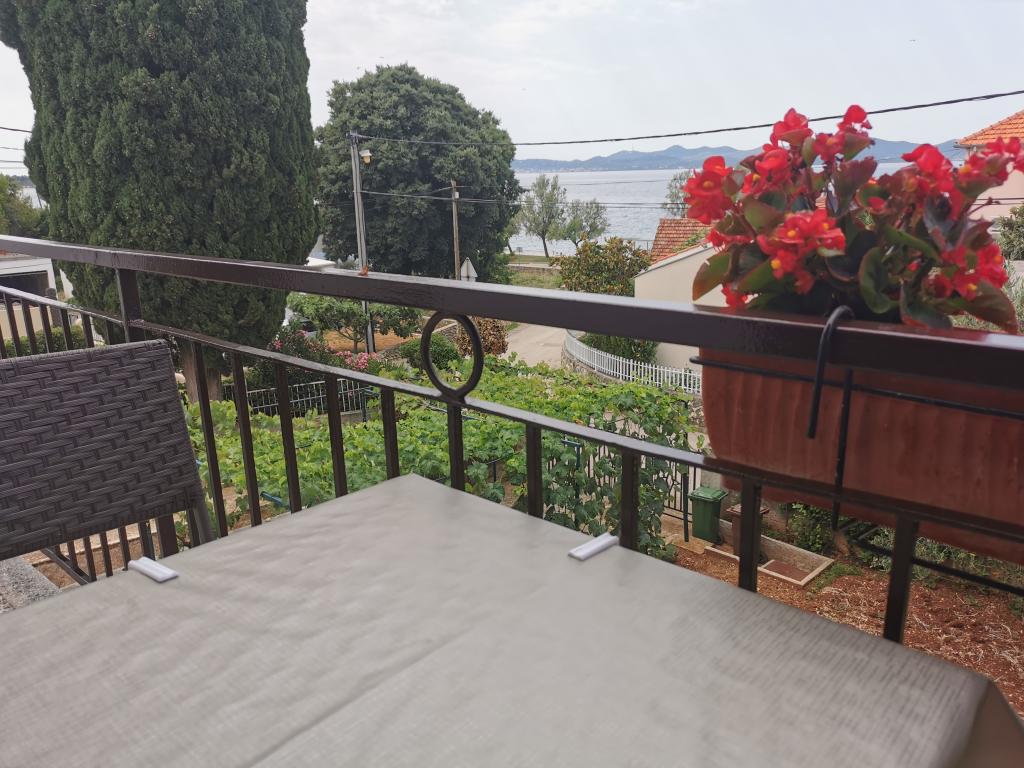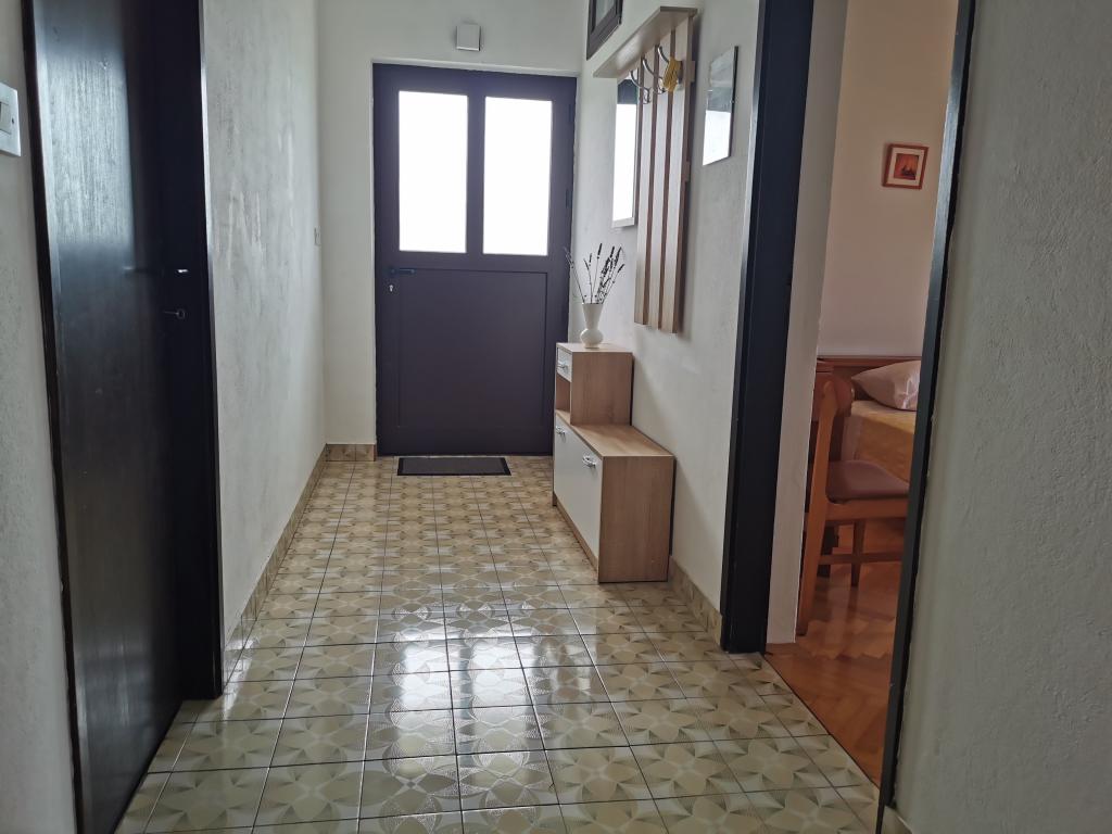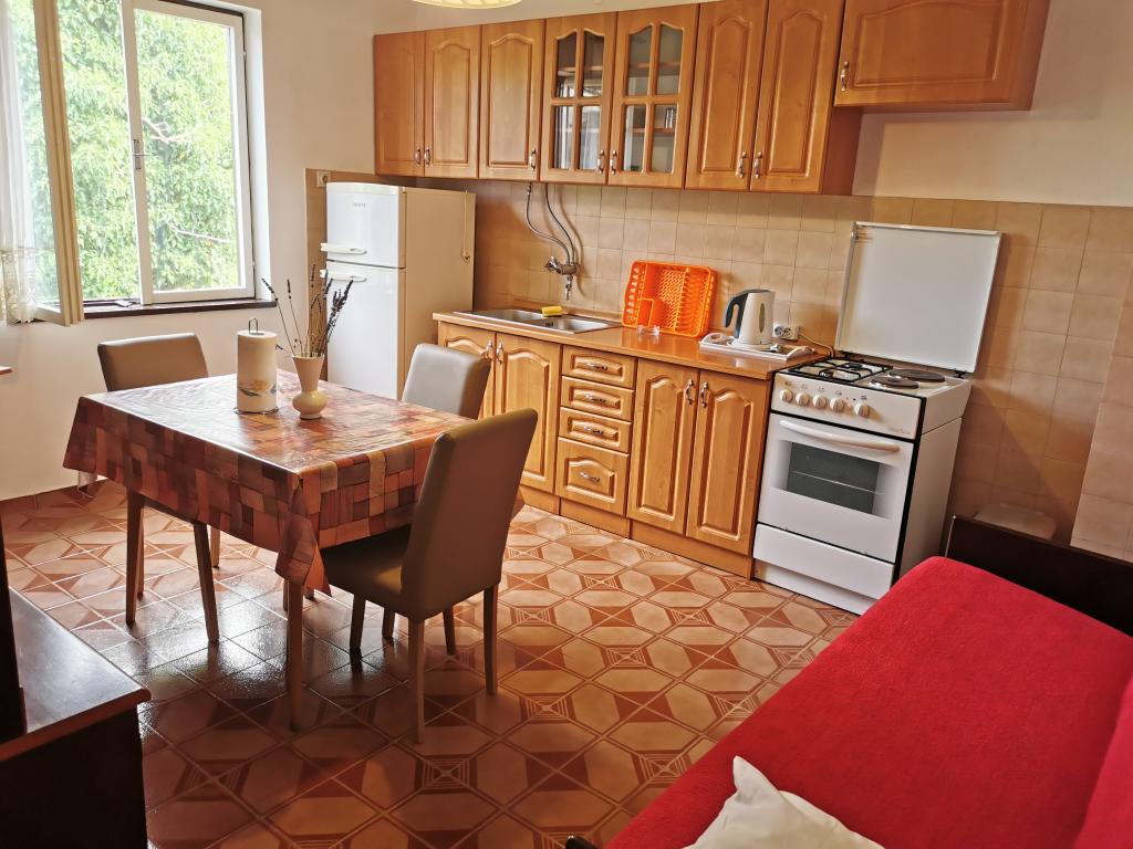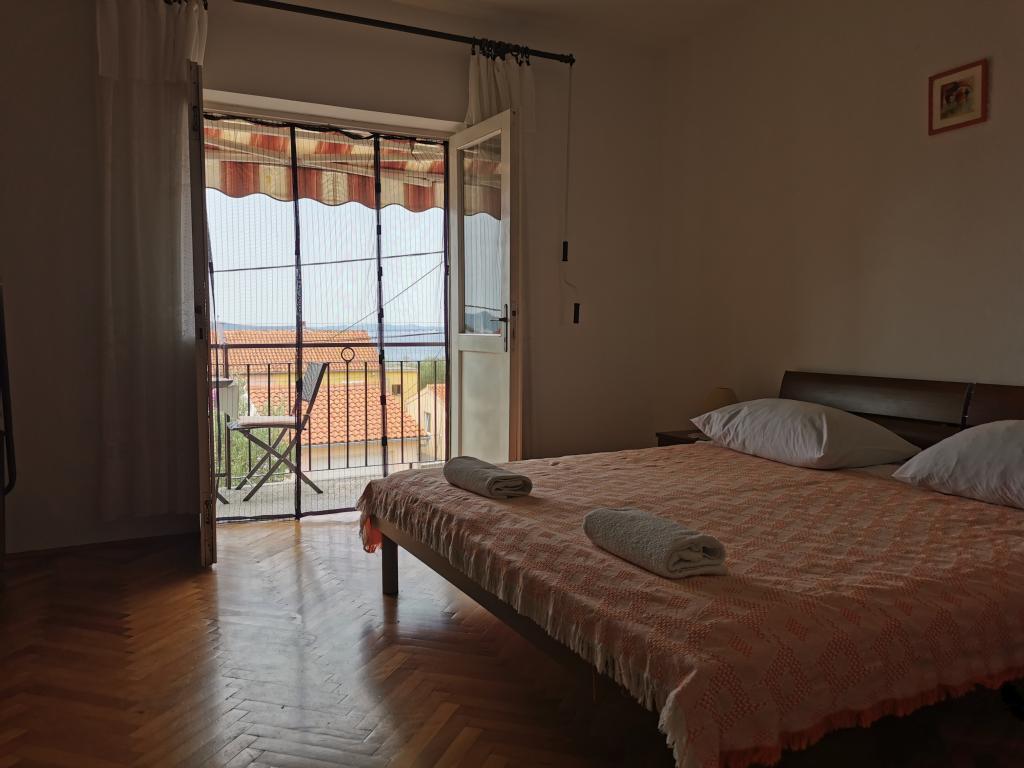 Apartment for up to 5 people on the first floor of a family house in a quiet part not far from the city. Two bedrooms with double beds and an extra bed in the dining room. Kitchen, bathroom and large terrace with sea view. Free parking for apartment guests. Ideal for two married couples or a family with children.