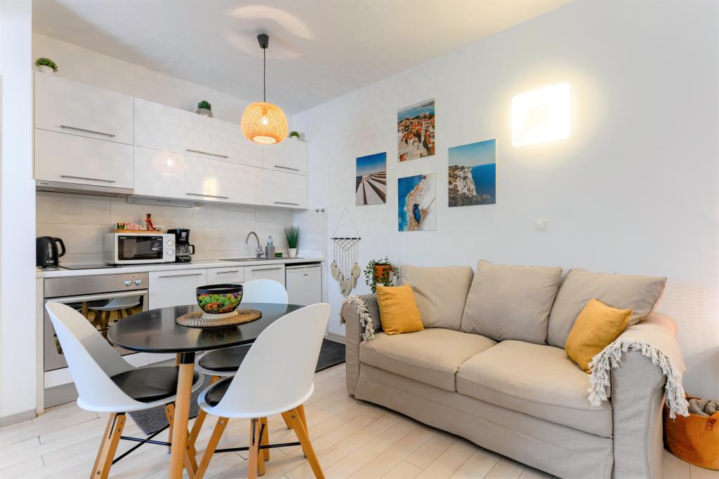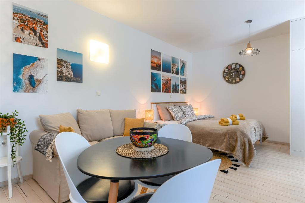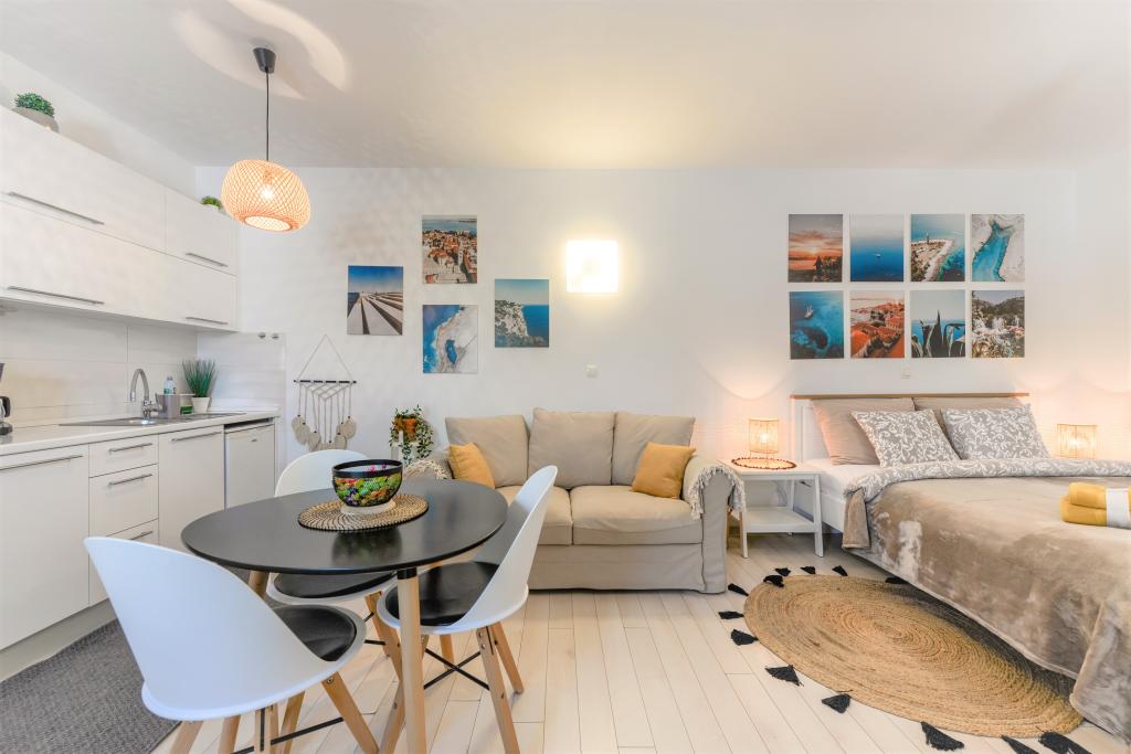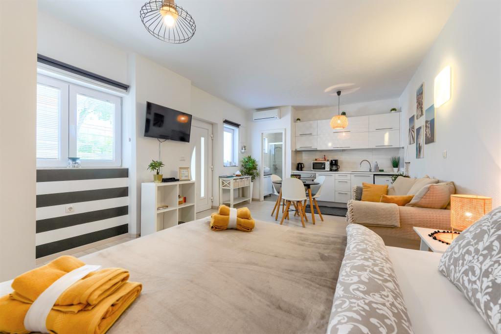 Studio Mare is located in the area of Zadar called Brodarica. The apartment itself is located about 500 meters from the sea, and in the immediate vicinity there are excellent restaurants (Mamma Mia, Roko, Rafaelo...) as well as cafes, a shop, a pharmacy and tennis courts for recreation. Guests have access to air-conditioned accommodation with a terrace and free parking. Inside the apartment there is everything guests need for a pleasant stay. Smoking is not allowed in the premises, but the terrace is always available for that. Also, the city center is 15 minutes away on foot, which is also a great reason to walk along the sea to one of the most beautiful symbols of the city of Zadar, the barge, which in just a few strokes of our rowboats transports you to the very heart of the city and the famous sights that Zadar has to offer.