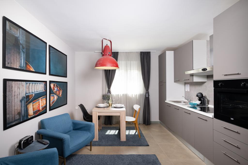 The accommodation was very spacious (living room, kitchen, bedroom, balcony), the kitchen very well equipped - thank you for the welcome lemonade - very clean and well-kept, with attention to details. All around the beach was pebbled, larger or smaller - approximately 3 minutes' walk away. You could rest very well - it was quiet, being a neighborhood of villas around.