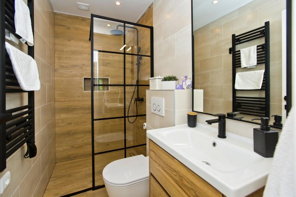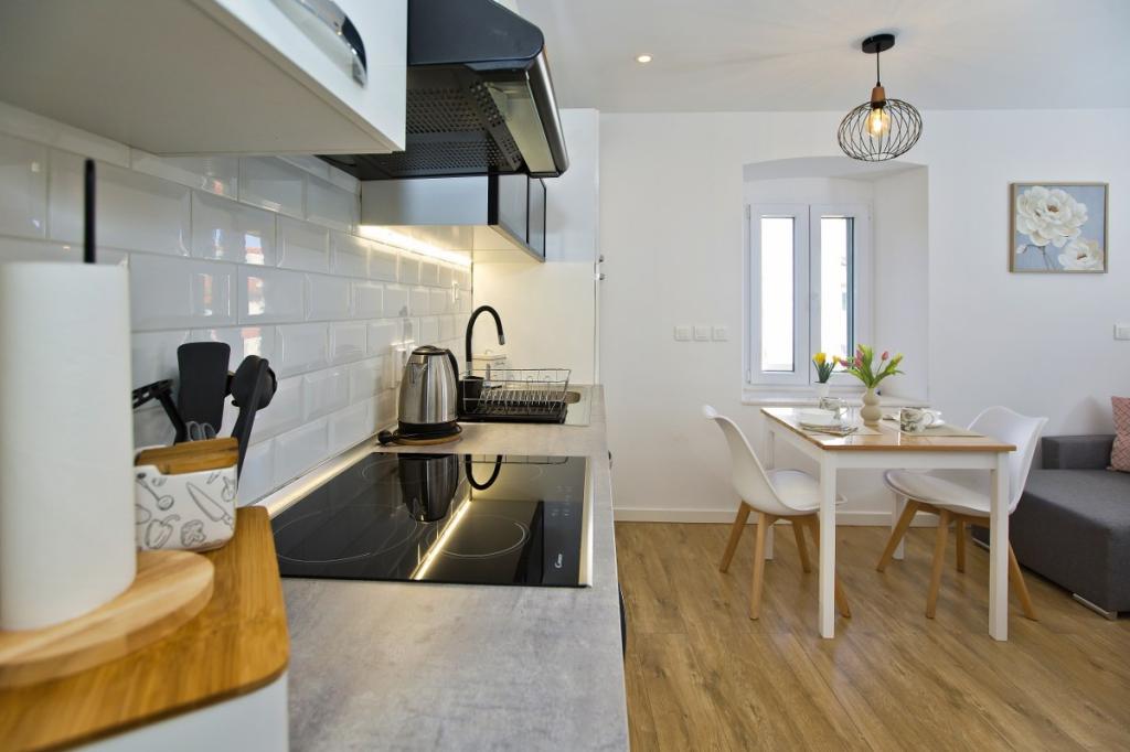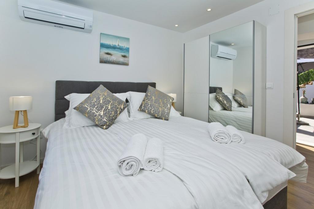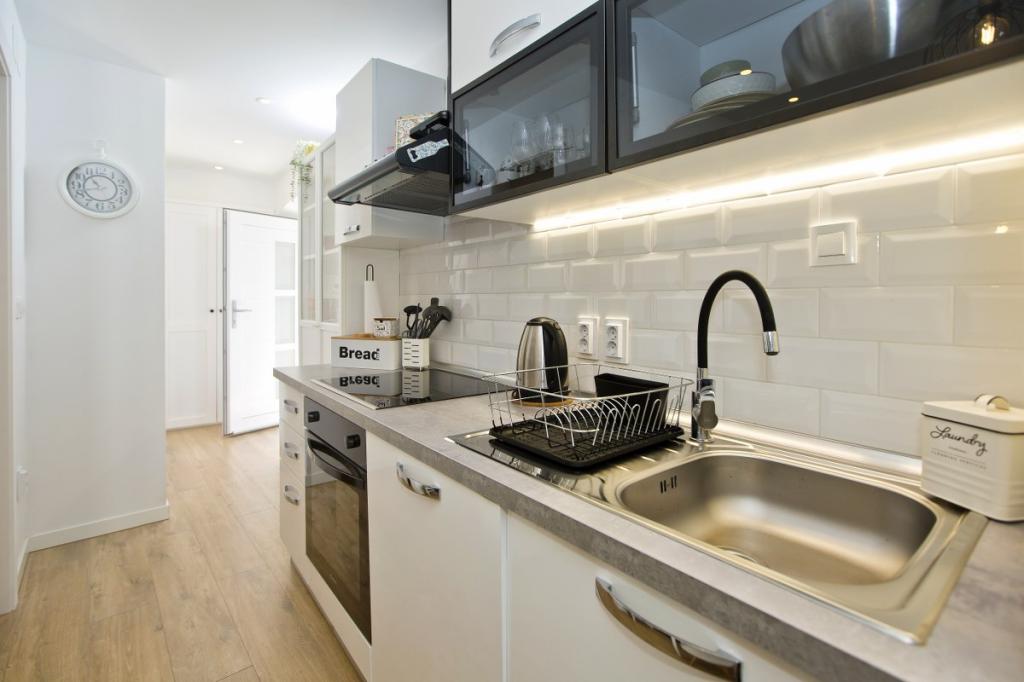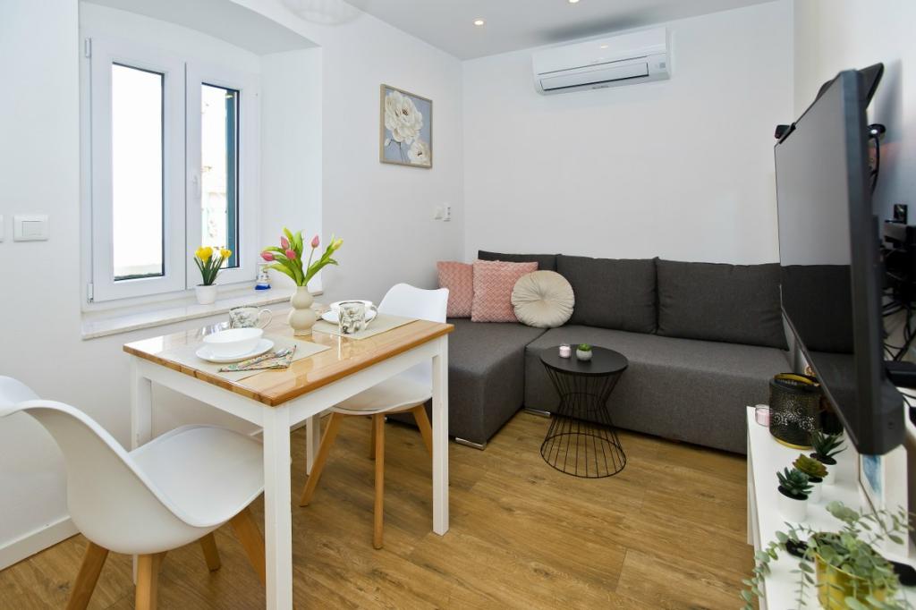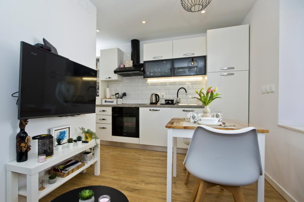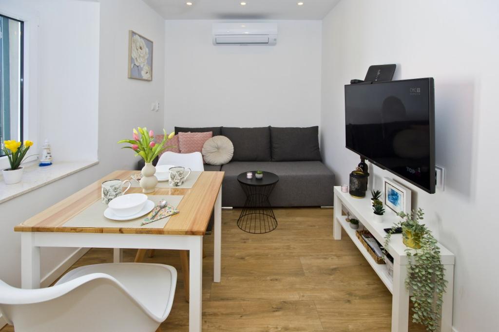 The house consists of an apartment of 30 m2 and a yard of 20 m2. The apartment consists of a bedroom, bathroom, living room with kitchen and a small storage room. The room has a beautiful view and has a double bed under which there is a luggage storage box of 160x200 cm. There is also a large wardrobe with sliding doors, two bedside tables with lamps and air conditioning. The bathroom has a shower, radiator, fan, sink and toilet. The living room with a window and the kitchen are connected. The living room has air conditioning, a sofa, TV, kitchen table with chairs. The kitchen consists of an oven, hob, dishwasher, refrigerator, microwave, water heater and toaster. In the small storage room there is a washing machine, boiler and shoe rack. The yard is intended for socializing and relaxing and there is a sun lounger, parasol, chairs and a yard set. This is an apartment located on the first floor of the family house and in front of it is a large yard.