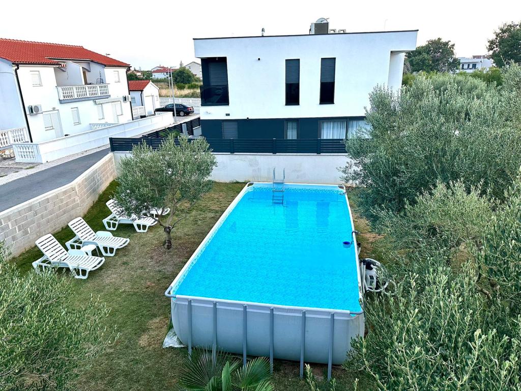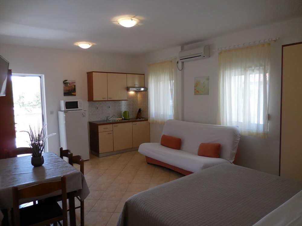 We offer 5 comfortable apartments, fully equipped, surrounded by a large garden of approx. 2250 m2, in olive groves, in a quiet area of Zaton. The property is approx. 100 m from the sea and the same distance from the first, nearest sandy beach, approx. 100 m. The beaches are mostly sandy and pebble, but there are also concrete and rocky ones. The distance from the entrance to the Holiday resort Zaton is less than 100 m. All apartments are air-conditioned, TV, satellite, the price also includes Wi-Fi, bed linen, towels, the possibility of using a barbecue and a canopy with garden furniture in the yard. Secured parking spaces in the yard. Each apartment has its own separate entrance, its own terrace. Our guests have at their disposal a large swimming pool, a trampoline and a children's playground.