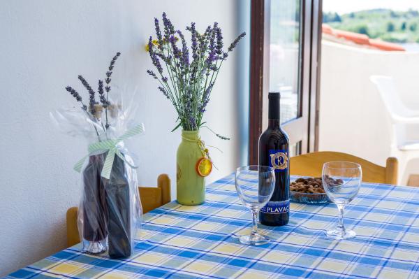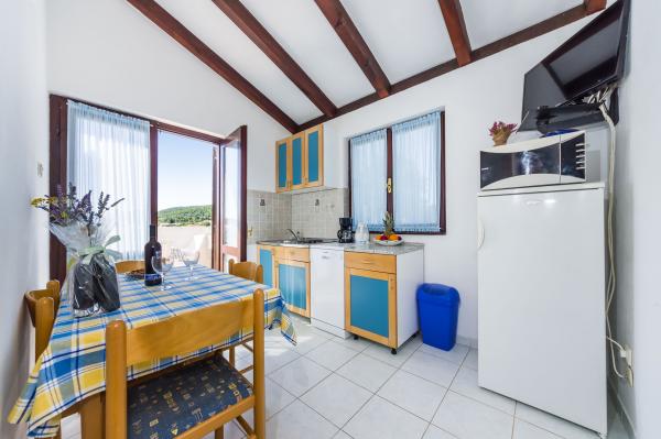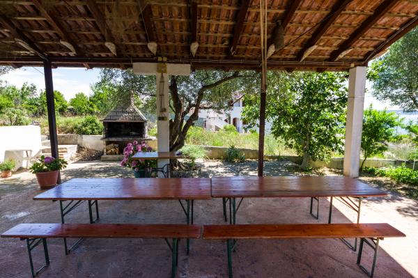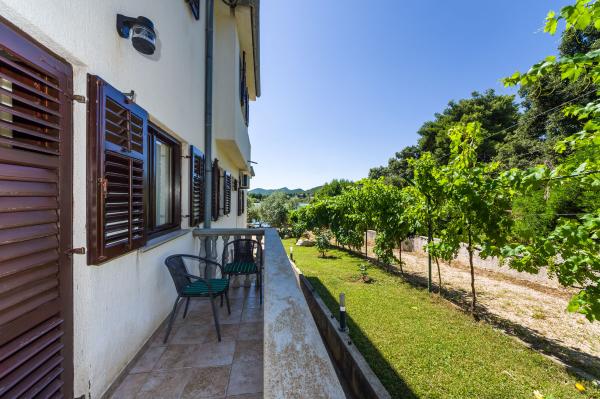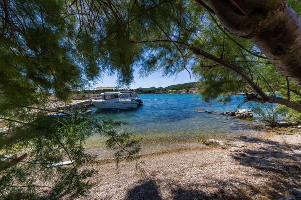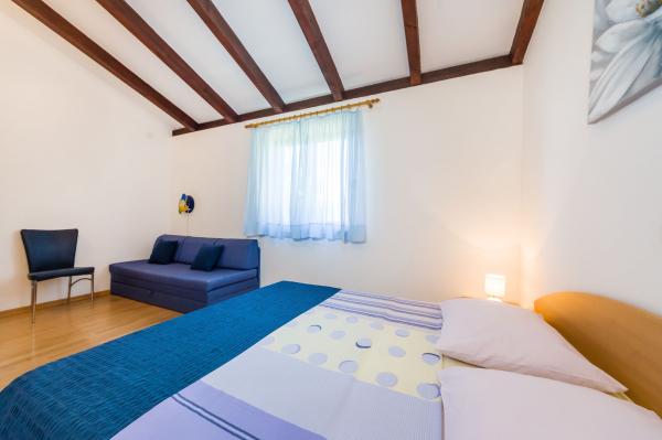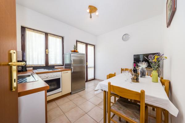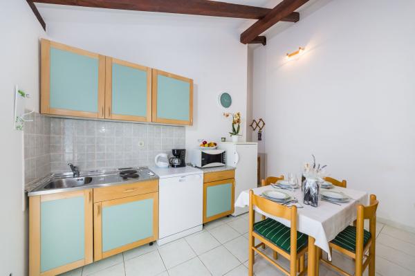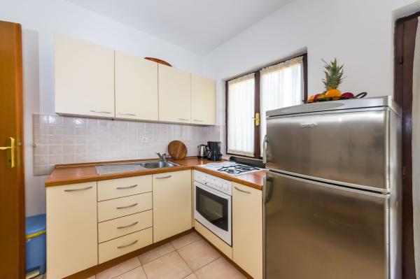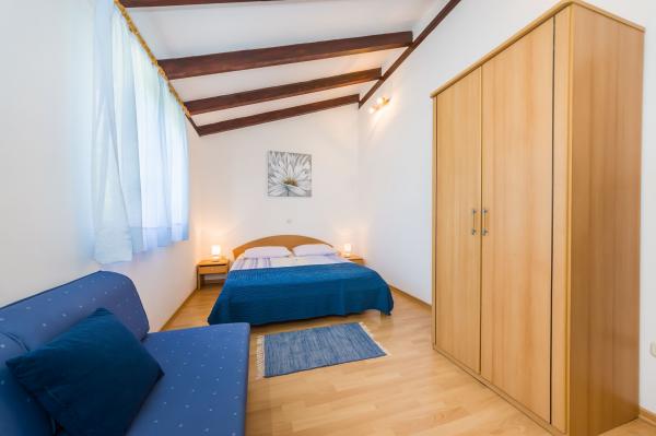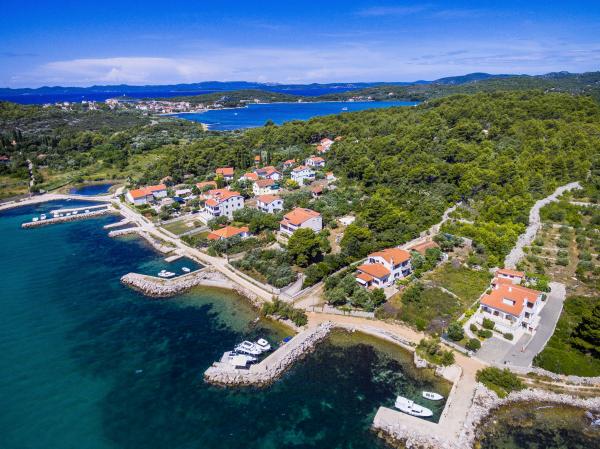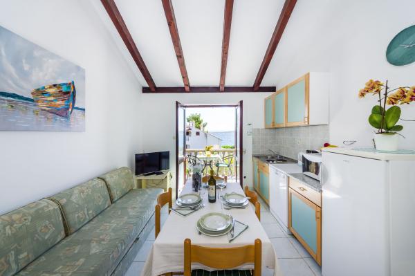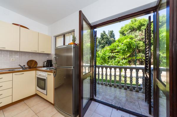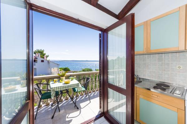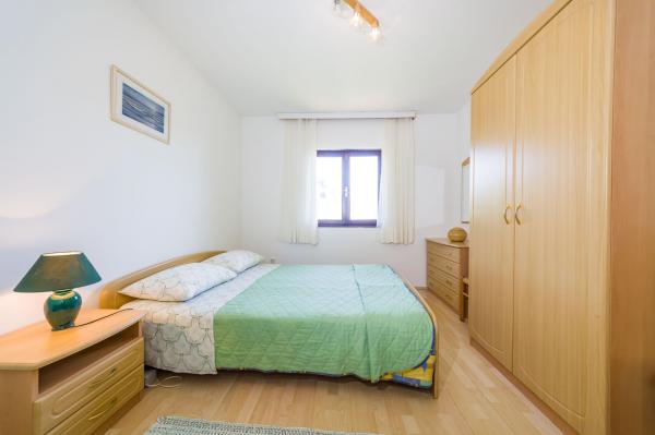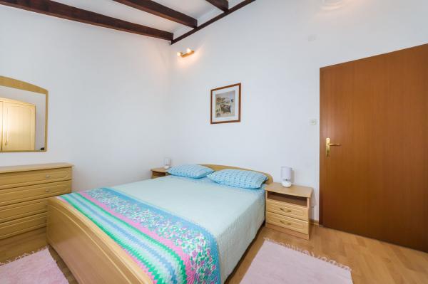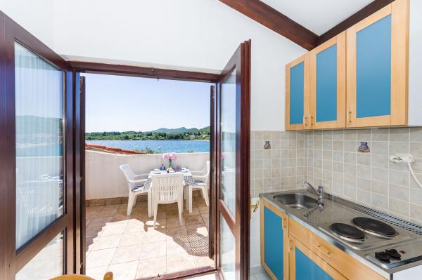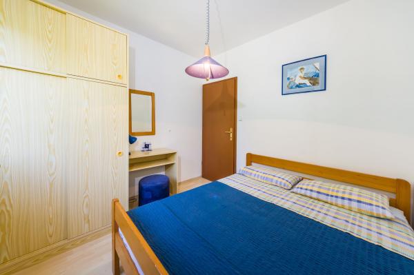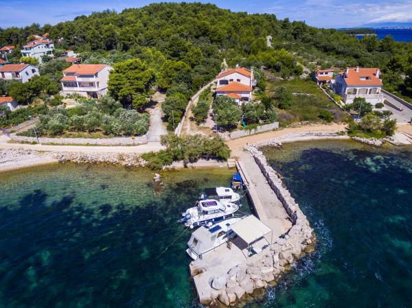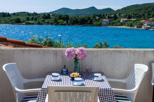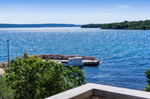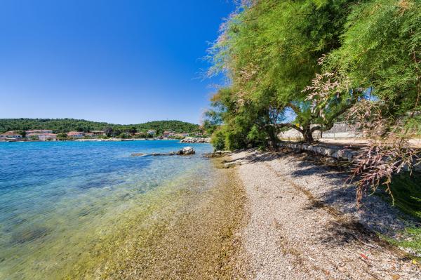 Fully equipped apartments, air conditioning, satellite TV, internet, ..... Located in a quiet bay, FIRST ROW TO THE SEA. In the yard there is a barbecue with a large terrace for pleasant family gatherings. The yard is suitable for children, with a slide and swing. . Parking is provided in the yard. , In front of the house there is a beach, suitable for small children. From the yard you are directly on the beach. The beach is with small pebbles and has natural shade. The other beach, which is partly sandy, is 150 m away. In front of the building there is a waterfront (pier), so it is possible to use a berth for a small boat. Smaller shops and cafes are 150 m away. Restaurant with fish specialties is 300 m away. To the town center you need a 15 minute easy walk, where there is a restaurant, patisserie, market, market, post office ..... WELCOME!!
